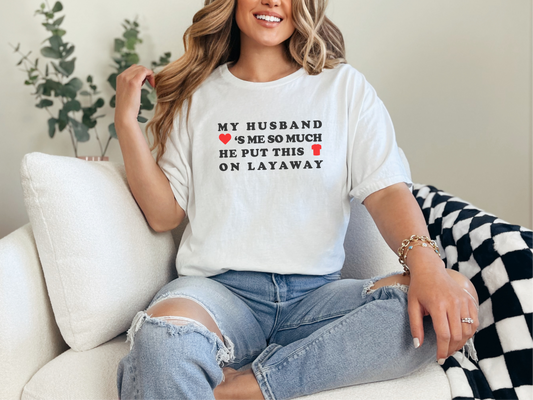 My Husband Loves Me Layaway Funny T-Shirt | Witty Marriage Humor Wife Gift Graphic Tee