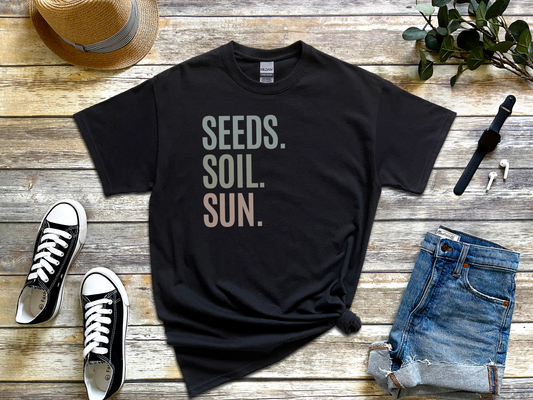 Seeds. Soil. Sun. Gardening Trinity Plant Lover Green Thumb Tee