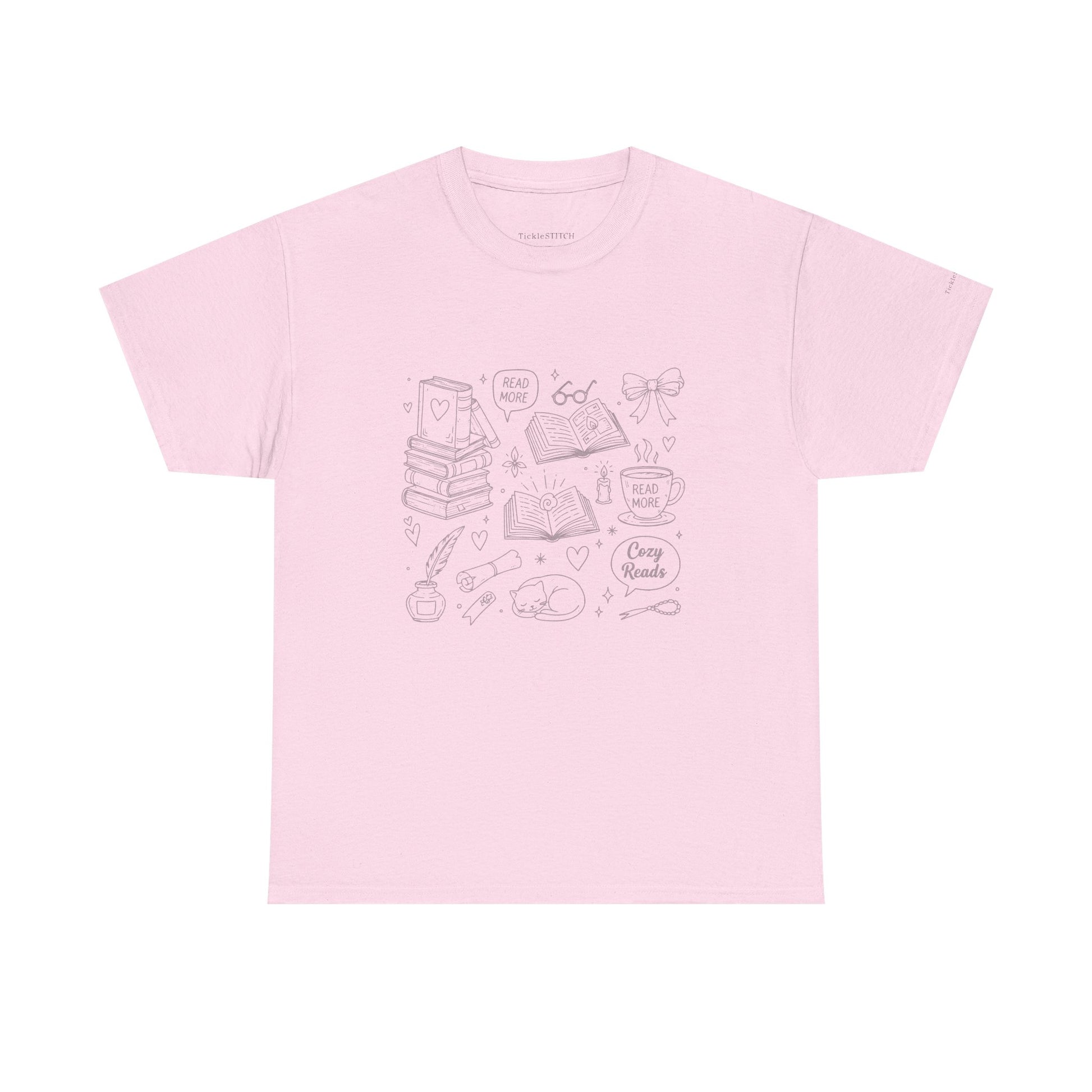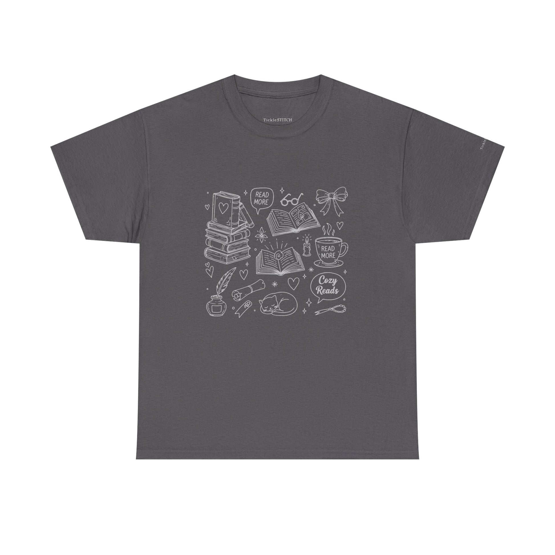 Indulge in the ultimate comfort with our 'Cozy Reads Books Coffee Cats Tee', a perfect book lover gift for anyone who cherishes quiet moments This unique design captures the serene essence of a reading nook, featuring a charming hand-drawn book stack, a steaming cup of coffee or tea, and a peacefully sleeping cat It’s an ode to the literary aesthetic and slow living, ideal for bibliophiles and those who appreciate the simple joys of life.