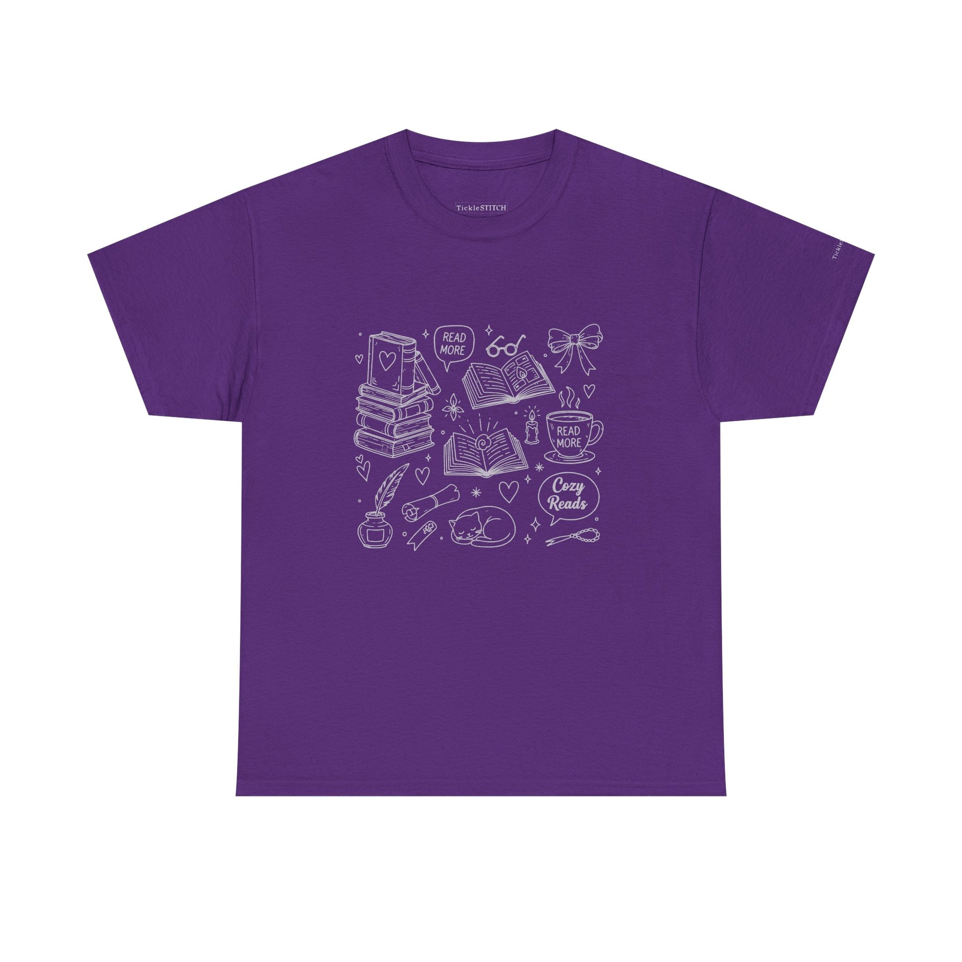 Imagine curling up with your favorite novel, a warm beverage, and the gentle purr of a feline companion – this shirt embodies that very feeling The intricate bookish doodles, complete with reading glasses and a quill and ink, add a touch of vintage charm, making it a truly special piece of bibliophile art Whether you're a devoted reader, a cat enthusiast, or simply someone who enjoys a cozy hobby, this tee is designed to bring warmth and style to your wardrobe.