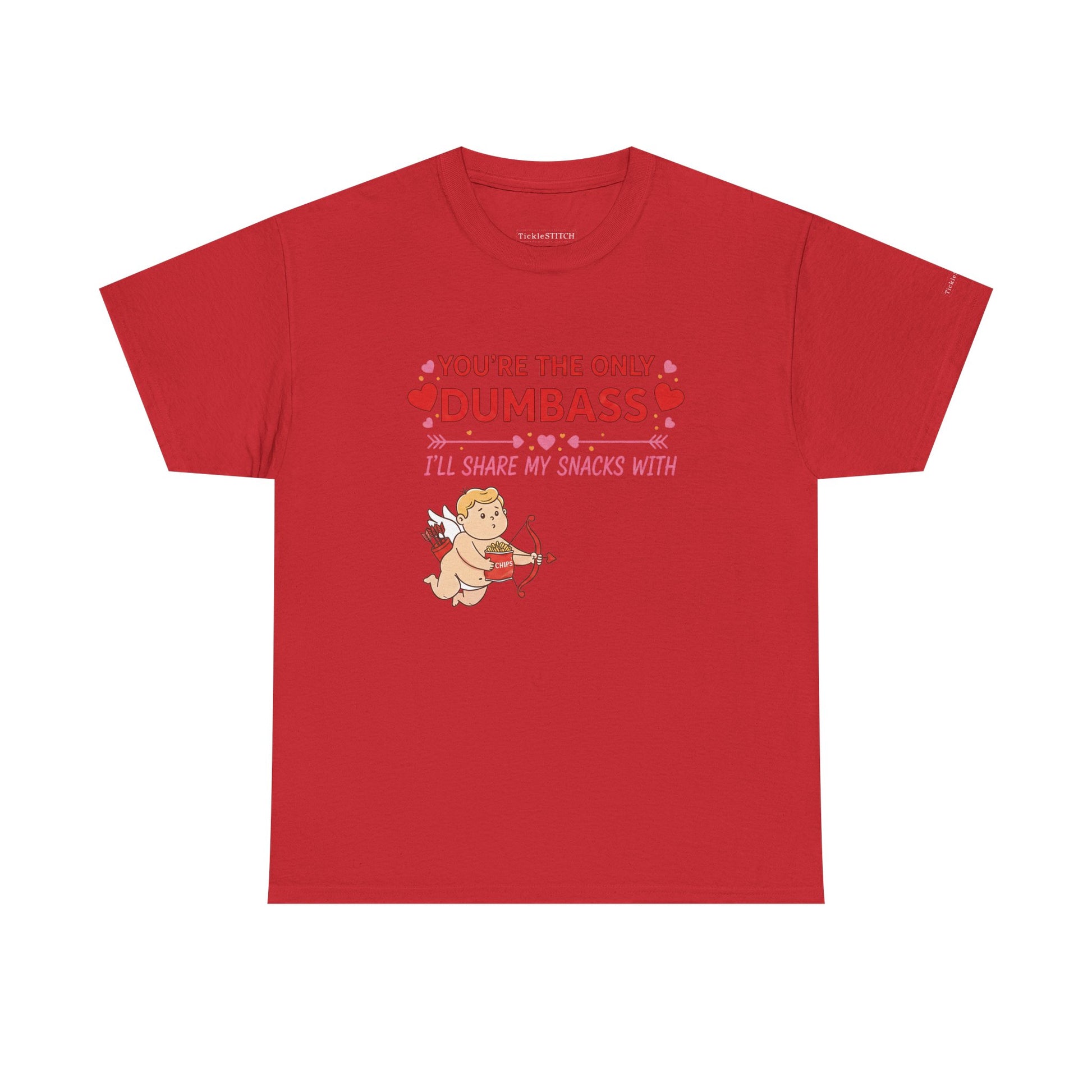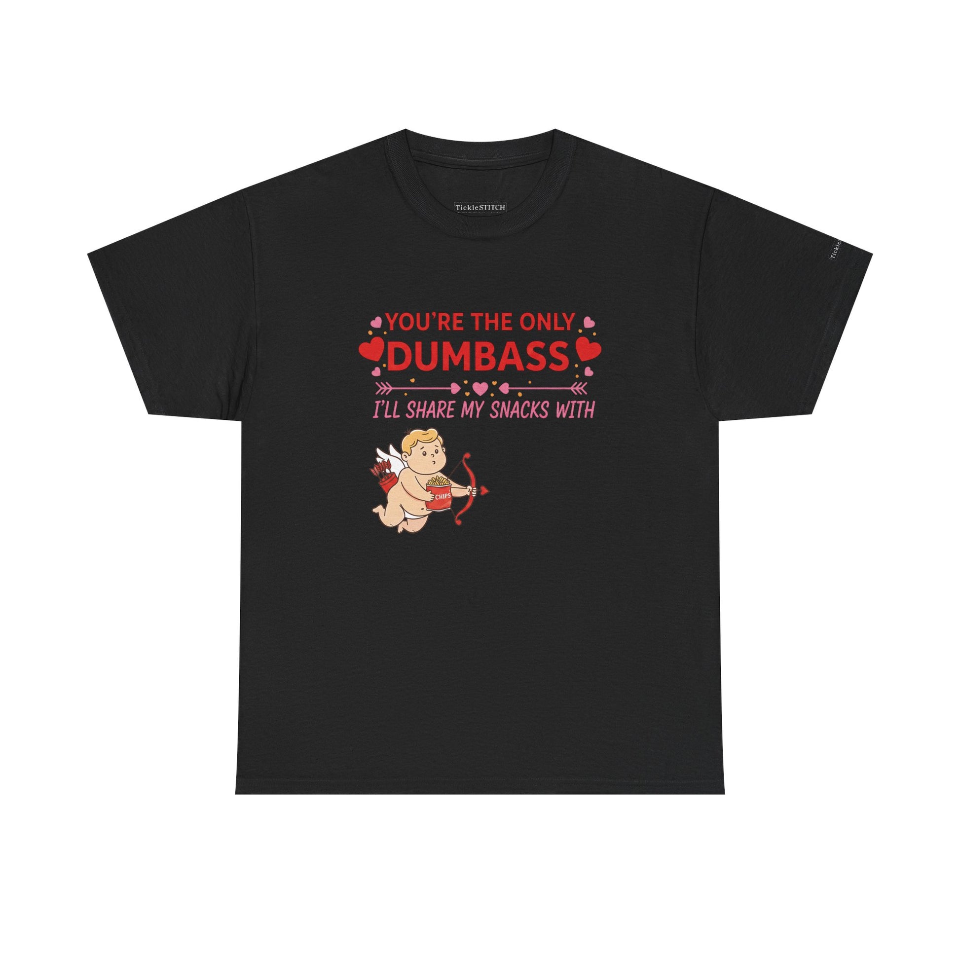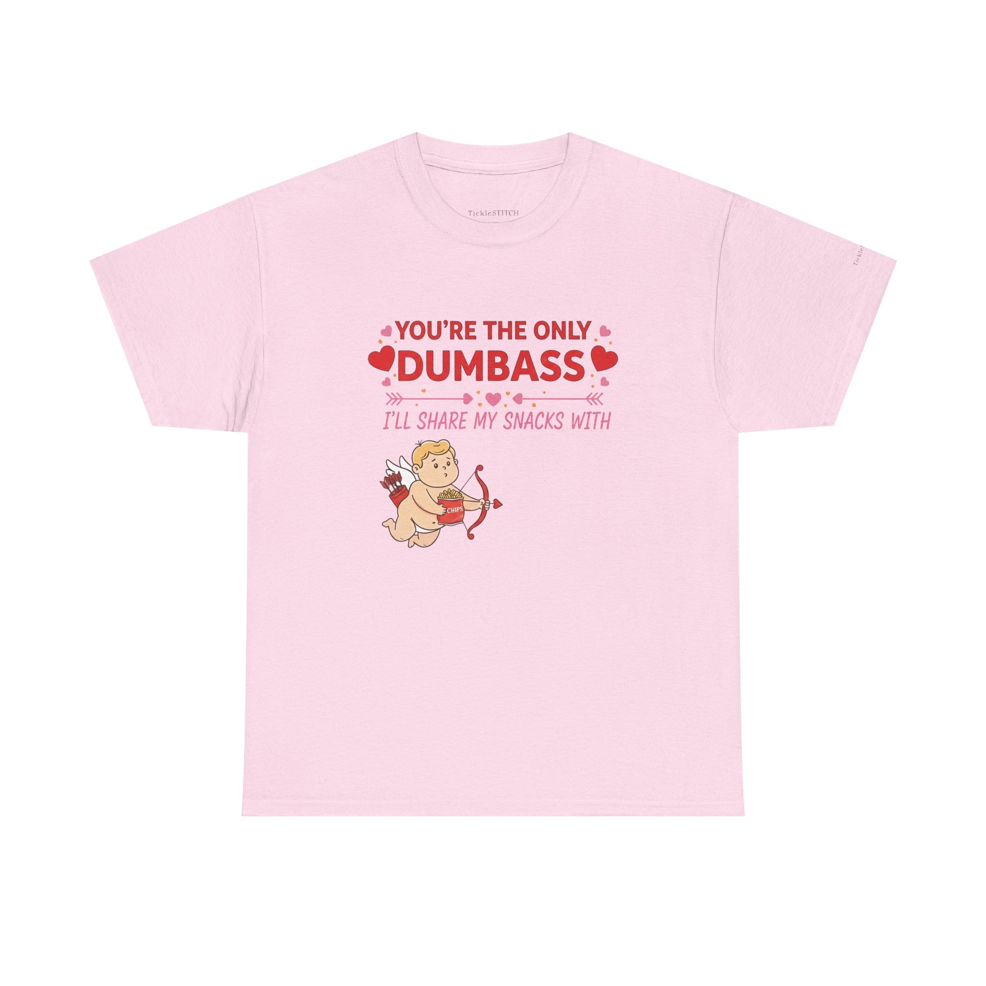 This unique Valentine's Day design perfectly captures that special, smitten feeling for the one you're head over heels for, especially if they're the only "dumbass" you'd ever consider sharing your precious snacks with Featuring a playful cupid motif and a heartwarming, humorous message, this item is an ideal gift for boyfriends, girlfriends, or any partner deeply in love and looking for a funny, lighthearted way to express their affection The vibrant red and pink hues, combined with soft, romantic colors, create a loving aesthetic that's perfect for celebrating St.