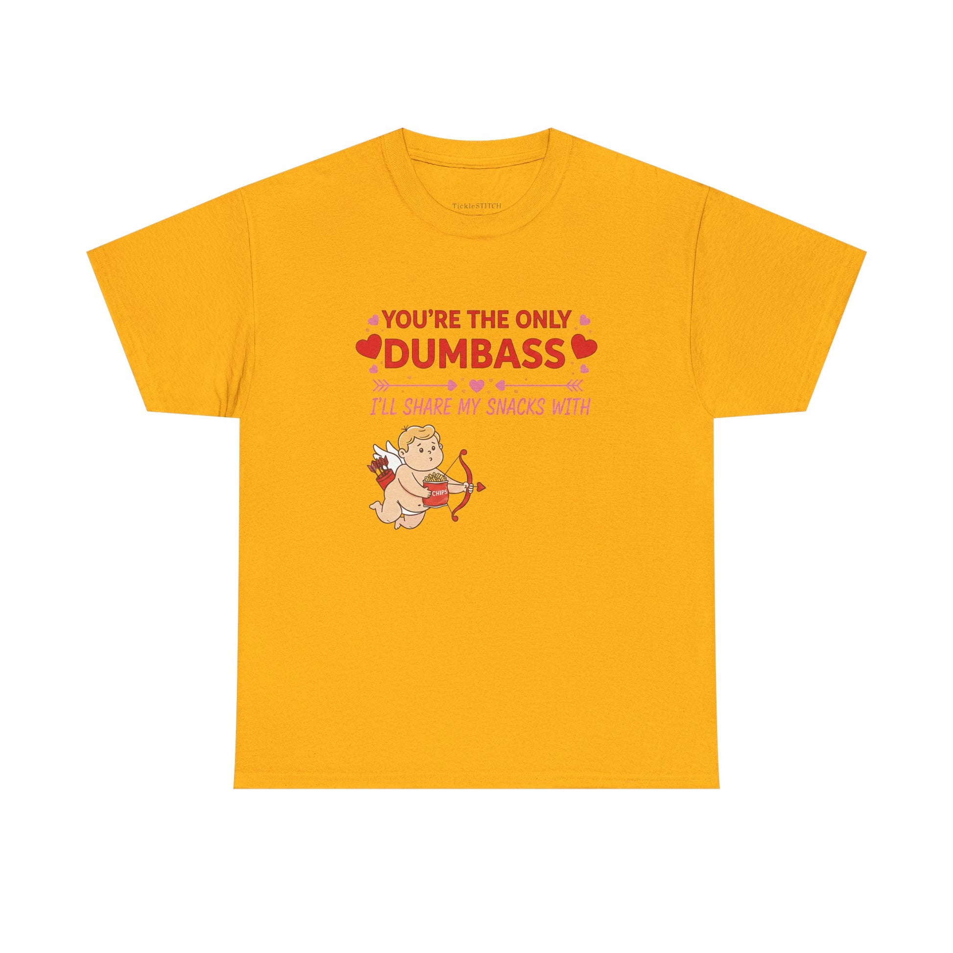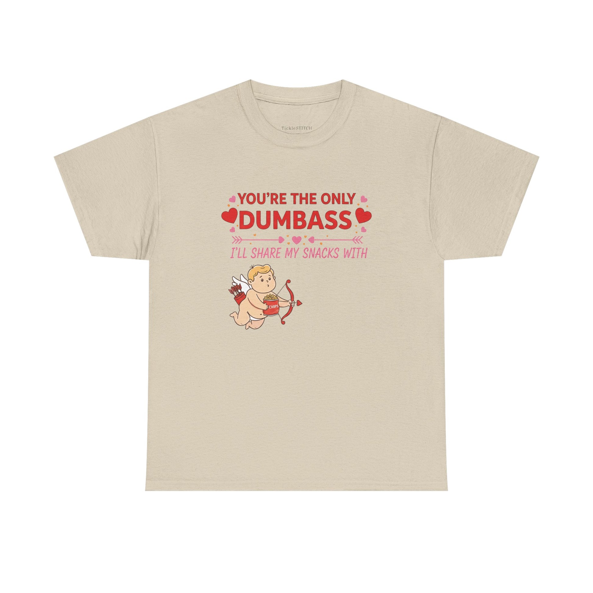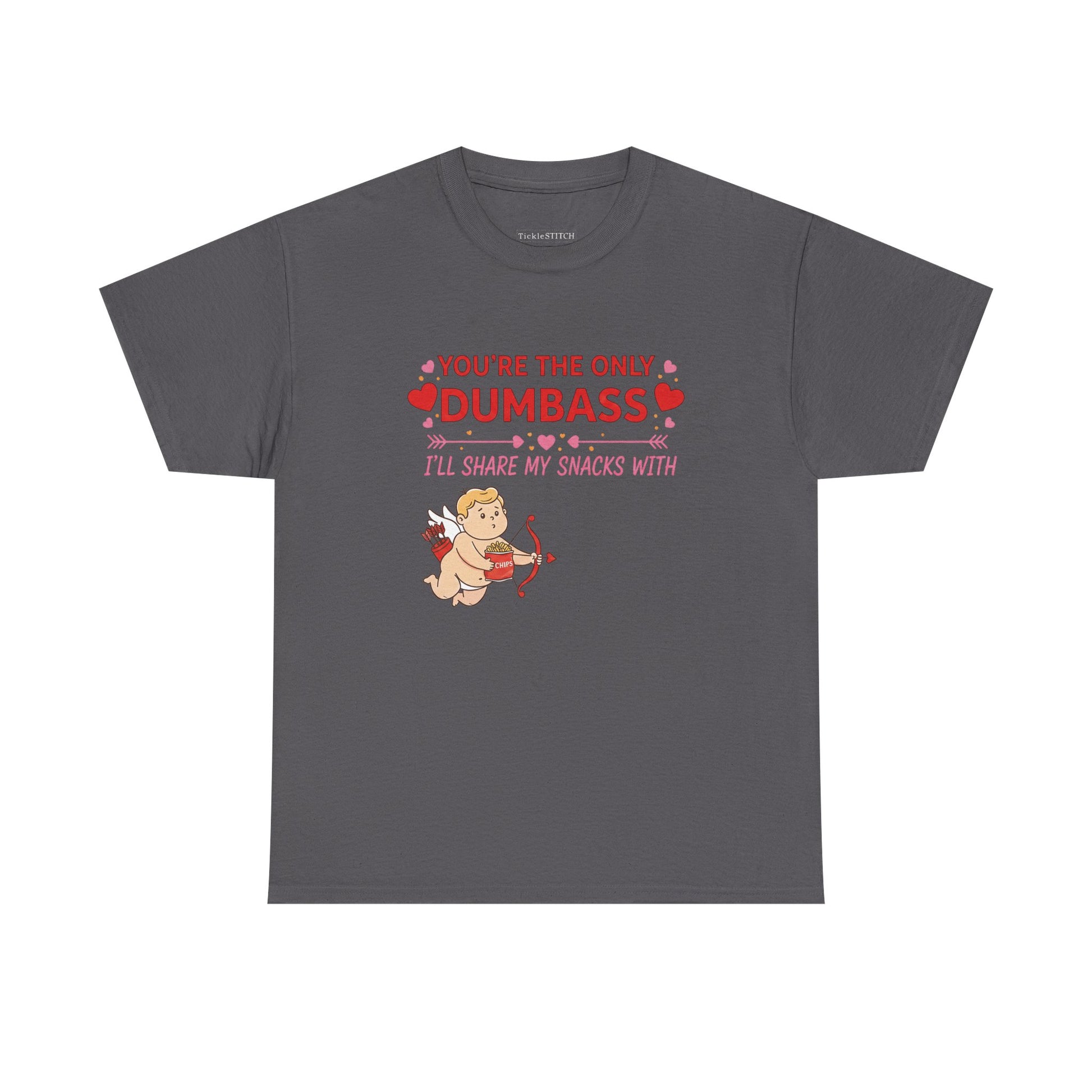 Declare your unique brand of affection this Valentine's Day with our hilarious 'Cupid You’re The Only Dumbass I’ll Share My Snacks With' design. Perfect for those head-over-heels moments when sharing your precious treats is the ultimate sign of love. This funny tee captures the playful spirit of a smitten relationship, ideal for boyfriends, girlfriends, or anyone deeply infatuated and willing to make the ultimate sacrifice: sharing their food. Featuring charming hearts and soft red and pink hues, it’s a loving yet humorous nod to St. Valentine and the joys of a quirky romance. Whether you're a foodie who rarely shares or simply appreciate a good laugh, this shirt is a fantastic way to show your special someone they're truly one of a kind. It’s more than just a gift; it’s a declaration of love, a testament to shared snacks, and a celebration of that uniquely funny bond you share. Get ready to spread smiles and maybe even a few shared crumbs this romantic season.