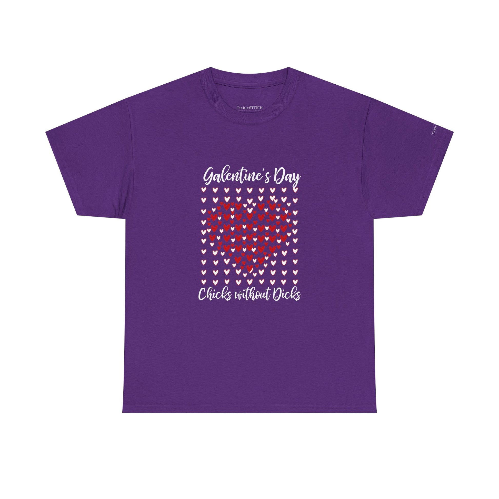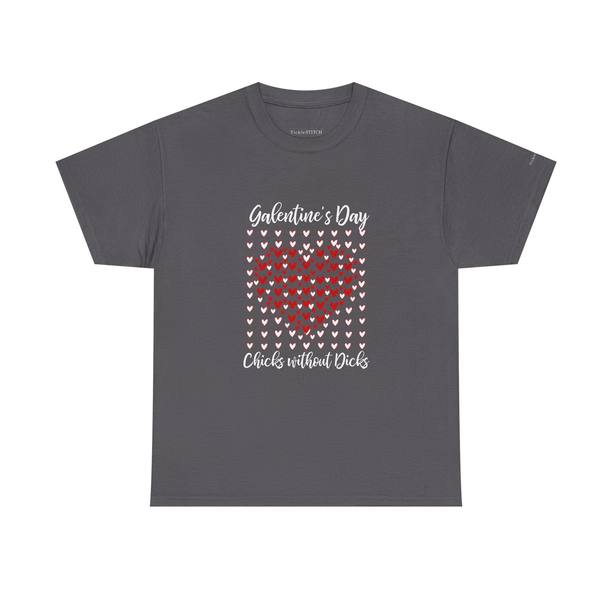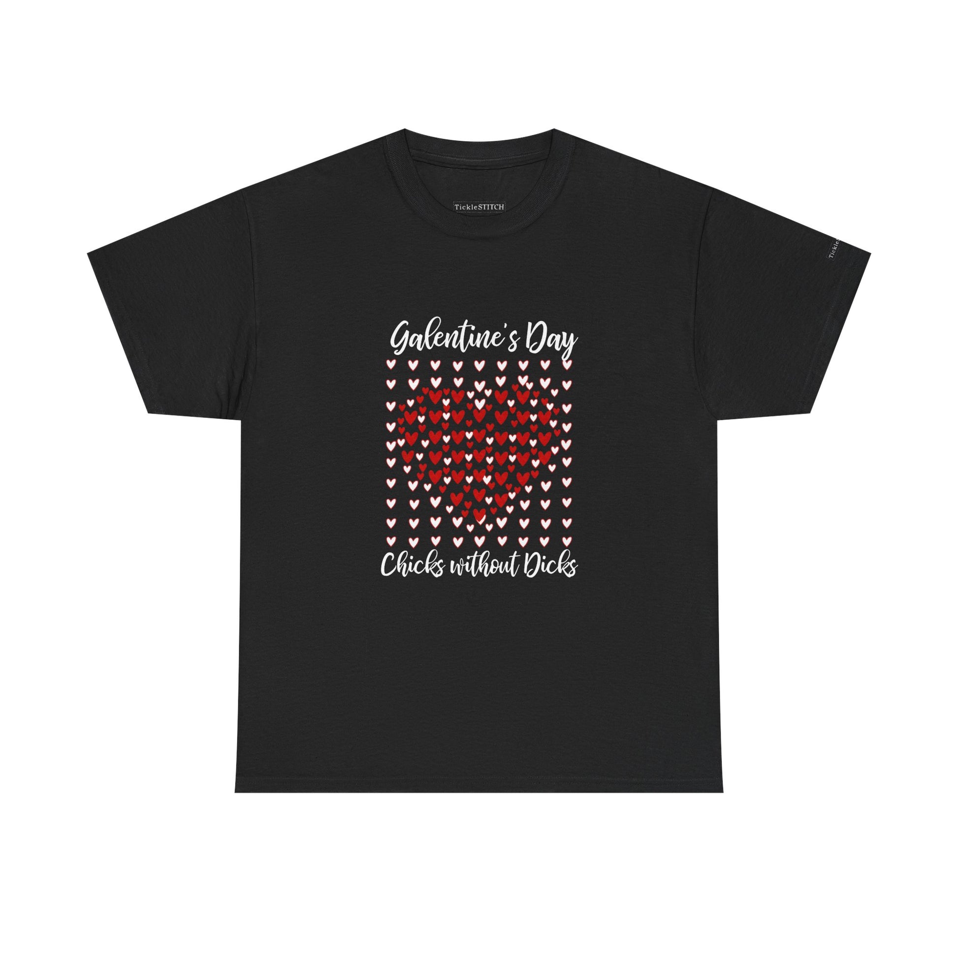 Celebrate the unbreakable bond of female friendship this Galentine's Day with our exclusive 'Chicks Without Dicks' Heart Mosaic Tee This playful design is perfect for ladies who want to honor their besties and embrace an anti-Valentine's spirit, focusing purely on sisterhood Featuring a charming mosaic of randomly placed red and white doodle hearts, this shirt captures a chaotic yet loving scrapbook style, making it a unique statement piece.