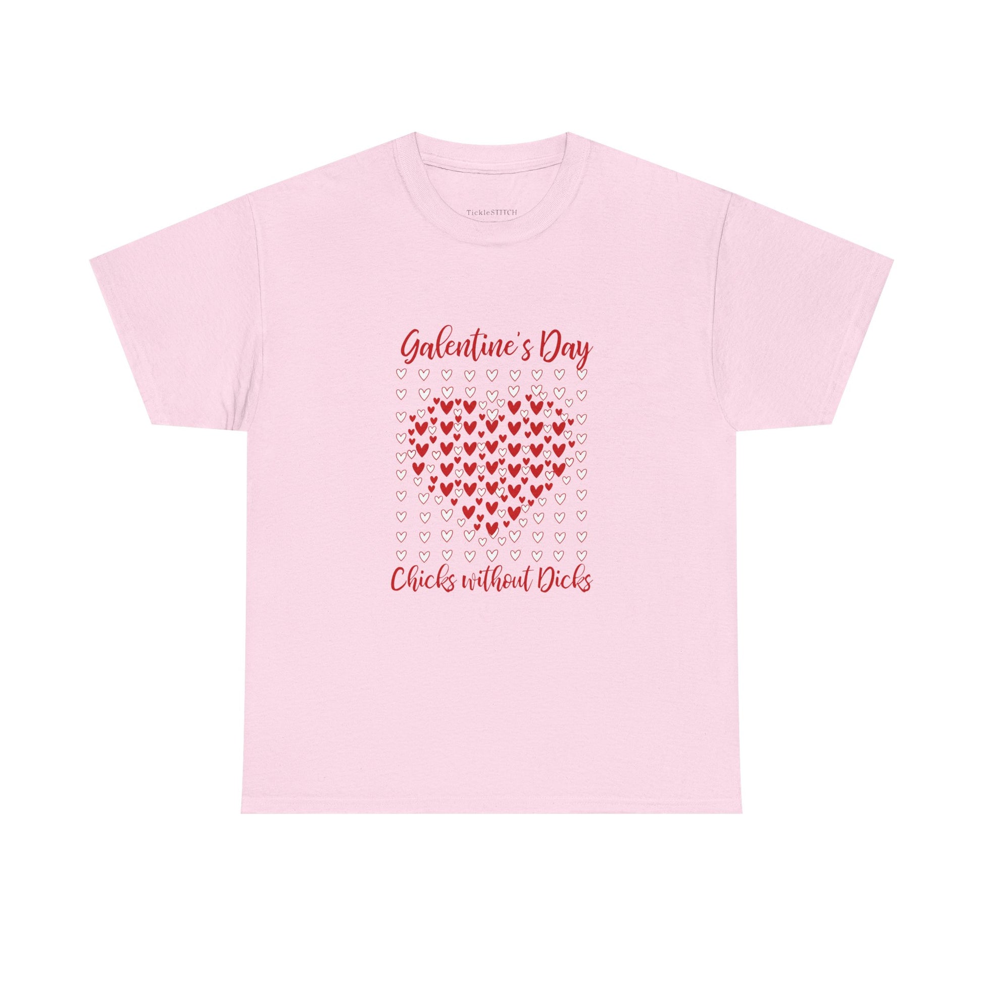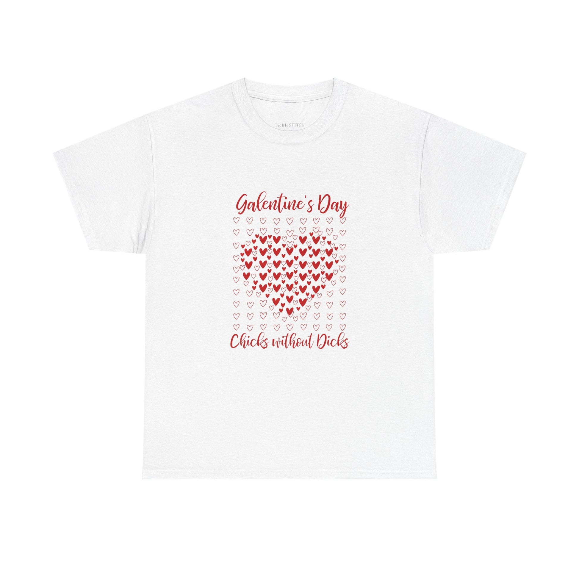 Celebrate friendship and sisterhood this Galentine's Day with our exclusive 'Chicks Without Dicks Heart Mosaic' design. Perfect for ladies only, this anti-Valentine's Day statement piece features a whimsical, chaotic love heart pattern, reminiscent of a scrapbook or sticker style. The red and white doodle hearts are randomly placed, creating a playful and abstract love illustration that's both minimalist and trendy. Forget the traditional romance; this holiday apparel is all about celebrating your besties, your hos before bros, and the joy of female camaraderie. Whether you're looking for a funny Valentine's Day shirt for her, a unique graphic tee for teens, or a special gift for your girlfriend or best friend, this design captures the spirit of modern romance and witty valentines. It's a cute illustration for those who appreciate artisanal romance with a touch of Gen Z humor, making it an ideal choice for a casual outing or a themed Galentine's Day gathering. Show your smitten love for your friends with this unique heart cluster, embodying a playful design that stands out from typical matching couples' attire. This tee is a perfect way to express your love for your favorite women,