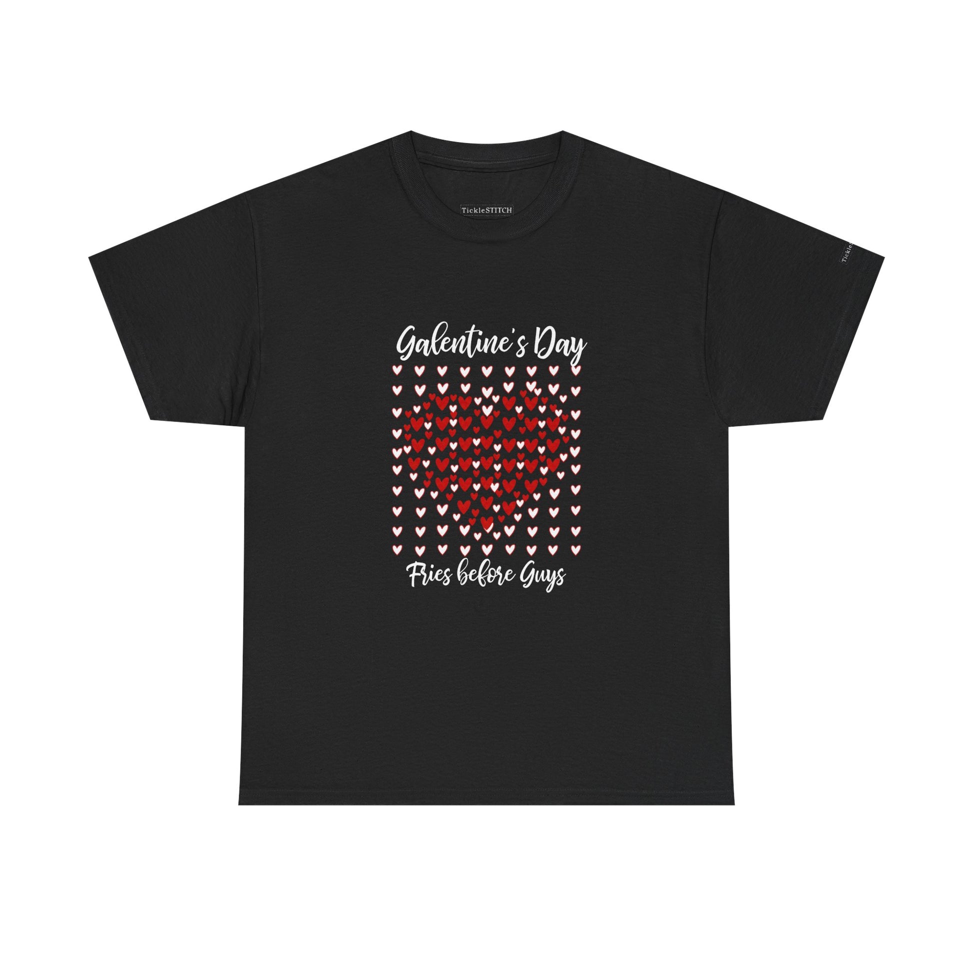 Celebrate female friendship this Galentine's Day with our exclusive 'Fries Before Guys' Heart Mosaic tee Perfect for the potato lover and fast food enthusiast, this design playfully declares your priorities Featuring a unique doodle heart mosaic in vibrant red and white, it captures a chaotic yet charming scrapbook style, ideal for an anti-Valentine's Day statement or a fun ladies-only gathering.