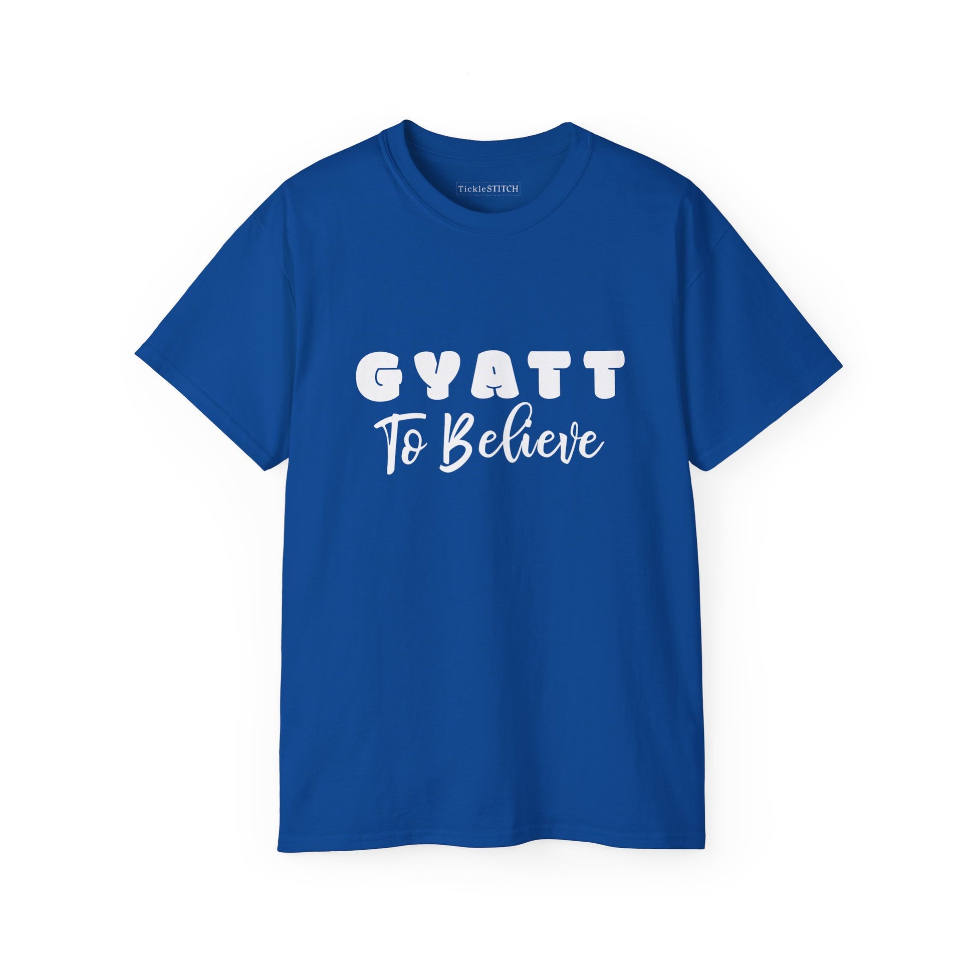 Ideal for casual outings, social media posts, or just lounging around, the 'Gyatt to Believe' shirt adds a dose of quirky charm to your wardrobe. Flaunt your **gyatt pride** and showcase your unique style with this **Durable T-Shirt** designed to last. Get ready to turn heads and spread some smiles with this iconic piece of **Pop Culture T-Shirts**! It's the perfect shirt for those with self-confidence and a little 'butt humor'.