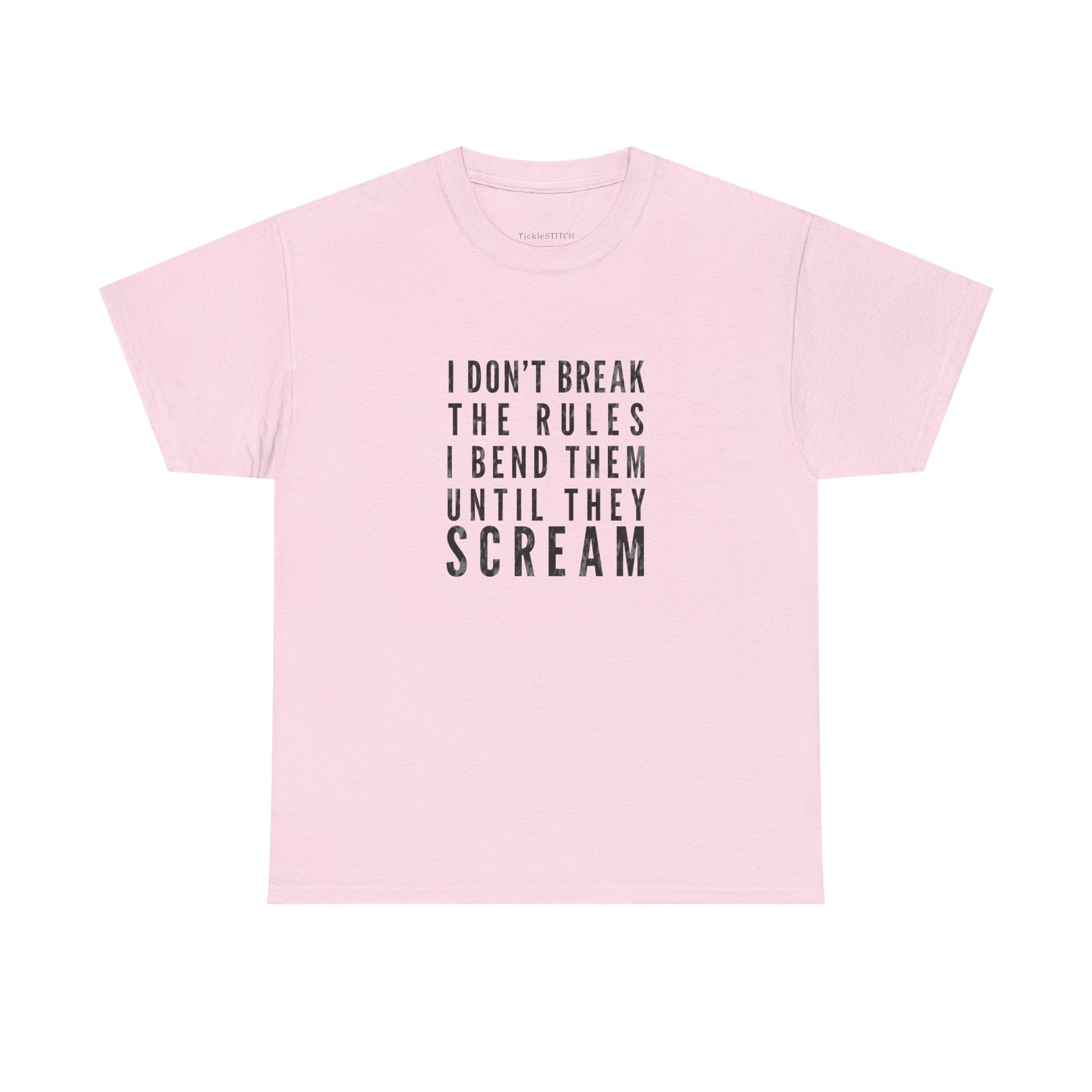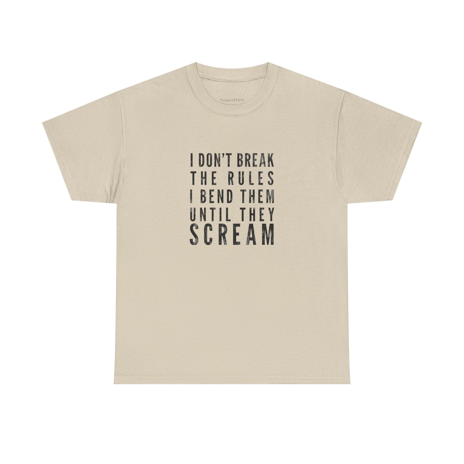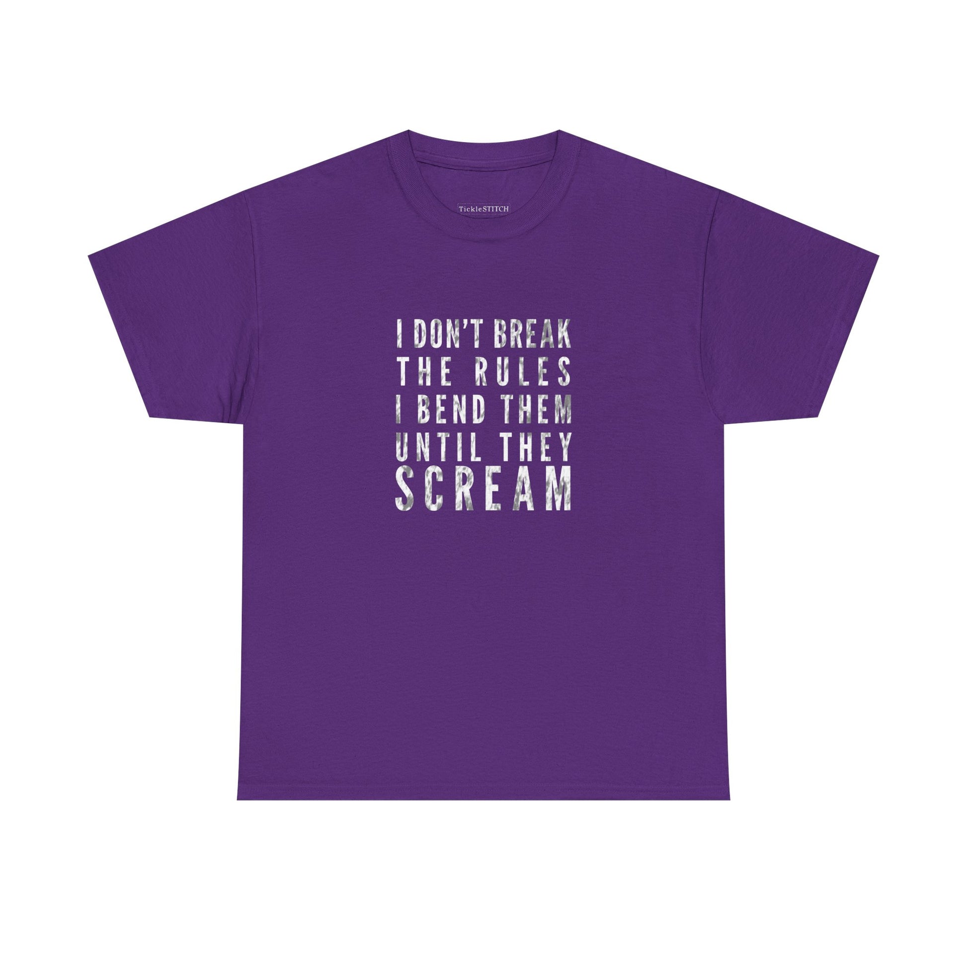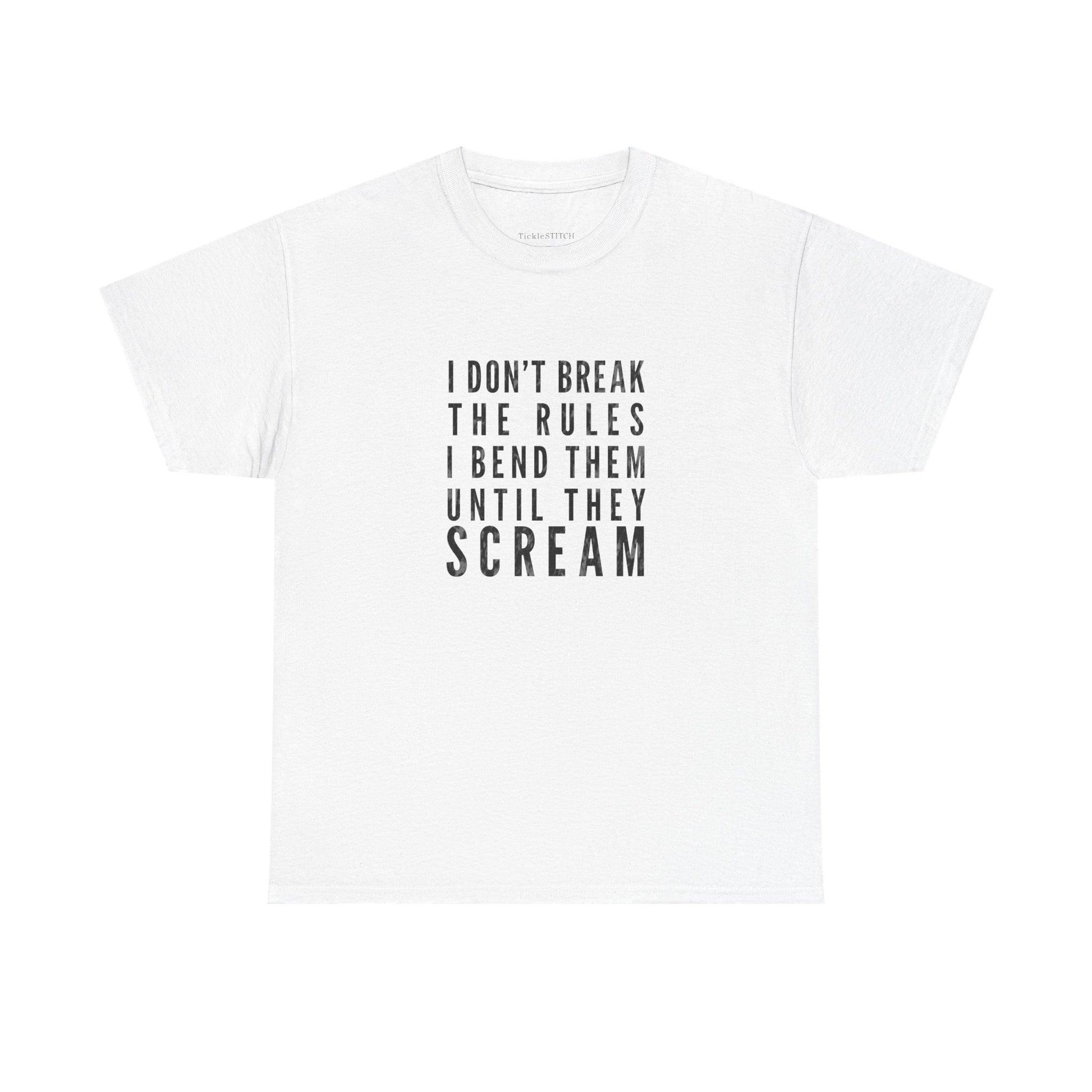 This unique tee is for the individual who lives life on their own terms, especially in the gym. Featuring the bold statement, "I Don't Break The Rules, I Bend Them Until They Scream," this shirt perfectly captures the spirit of a true rule bender and boundary pusher. It's more than just a piece of apparel; it's a declaration of a rebellious attitude and a defiant spirit. Ideal for weightlifters and fitness enthusiasts with a sharp sense of humor, this design speaks to those who challenge norms and manipulate expectations, whether it's in their workout routine or daily life. Show off your anti-authority stance and trouble-making charm with this conversation-starting garment. Perfect for anyone who understands that sometimes, the best way to achieve your goals is to creatively redefine the parameters. This shirt embodies the essence of rule defiance and a playful, yet determined, approach to overcoming obstacles. It's a must-have for anyone with a rebellious spirit and a knack for bending rules until they yield to their will.