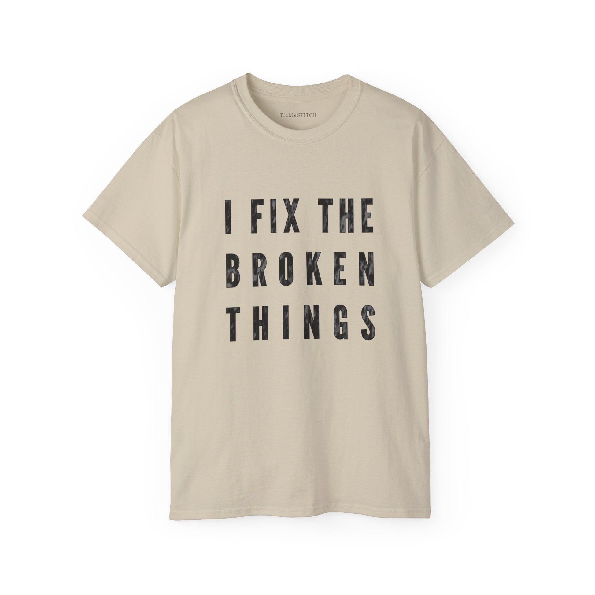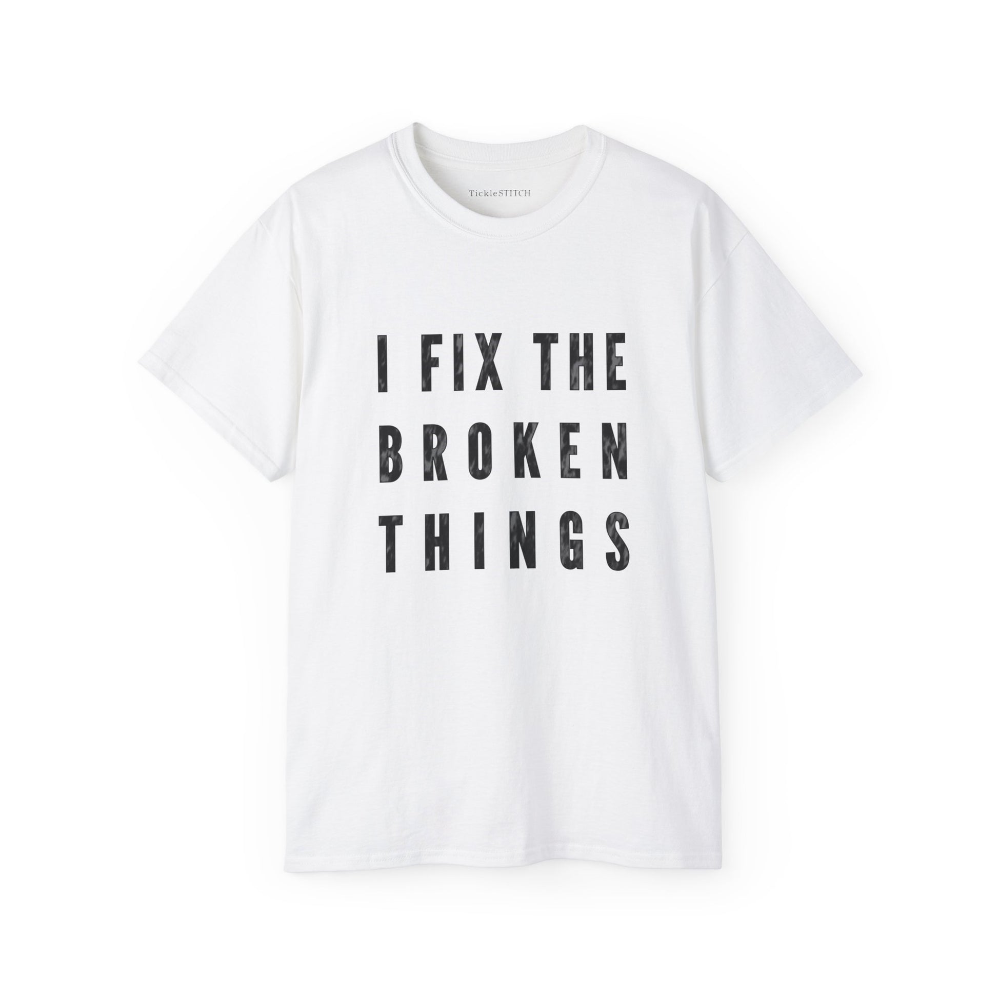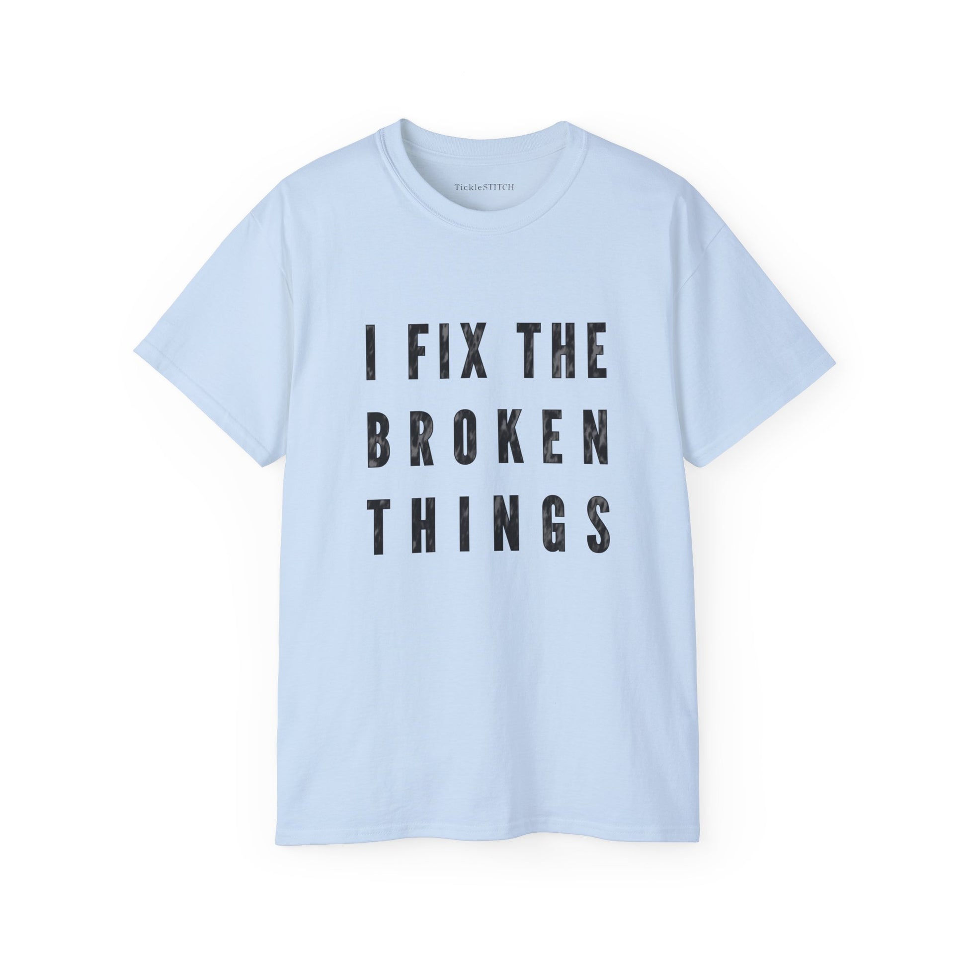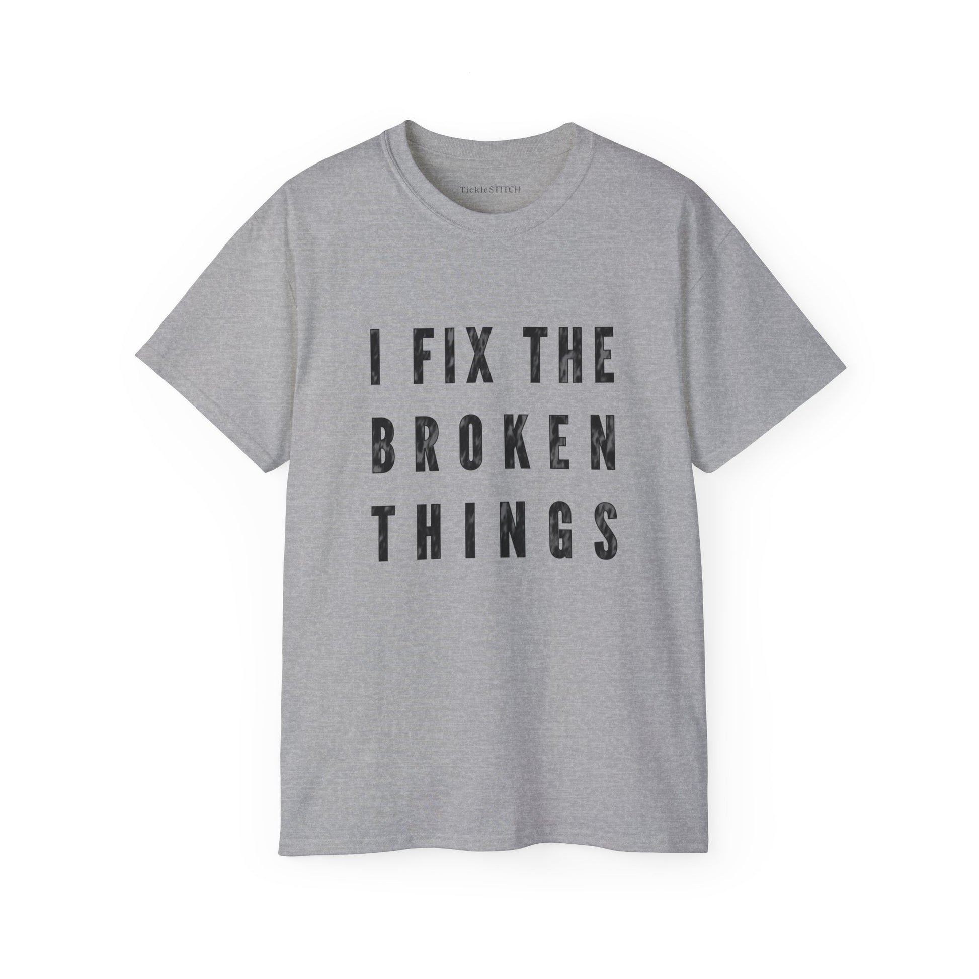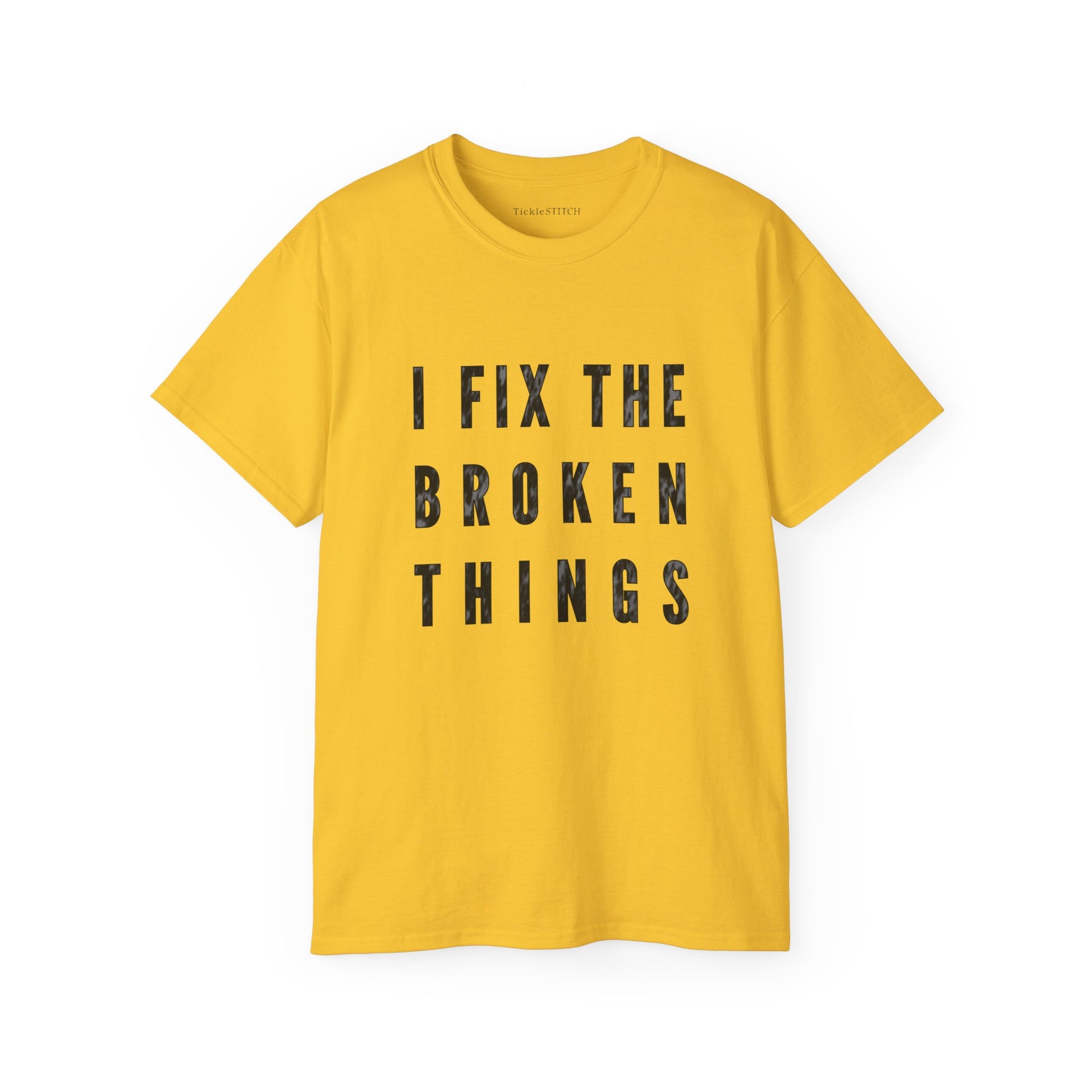 Show off your essential skills and a great sense of humor with our 'I Fix Broken Things' Men's T-Shirt! Perfect for the ultimate repair expert, this funny graphic tee is a must-have for every handyman, mechanic, or DIY dad. Whether you're a fix-it dad, a dedicated maintenance man, or the go-to tool guy who fixes everything, this sarcastic t-shirt says it all with witty repair humor. It's an ideal gift for the handy dad in your life, celebrating the handyman life and mechanic humor in style.