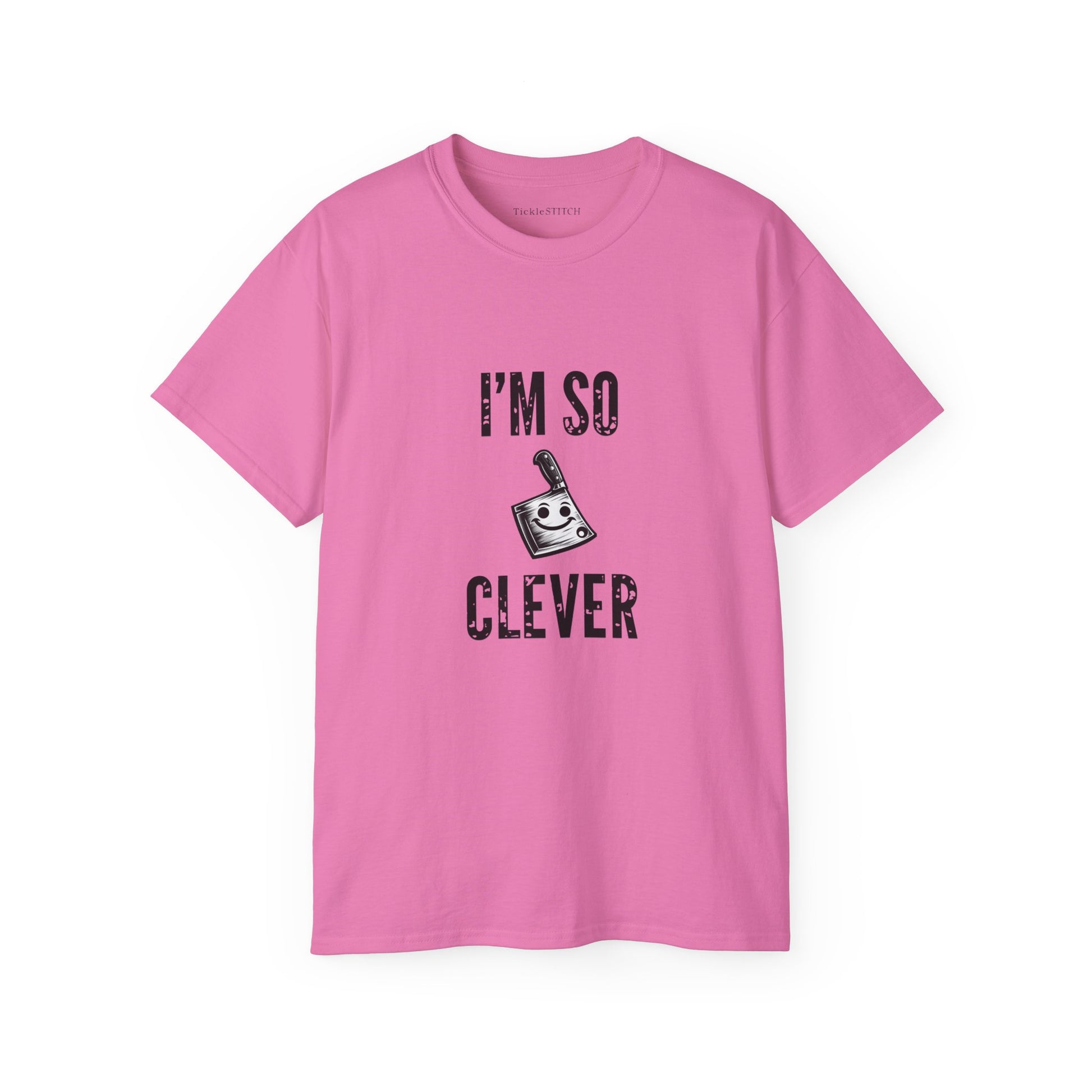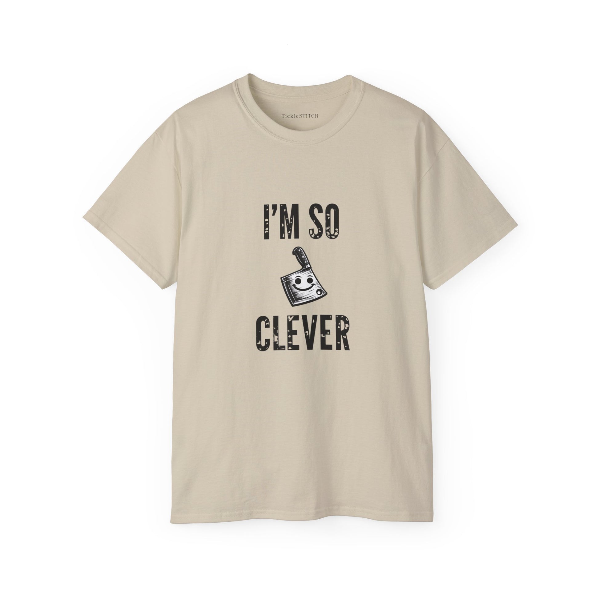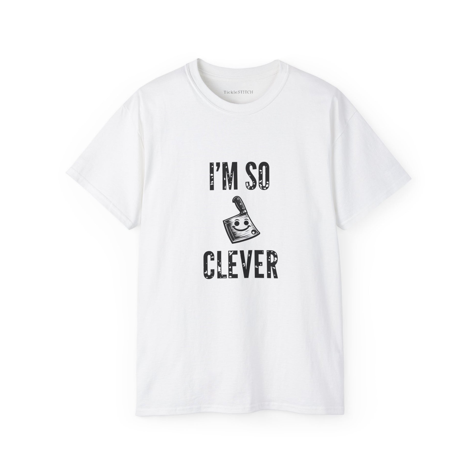 Unleash your razor-sharp wit with our 'I'm So Clever Cleaver' funny T-shirt! This clever graphic tee is perfect for anyone who loves a good cooking pun, dry humor, or just appreciates the art of a well-placed joke. Featuring a playful take on the essential kitchen tool, this humorous T-shirt is a must-have for butchers, chefs, culinary students, or any home cook who wields their knives with both skill and sarcasm. This witty apparel makes an ideal butcher gift, chef gift, or a fantastic present for anyone with a keen sense of kitchen humor.
