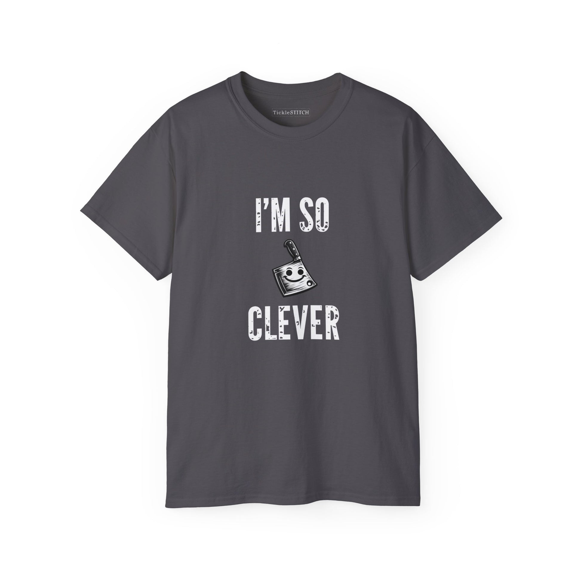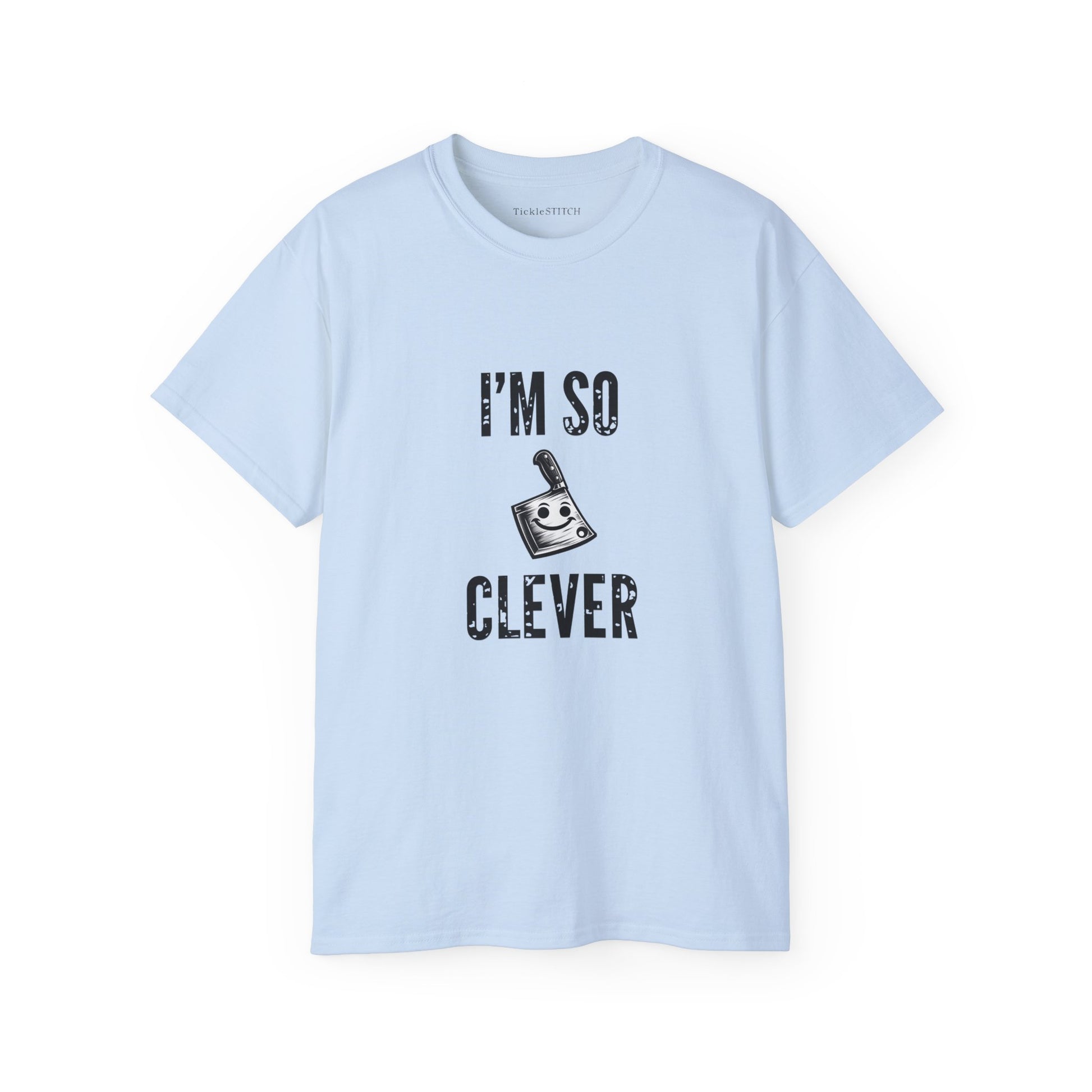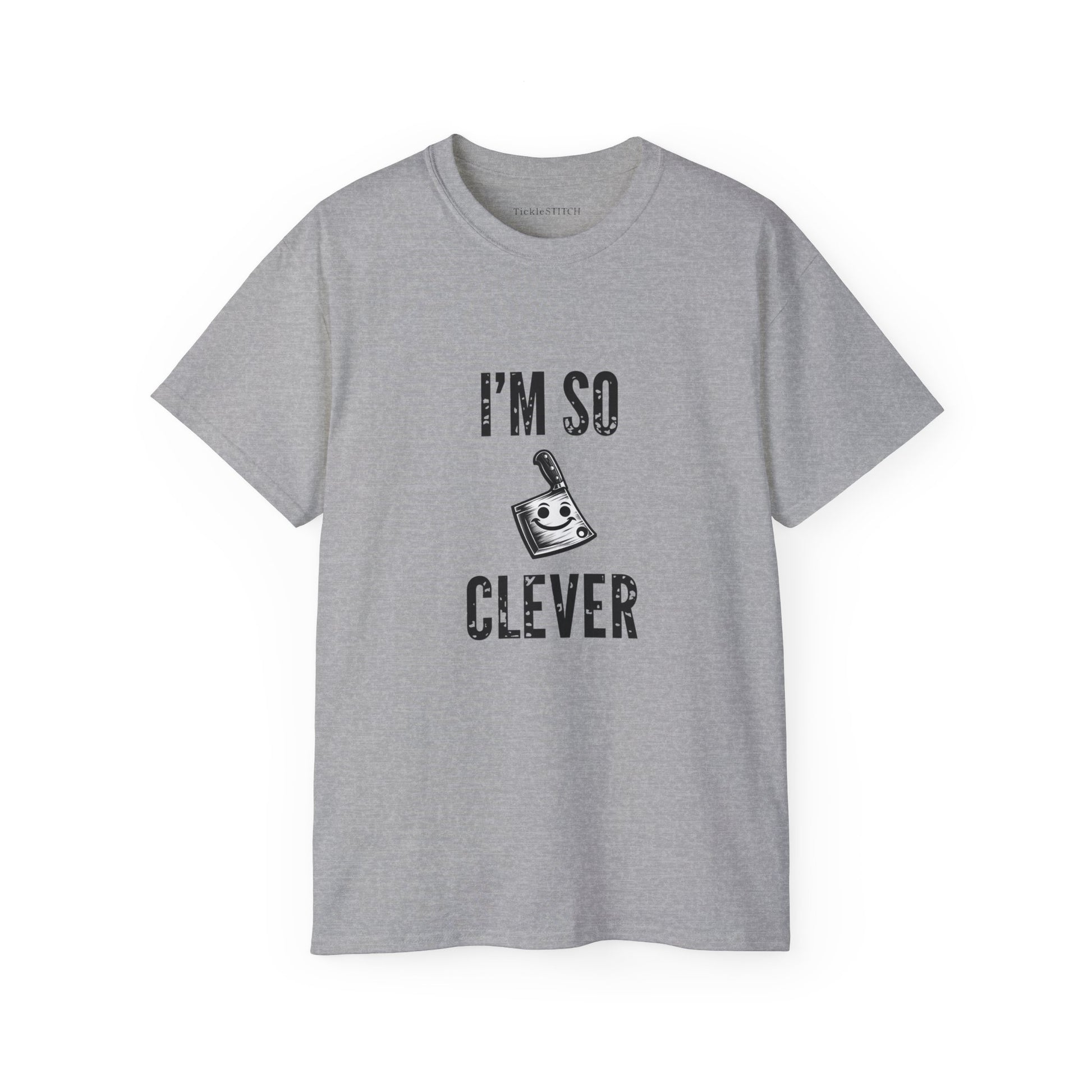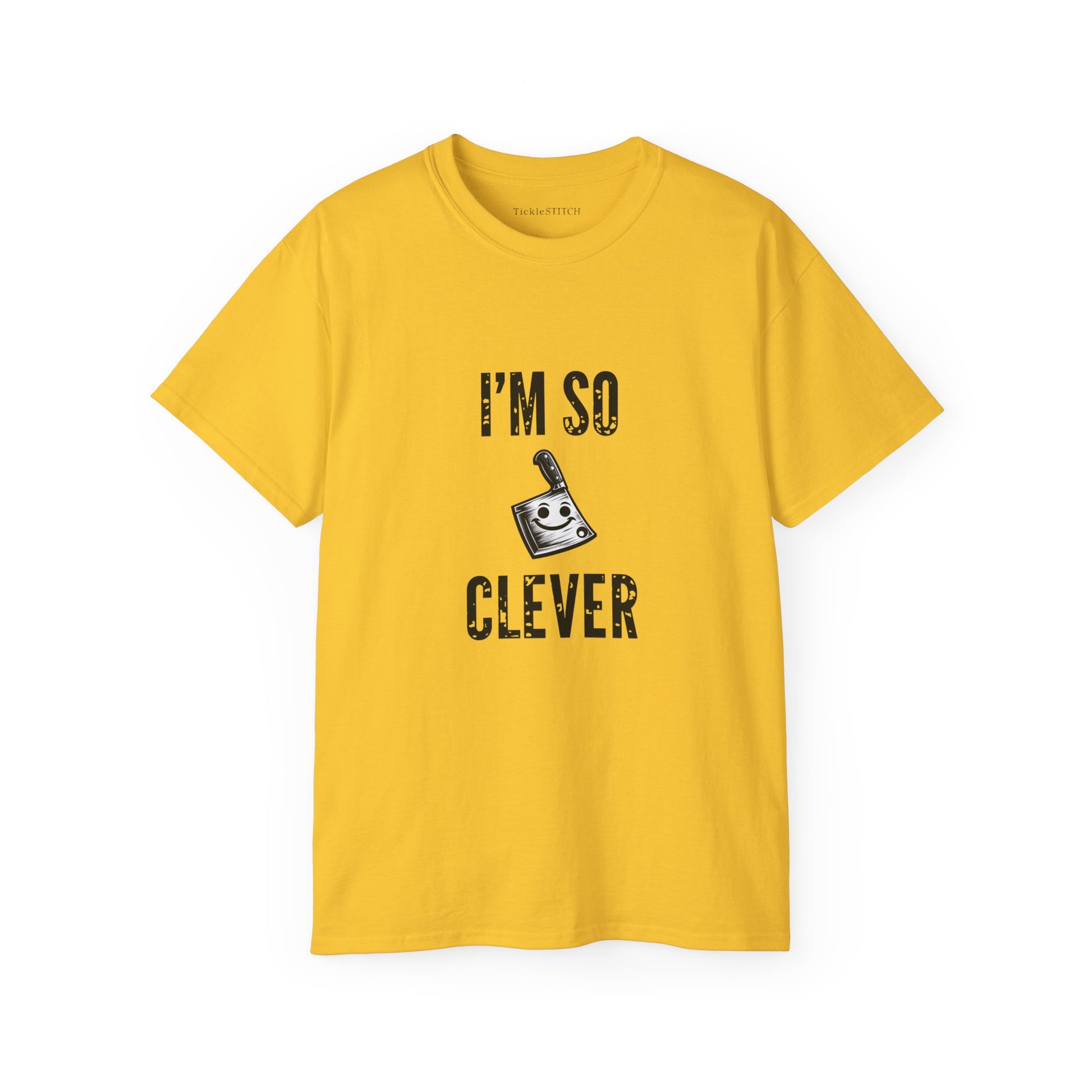 Unleash your razor-sharp wit with our 'I'm So Clever Cleaver' funny T-shirt! This clever graphic tee is perfect for anyone who loves a good cooking pun, dry humor, or just appreciates the art of a well-placed joke. Featuring a playful take on the essential kitchen tool, this humorous T-shirt is a must-have for butchers, chefs, culinary students, or any home cook who wields their knives with both skill and sarcasm. This witty apparel makes an ideal butcher gift, chef gift, or a fantastic present for anyone with a keen sense of kitchen humor.