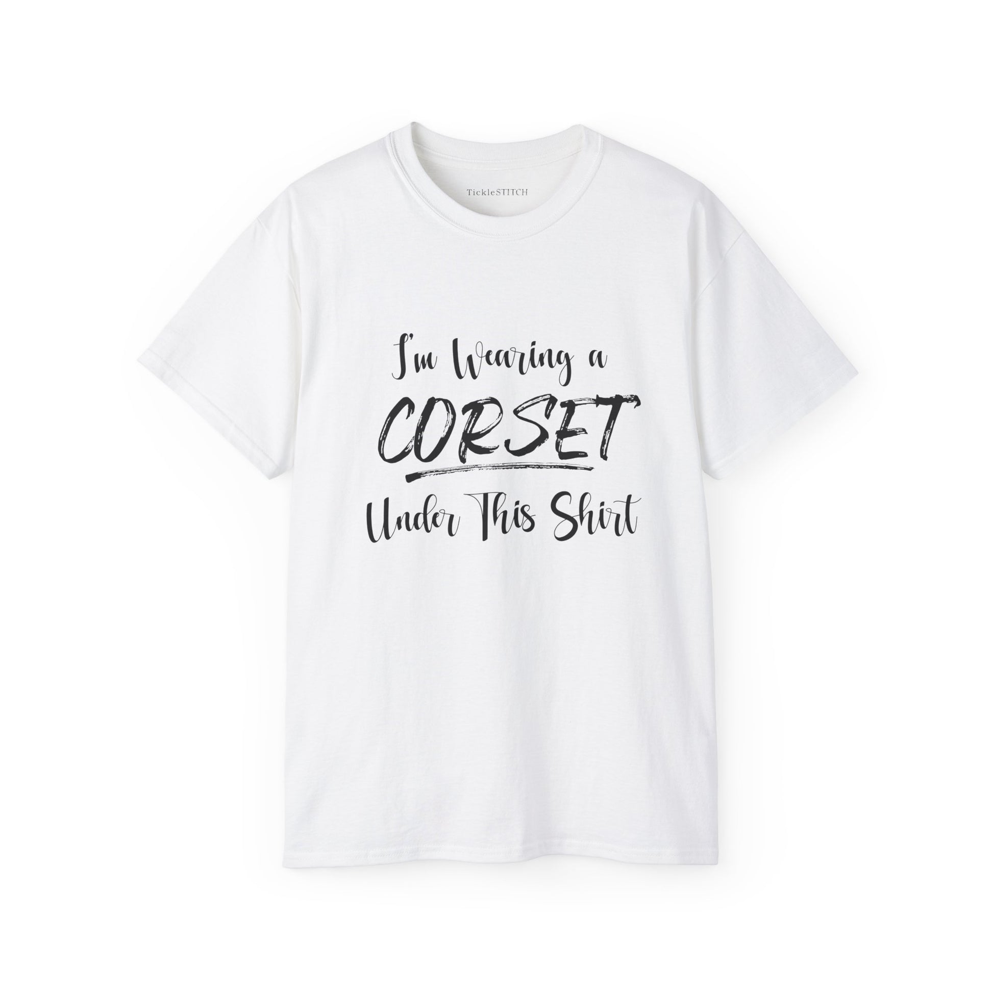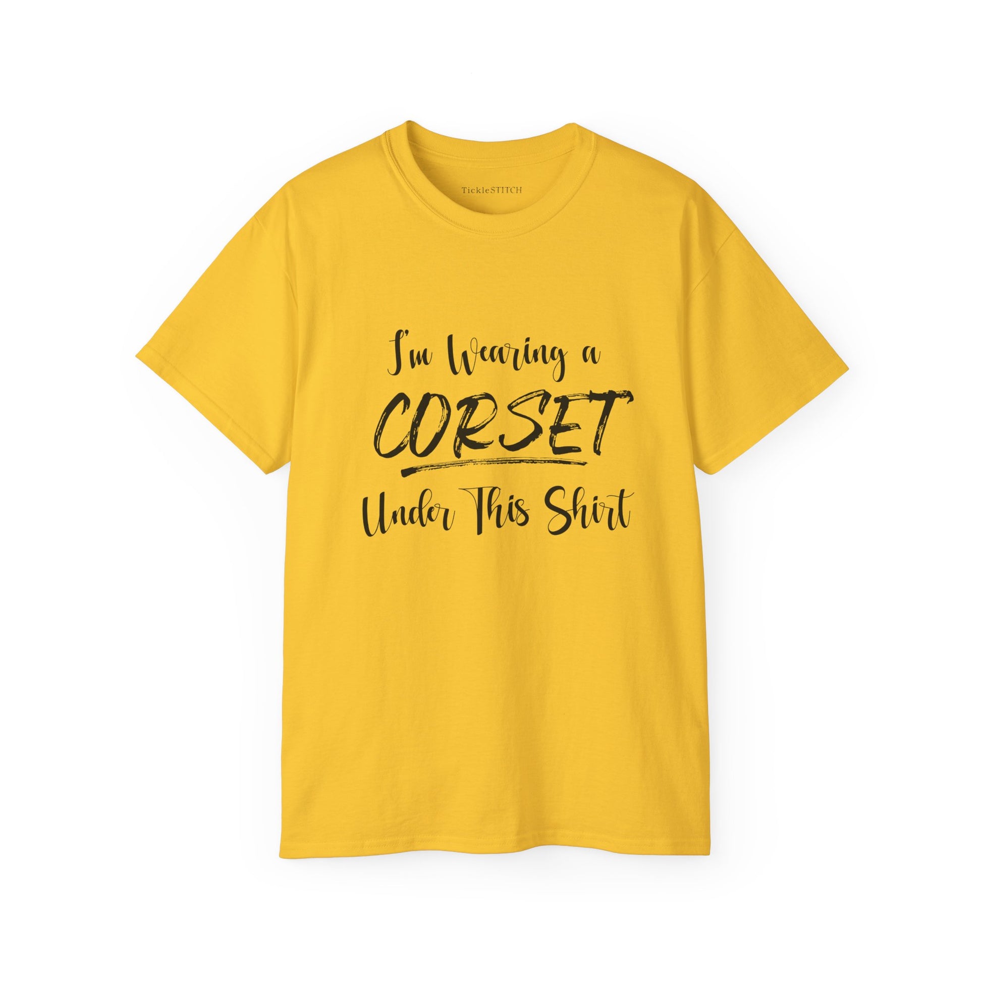 It's a fantastic gift for friends who adore historical clothing, enjoy a good corset joke, or simply love funny graphic tees. Stand out at the next Ren Faire, costume party, or simply make a daily statement with this trendy & stylish design. It's the perfect way to acknowledge the classic underbust corset or full corsetry look with a modern, funny twist. Available for both men's and women's t-shirts, this general humor tee makes a cool addition to any wardrobe.
