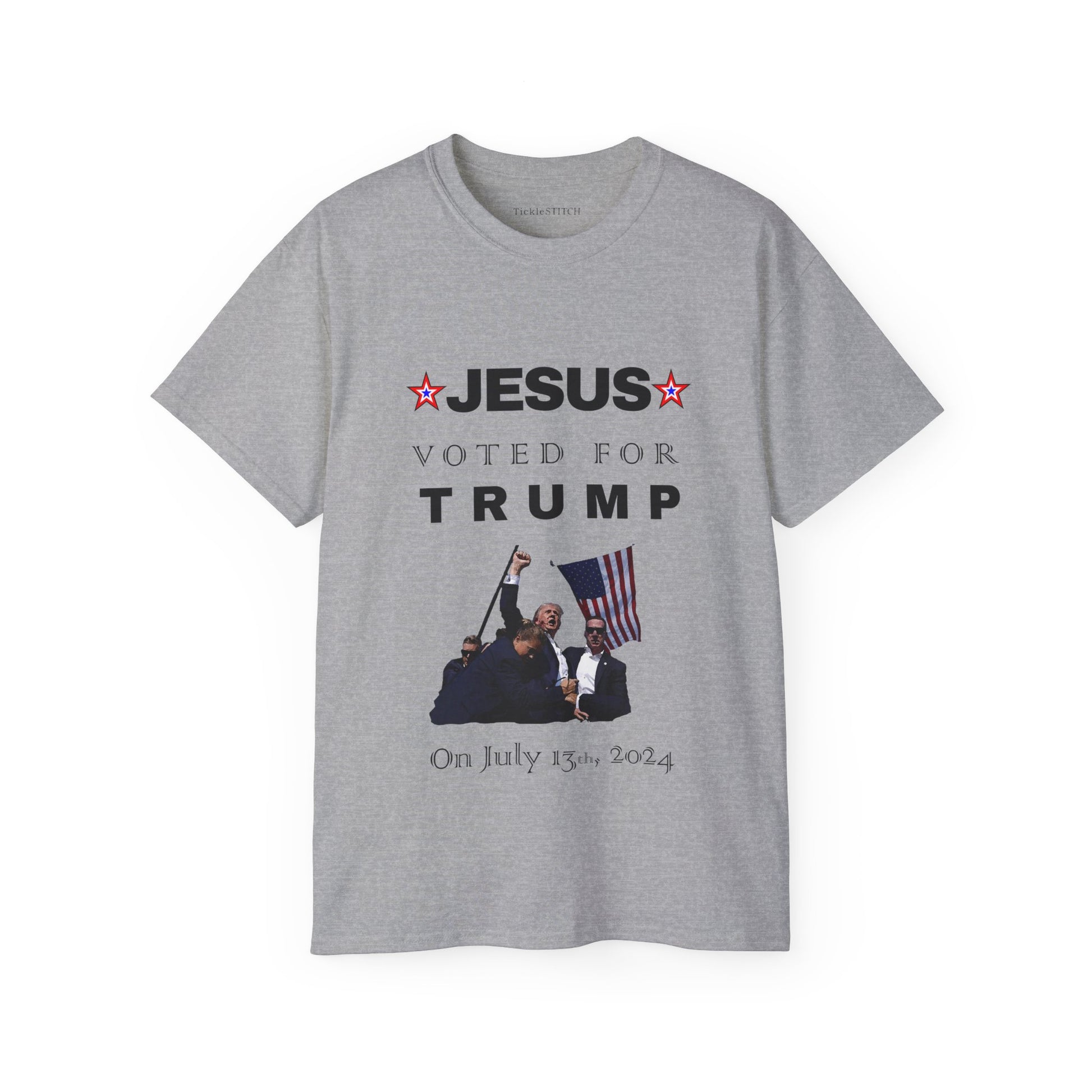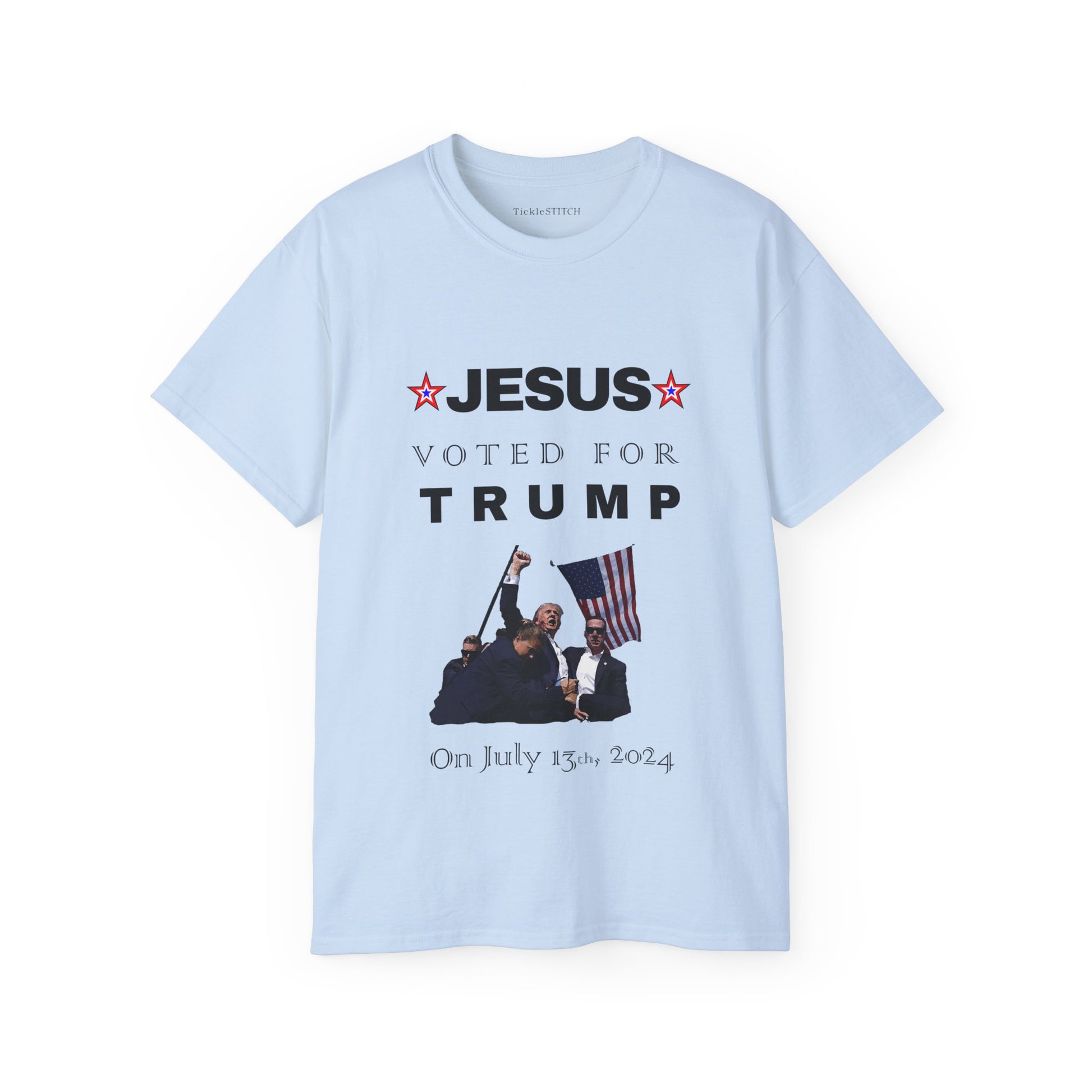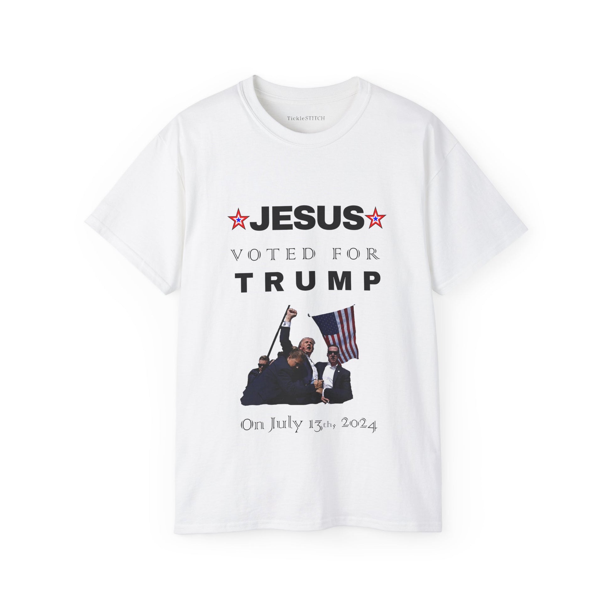 Make a bold political statement and spark conversations with our 'Jesus Voted for Trump on July 13th' T-Shirt! This pro-Trump apparel is designed for the Christian conservative who loves a good dose of political satire. Perfect for MAGA supporters and those ready for Trump 2024, this graphic tee combines faith-based politics with a unique, witty twist. Show your allegiance with this funny political tee, a prime example of republican humor and patriot gear.