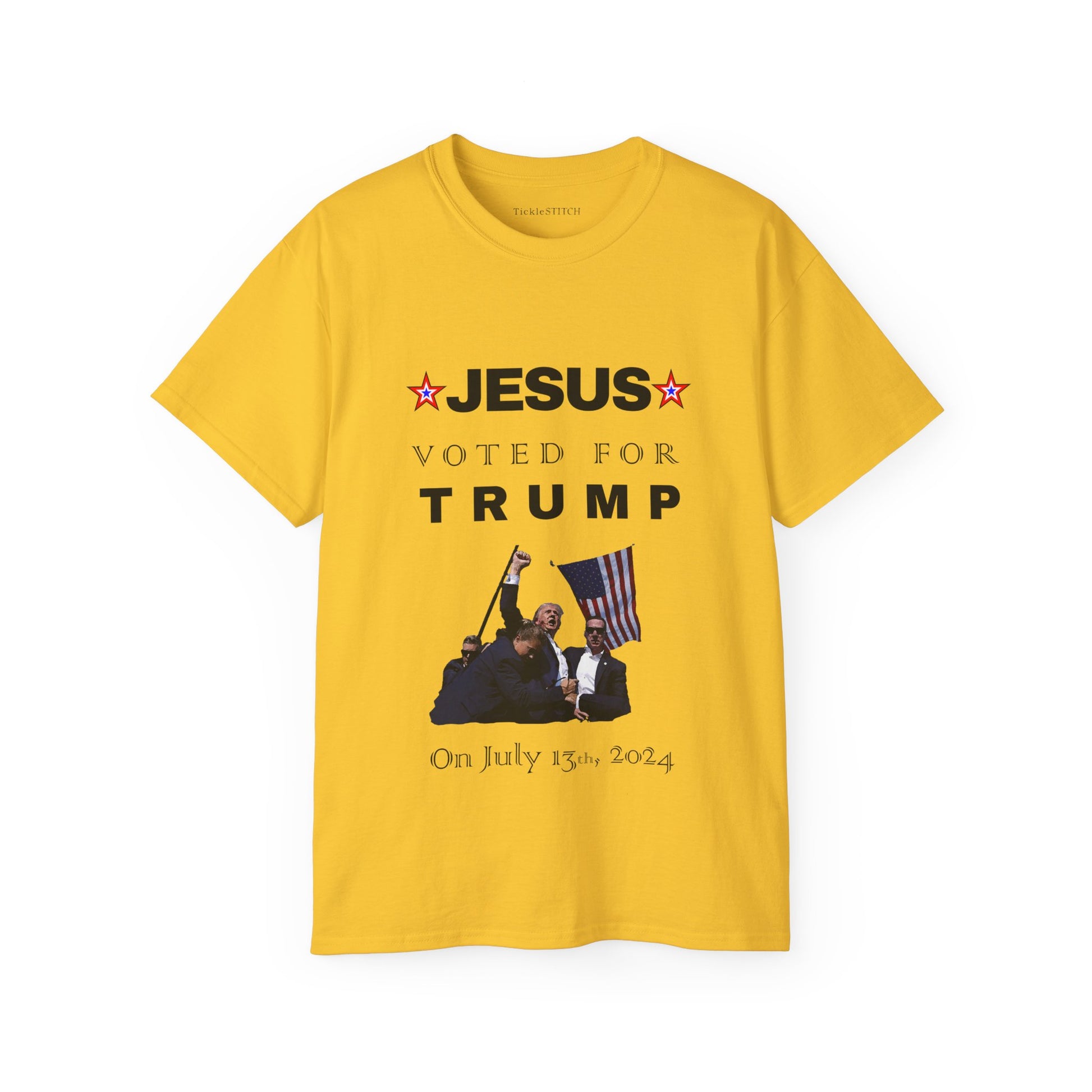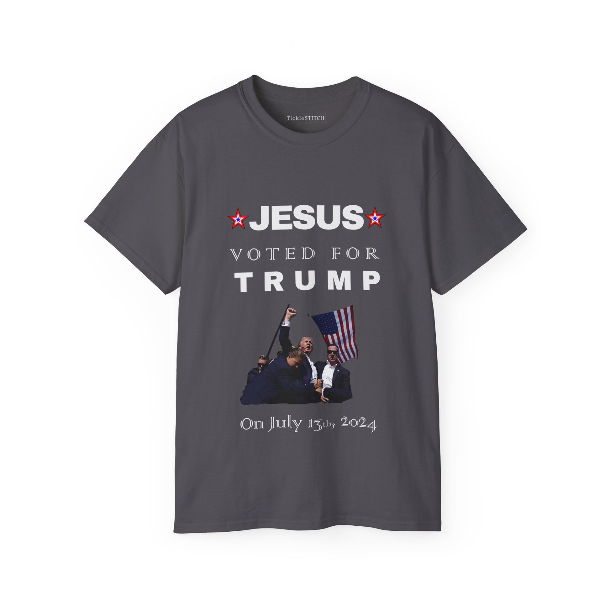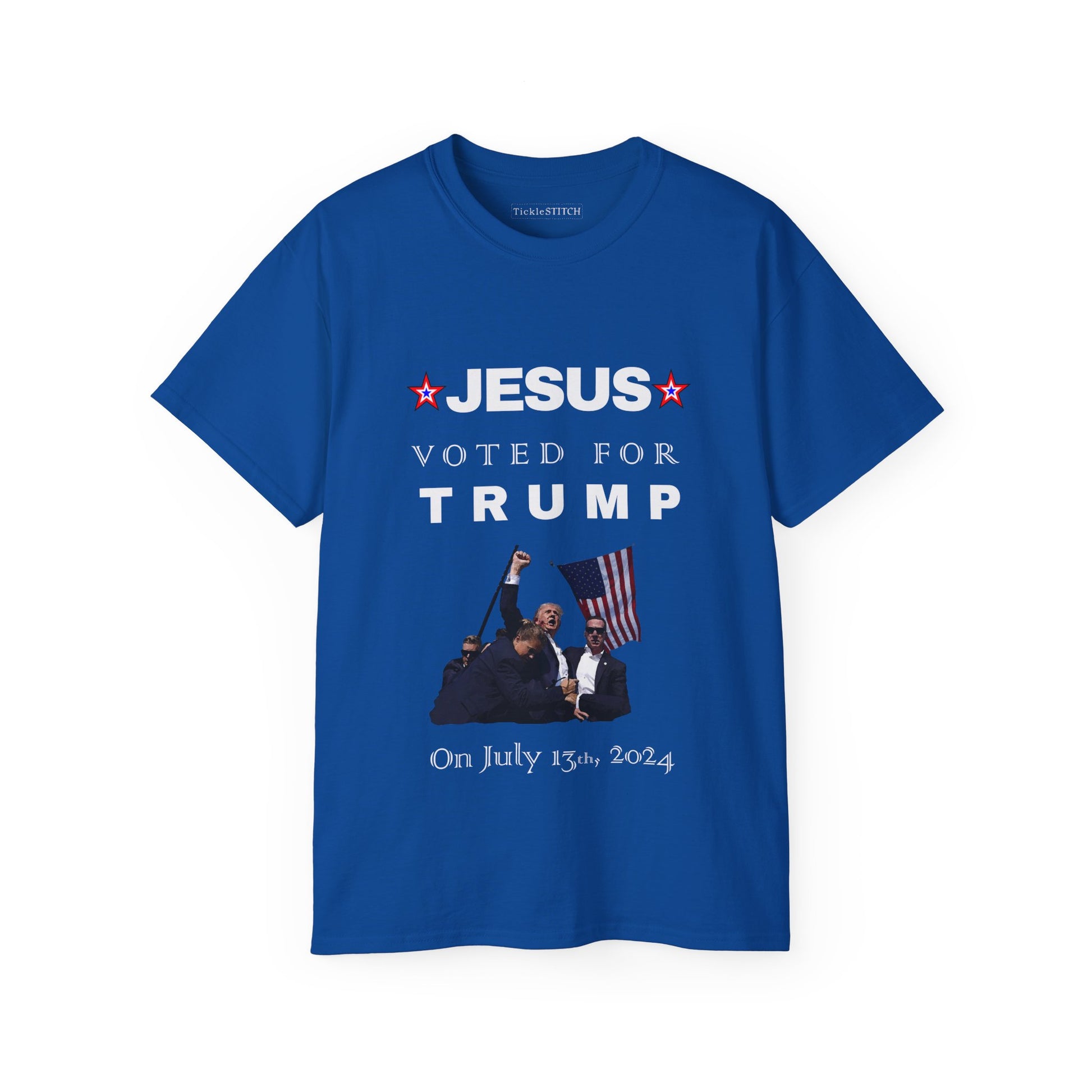 Make a bold political statement and spark conversations with our 'Jesus Voted for Trump on July 13th' T-Shirt! This pro-Trump apparel is designed for the Christian conservative who loves a good dose of political satire. Perfect for MAGA supporters and those ready for Trump 2024, this graphic tee combines faith-based politics with a unique, witty twist. Show your allegiance with this funny political tee, a prime example of republican humor and patriot gear.