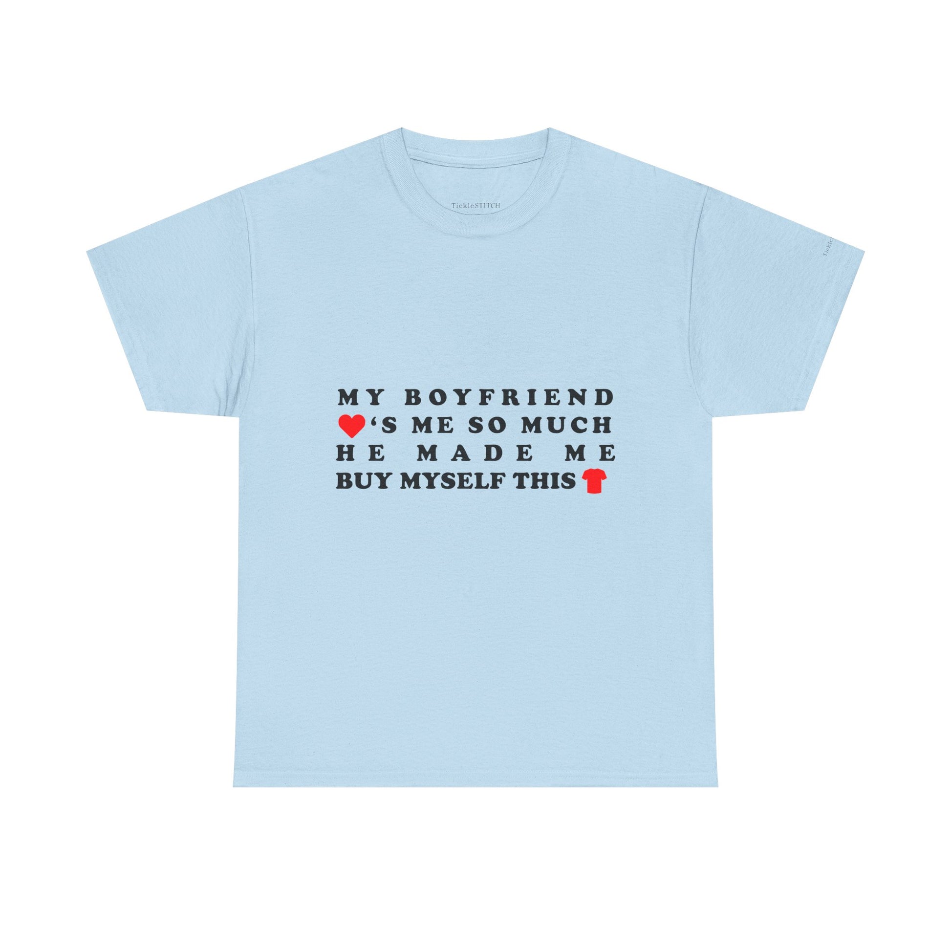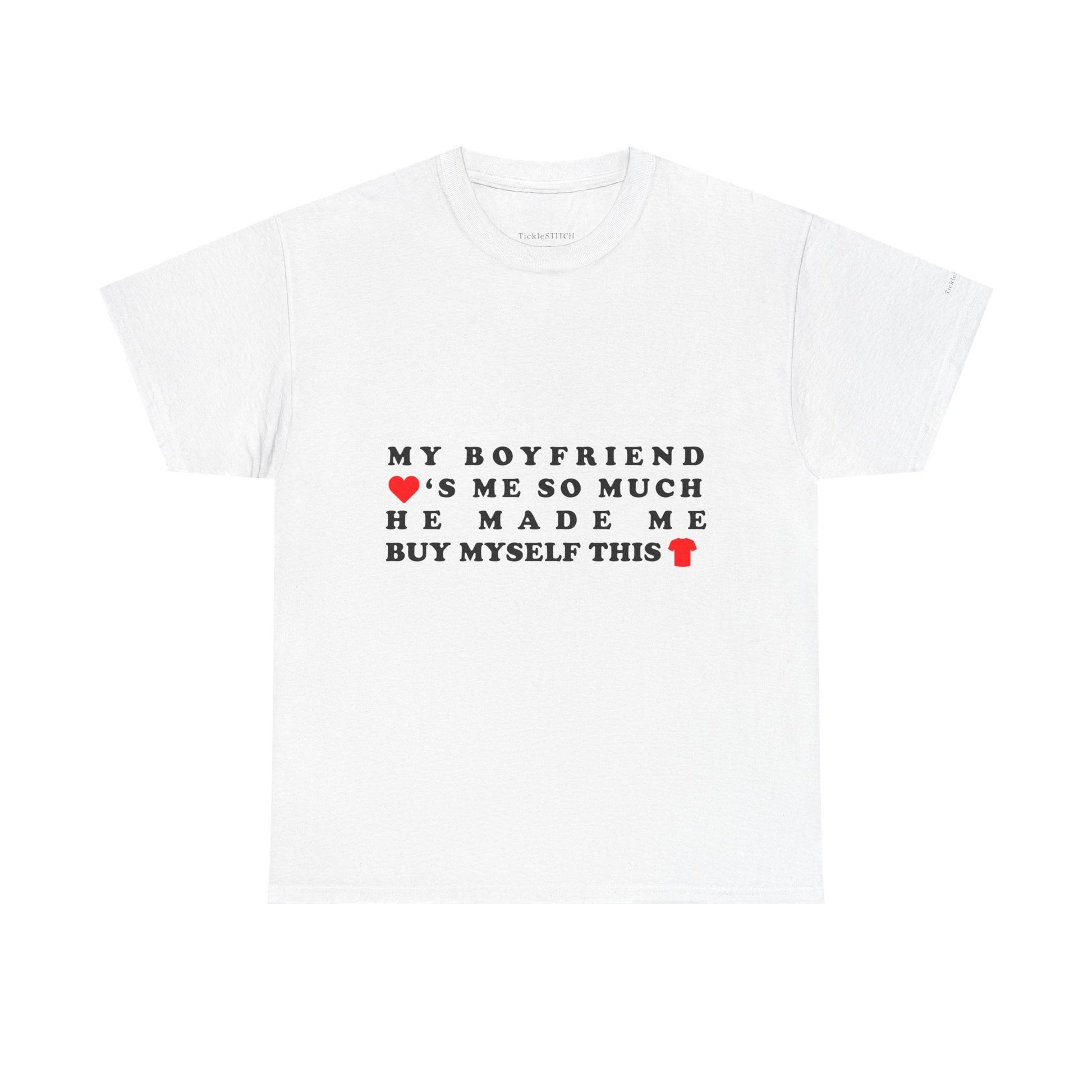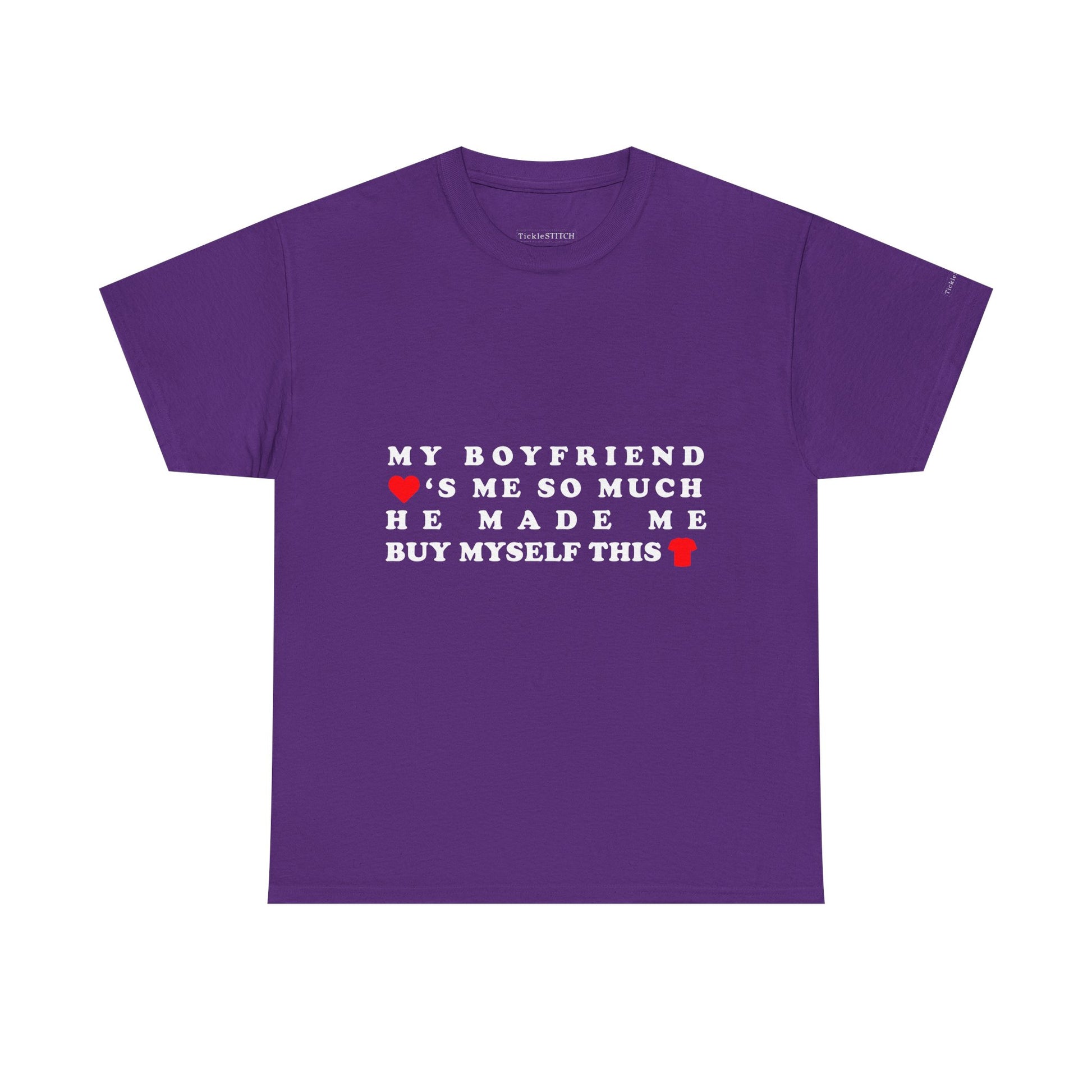 The design speaks volumes about relationship comedy and the silly side of being a couple, making it a standout piece for any girlfriend who's ever experienced the "boyfriend made me buy" scenario It's more than just a shirt; it's a conversation starter, a nod to shared jokes, and a testament to that special bond where love humor reigns supreme Show off your funny relationship joke with this comfortable and stylish tee, perfect for casual outings or cozy nights in.