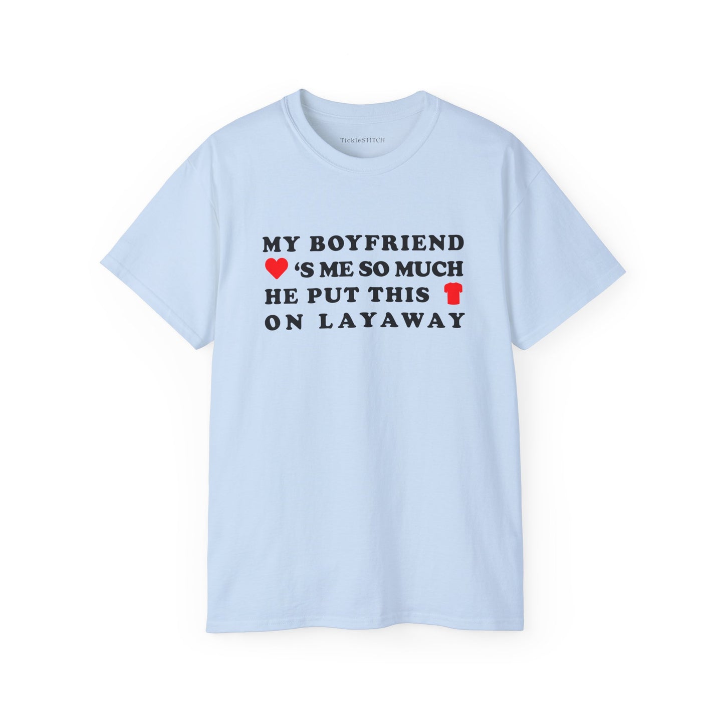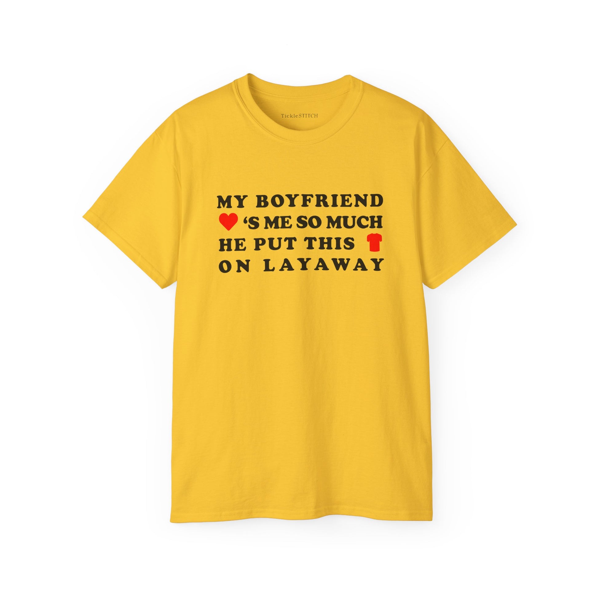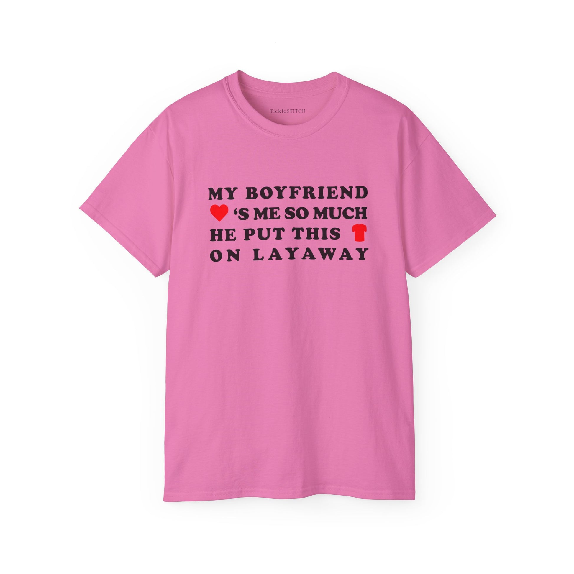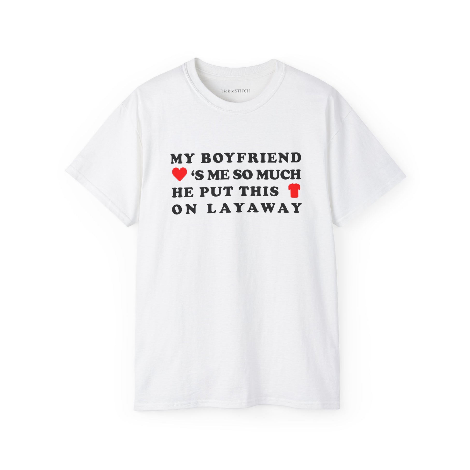 Funny 'My Boyfriend Loves Me So Much He Put This Shirt On Layaway' T-Shirt | Witty Relationship Financial Humor Graphic Tee