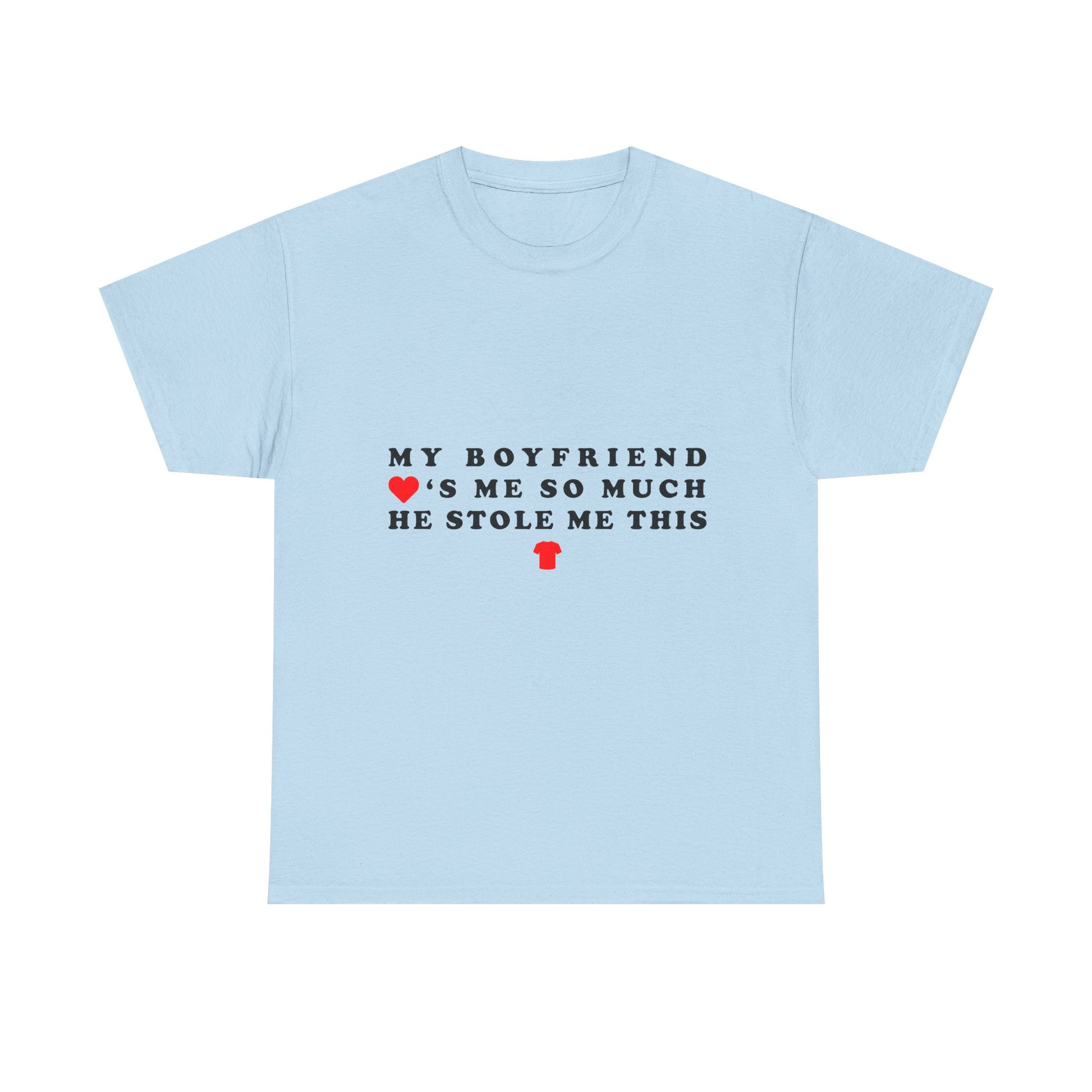 Celebrate the unique bond in your relationship with this hilarious "My Boyfriend Loves Me So Much He Stole Me This Shirt" tee, the perfect girlfriend gift from boyfriend that captures the essence of couple humor and love theft. This funny relationship t-shirt is ideal for anyone looking for a valentines day gift for girlfriend or just a witty relationship t-shirt to express that playful dynamic where your partner claims your wardrobe as their own. Featuring a great love humor graphic tee design, this stolen shirt funny tee speaks volumes about boyfriend humor and relationship comedy without needing a single bullet point. It's a fantastic piece of humorous couple apparel, making it a unique relationship gift that guarantees smiles, whether you're searching for a present for her from boyfriend or just a cute funny girlfriend shirt to add to your collection.
