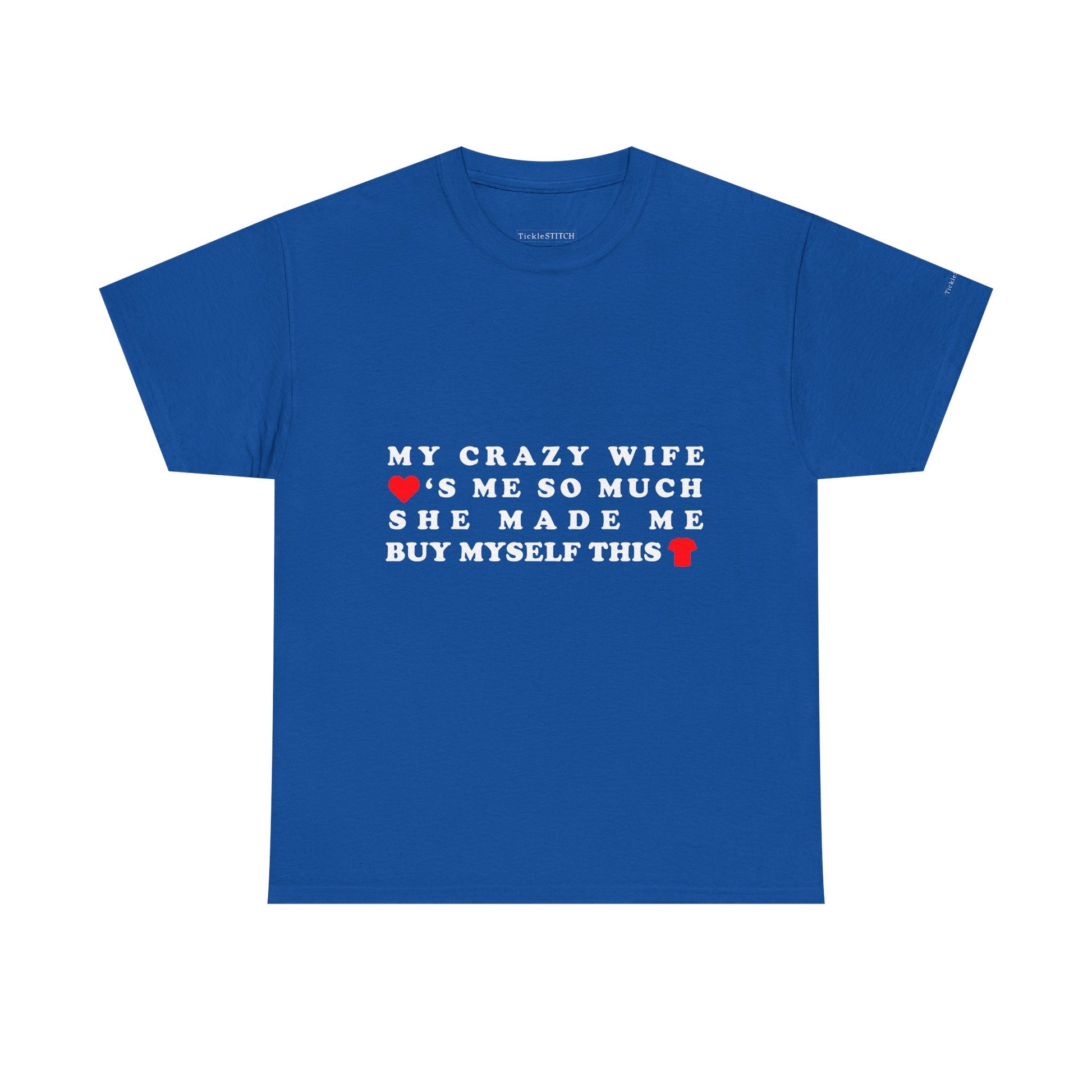 Show off your unique marital bliss with this hilarious 'My Crazy Wife Loves Me So Much She Made Me Buy Myself This Shirt' tee Perfect for husbands who appreciate a good laugh about married life, this shirt is a witty nod to the playful dynamics of a loving relationship It's an ideal husband gift for Valentine's Day, an anniversary, or just because your crazy wife loves you enough to make you wear it.