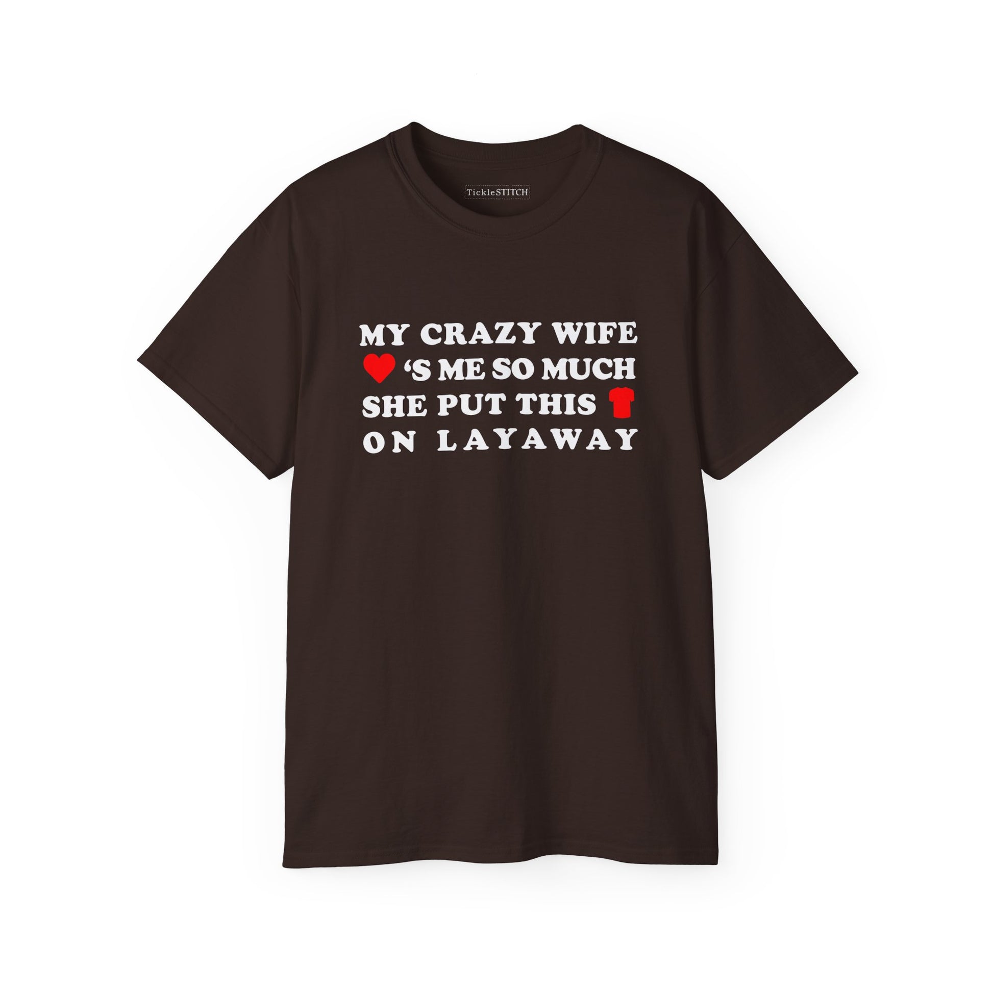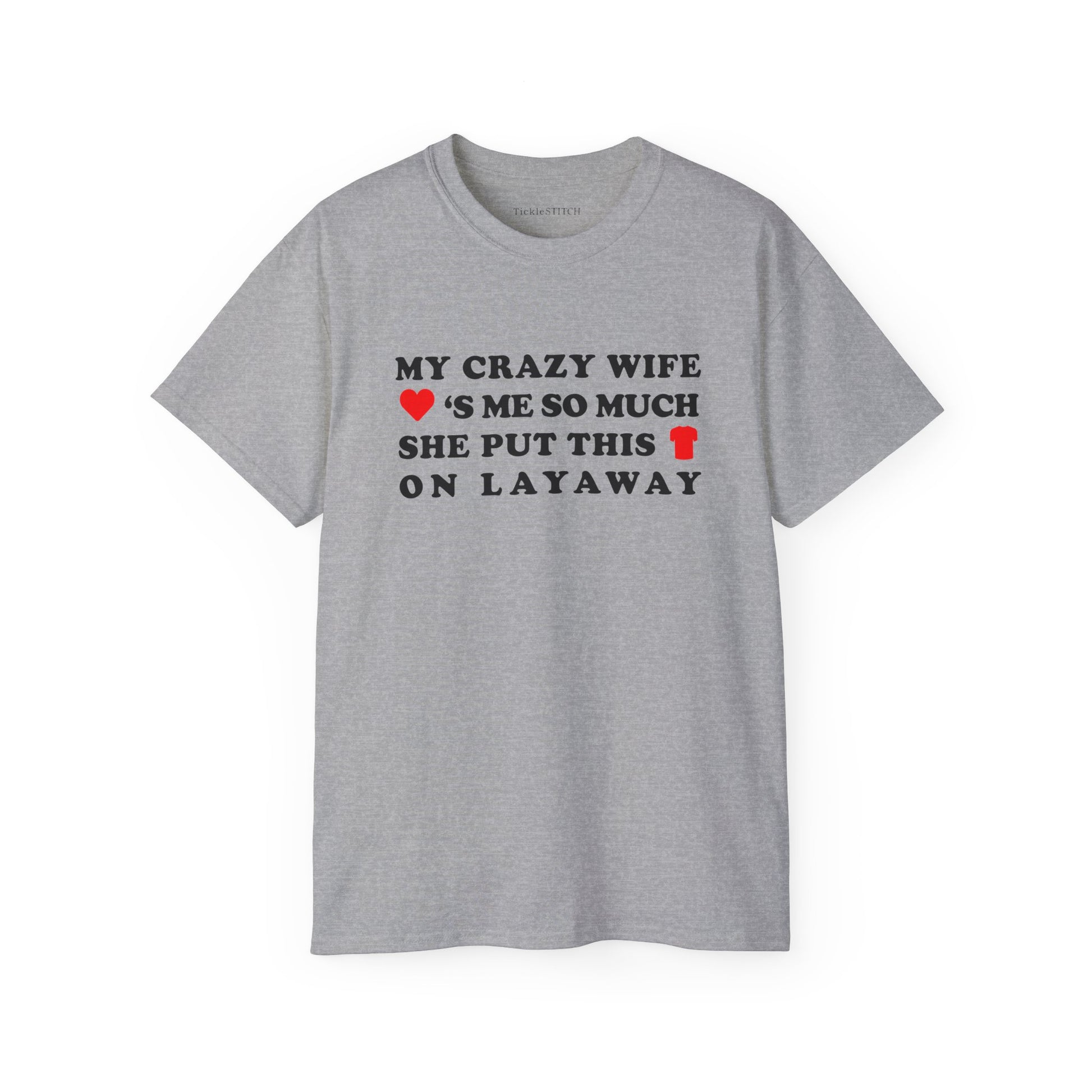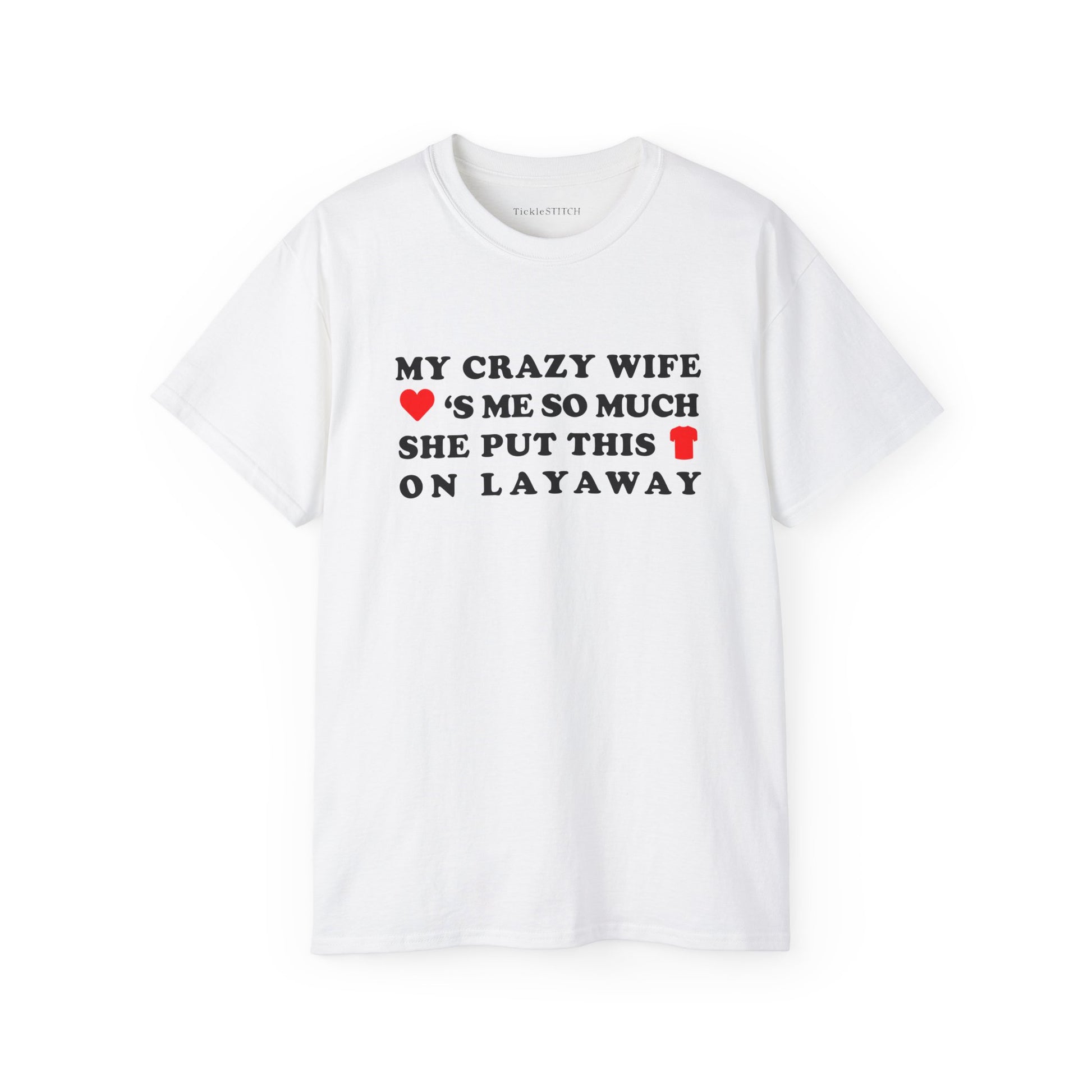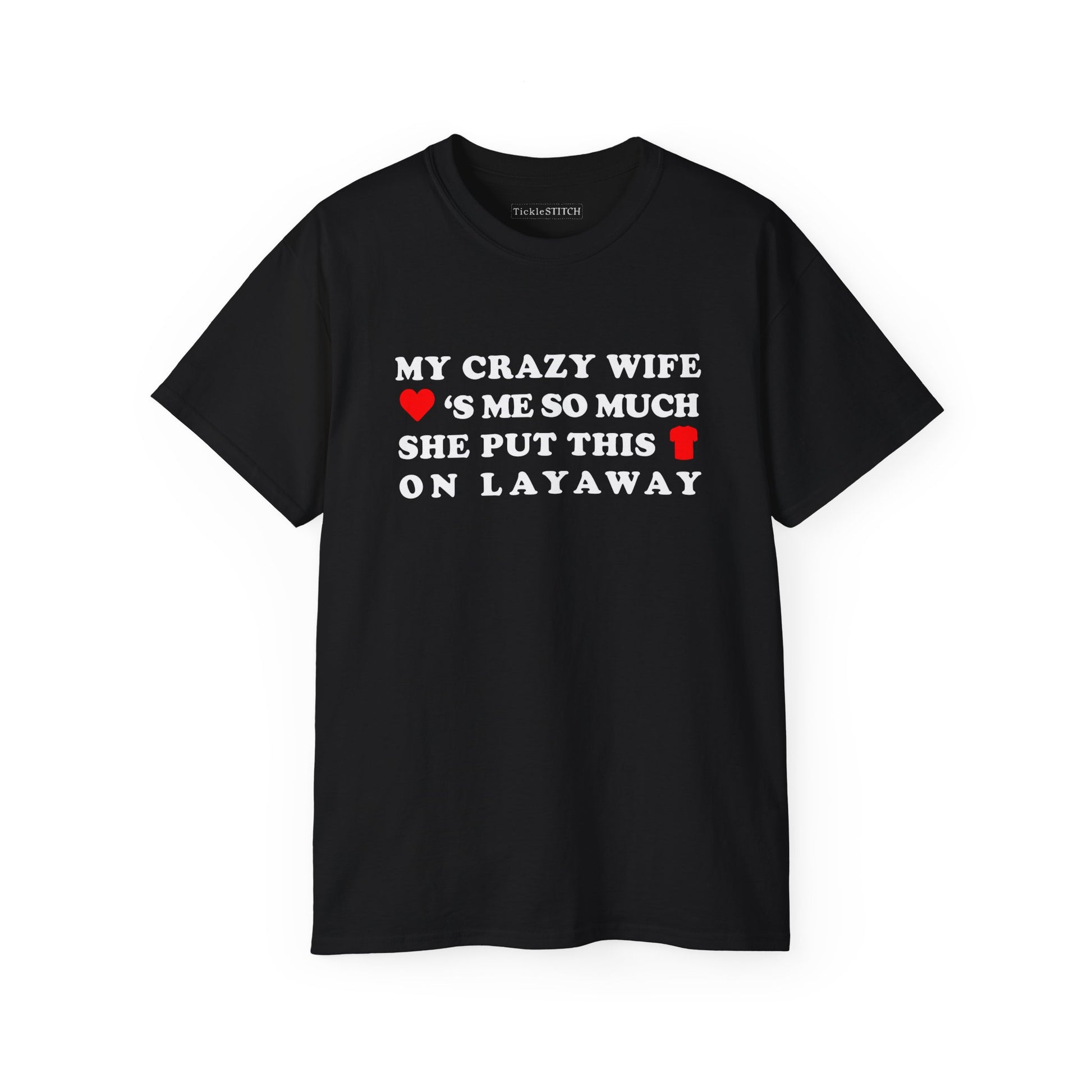 Crafted for comfort and style, this unique graphic tee is a fantastic addition to any wardrobe looking for 'funny tees' that stand out. Celebrate the love, the laughs, and the occasional 'wife layaway' with this must-have husband gift. Get yours today and let the world know your 'crazy wife loves me' in the most unforgettable way!
