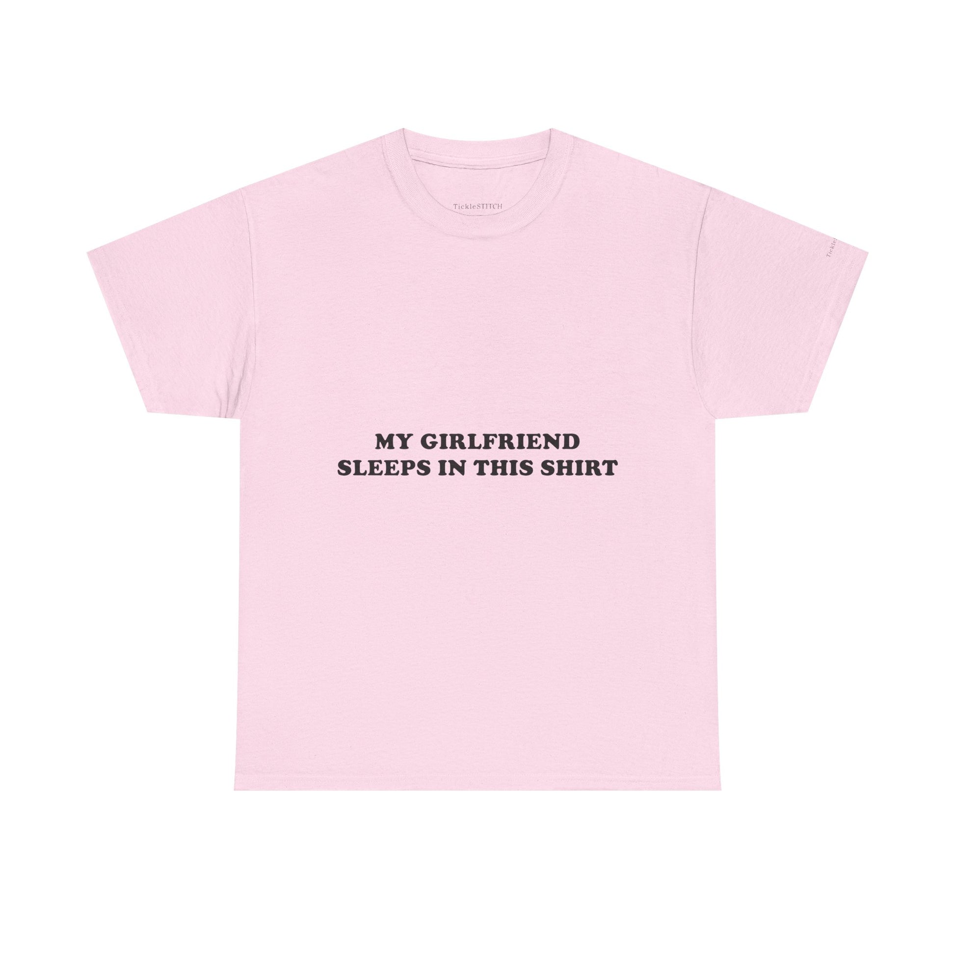 The design speaks to the cozy relationship, the girlfriend comfort, and the intimate humor that makes every couple's journey special Show off this fun statement piece and let everyone know whose shirt truly belongs to her now, adding a touch of playful charm to your everyday life and celebrating the unique comfort of sleeping to
