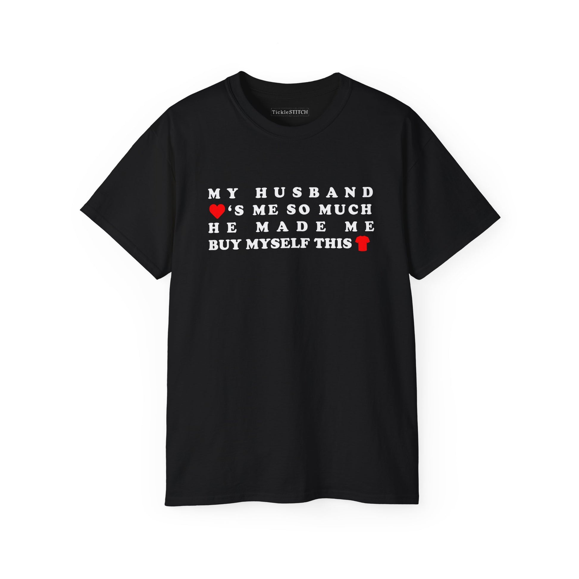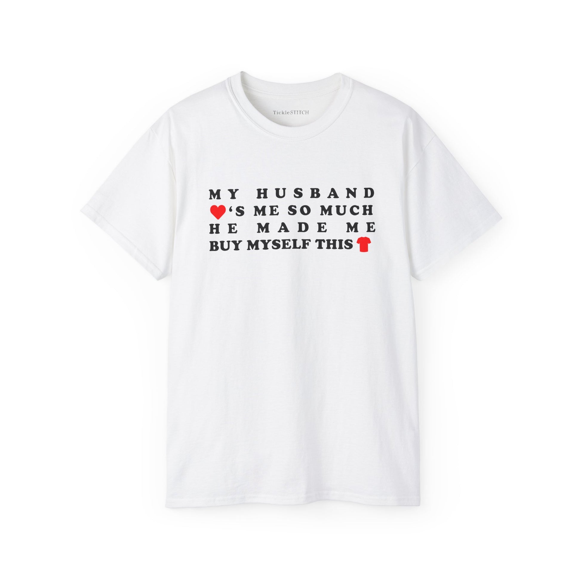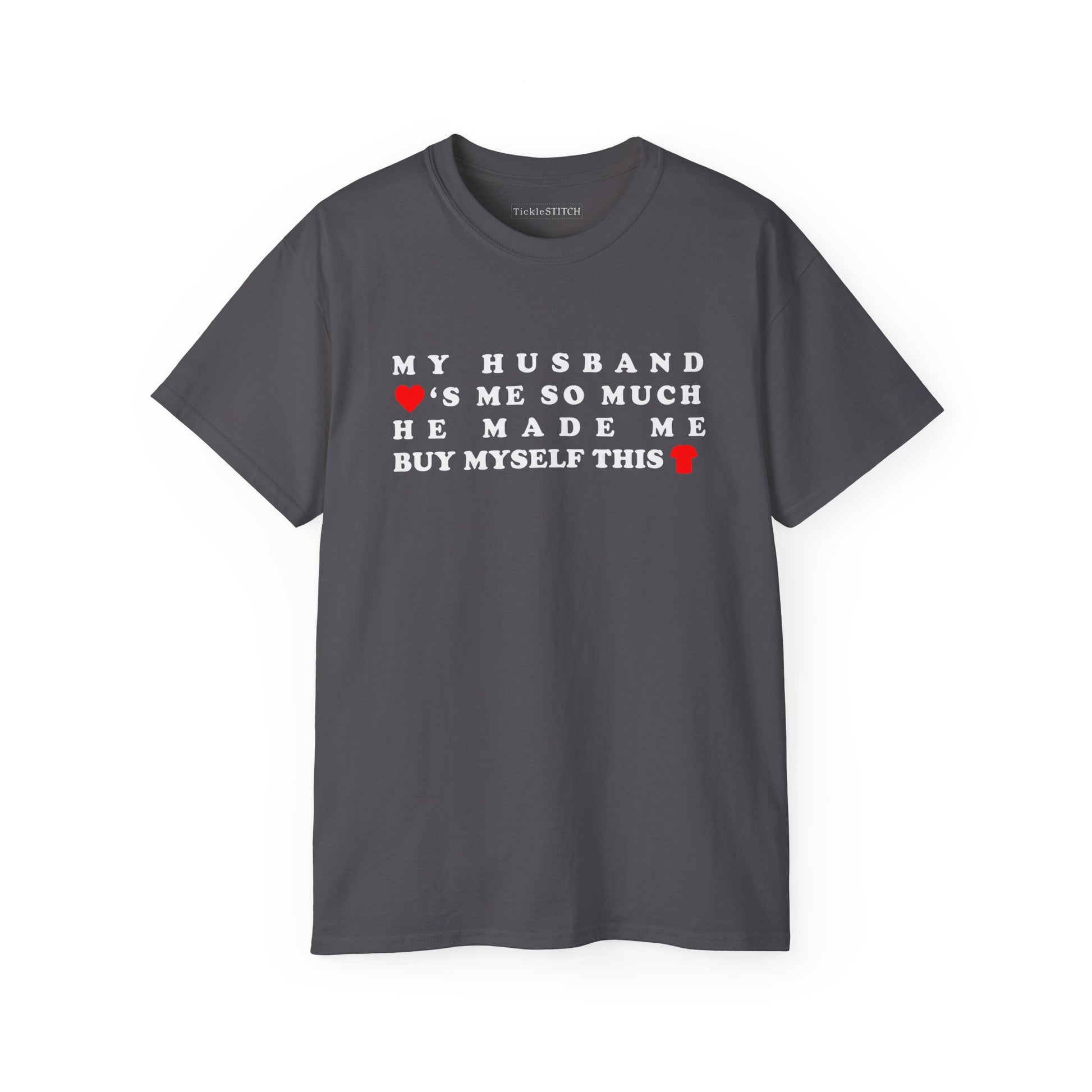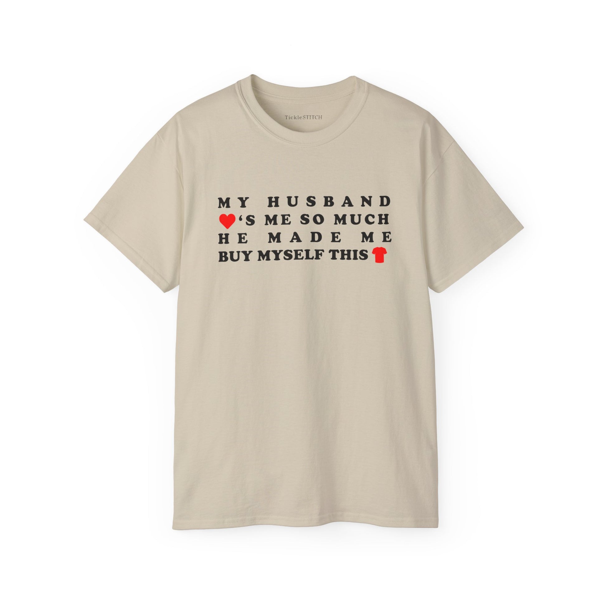 Let the world know who's really in charge (of the shopping list!) with our hilarious 'My Husband Loves Me So Much He Made Me Buy Myself This Shirt' women's funny t-shirt. This sarcastic graphic tee perfectly captures the playful reality of married life, offering a witty statement for every wife who's been 'encouraged' to treat herself. Designed for those who appreciate sharp humor and relatable marriage jokes, this shirt is more than just apparel—it's a conversation starter. Whether you're a proud 'trophy wife' or just a woman who loves a good laugh, this tee speaks volumes about marital bliss...
