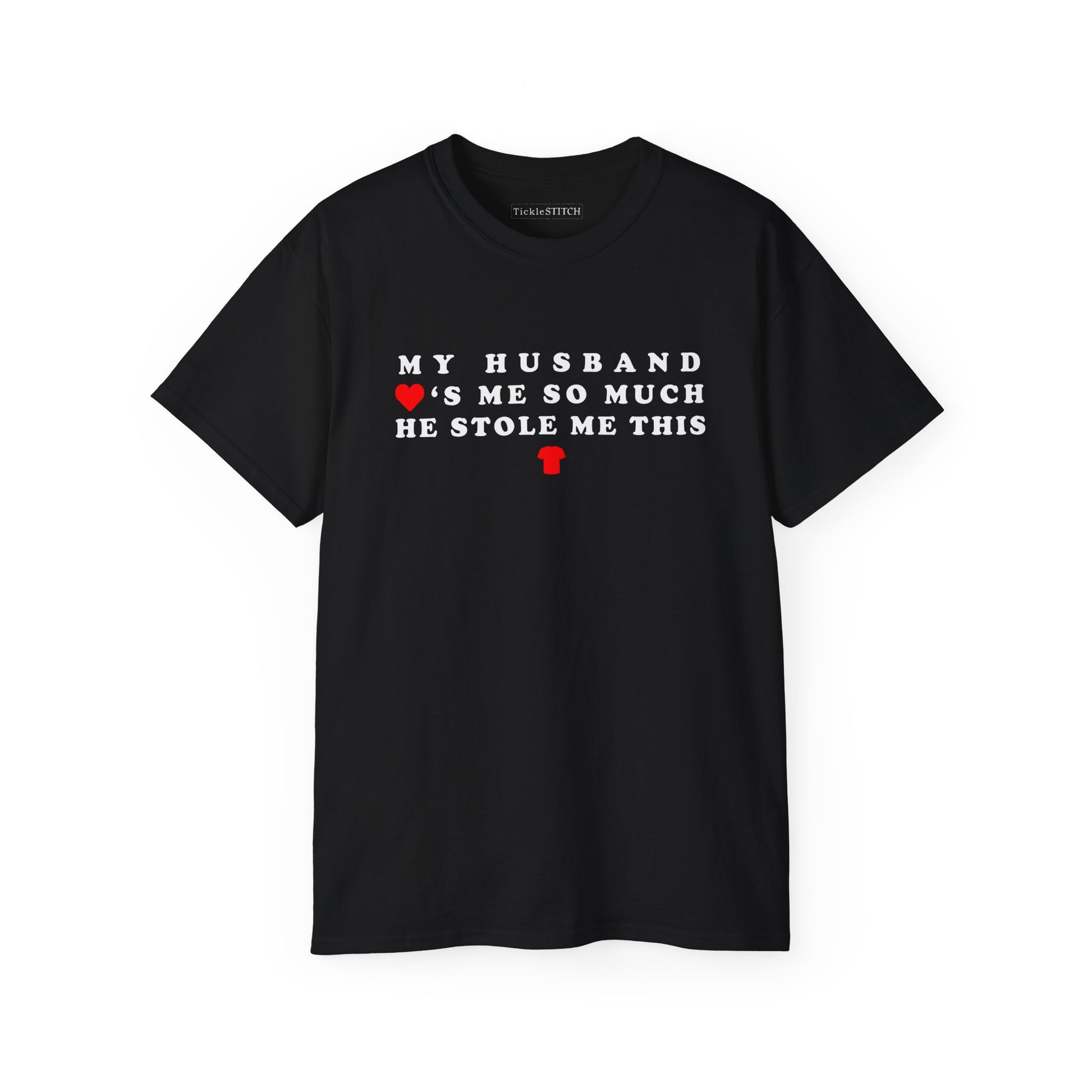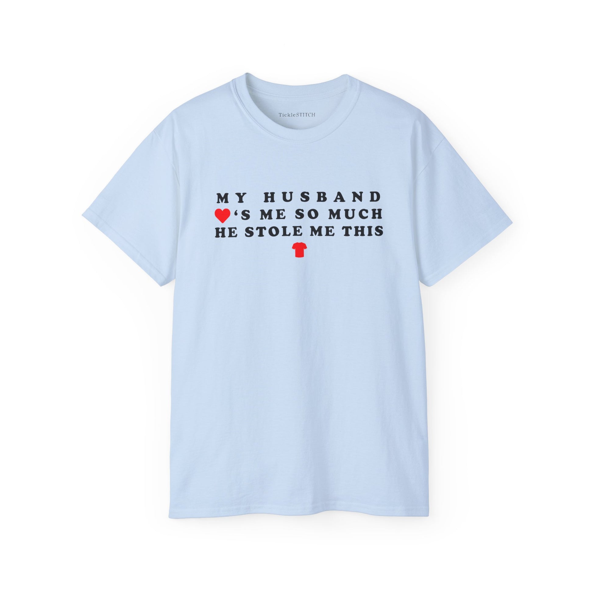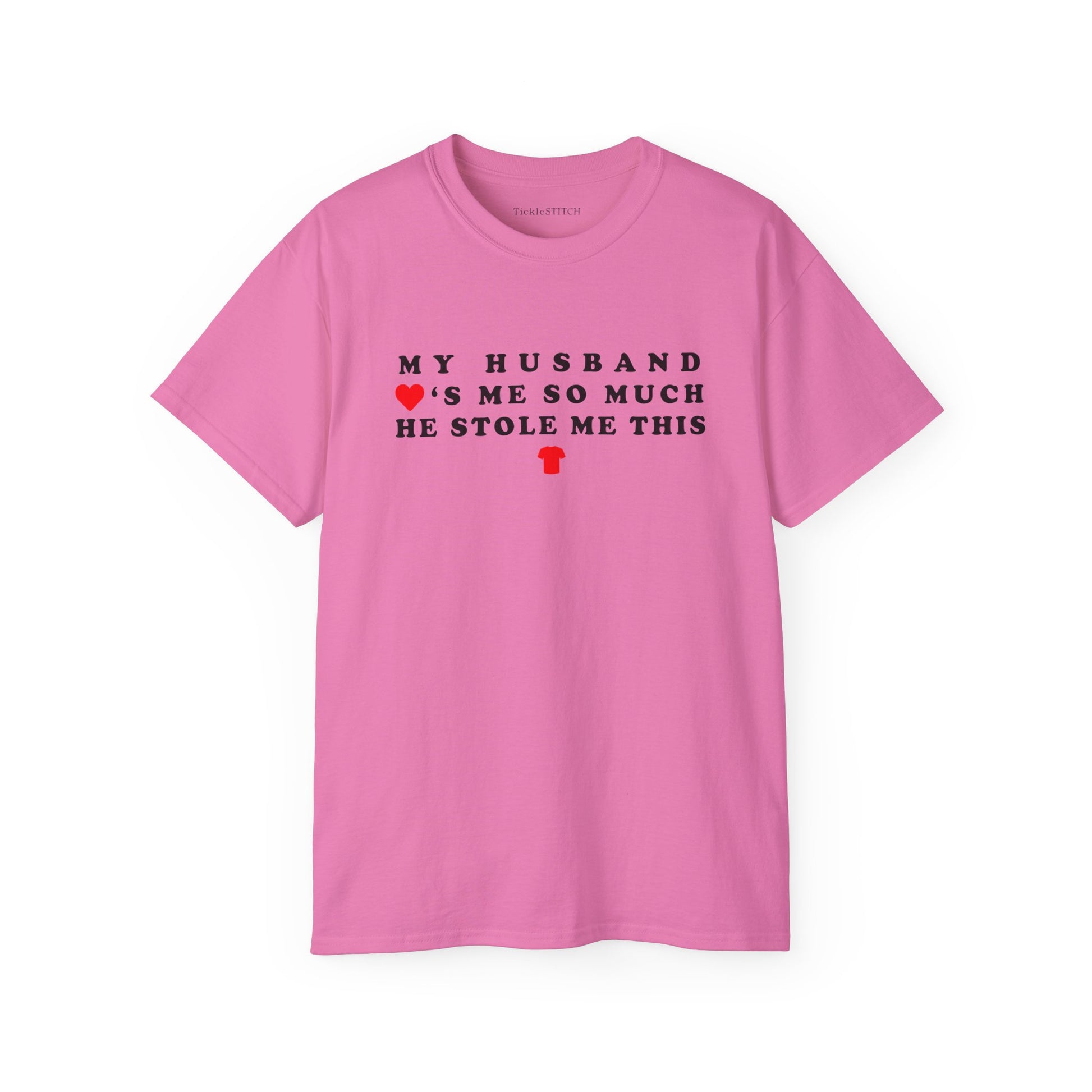 Get ready to share a laugh with our **Sarcastic 'My Husband Loves Me So Much He Stole Me This Shirt' Graphic Tee!** This witty **funny t-shirt** is the ultimate statement piece for any wife who knows the unique brand of affection (and sometimes playful mischief) that comes with married life. Featuring a clever design, this **humor t-shirt** perfectly captures that feeling when your partner's love knows no bounds – even if it means 'acquiring' your favorite new top. It's a fantastic conversation starter, guaranteed to get smiles and knowing nods from anyone who understands **marriage humor** and the hilarious antics of a loving spouse. Crafted for comfort and style, this **women's t-shirt** is more than just apparel; it's a testament to your special bond and a nod to **married life humor**.