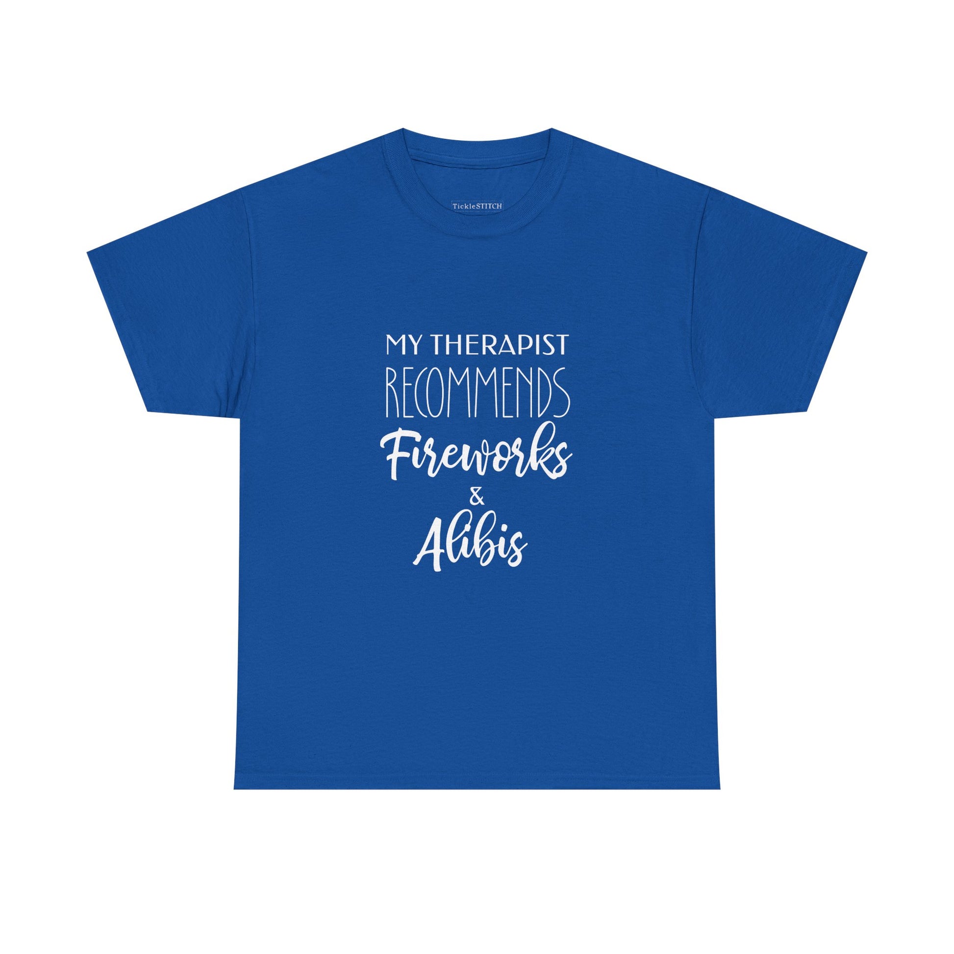Unleash your inner rebel this Independence Day with our 'My Therapist Recommends Fireworks and Alibis' shirt, perfect for anyone whose therapist offers unconventional advice for the Fourth of July. This humorous tee captures the spirit of mischievous patriotism, blending the thrill of fireworks with the necessity of a good alibi. It's an ideal choice for those who appreciate a bit of trouble and shenanigans during their celebrations, offering a witty nod to therapist bad advice and an escape plan for any independence mischief. Whether you're planning some patriotic alibis or just enjoying the fireworks trouble humor, this shirt is a conversation starter. Celebrate July 4th with a dash of humor and a whole lot of fun, embracing the playful side of independence trouble and therapy mischief humor. This unique design is sure to get laughs and spark discussions about the best alibi advice for your festive adventures, making it the ultimate statement piece for your summer gatherings.