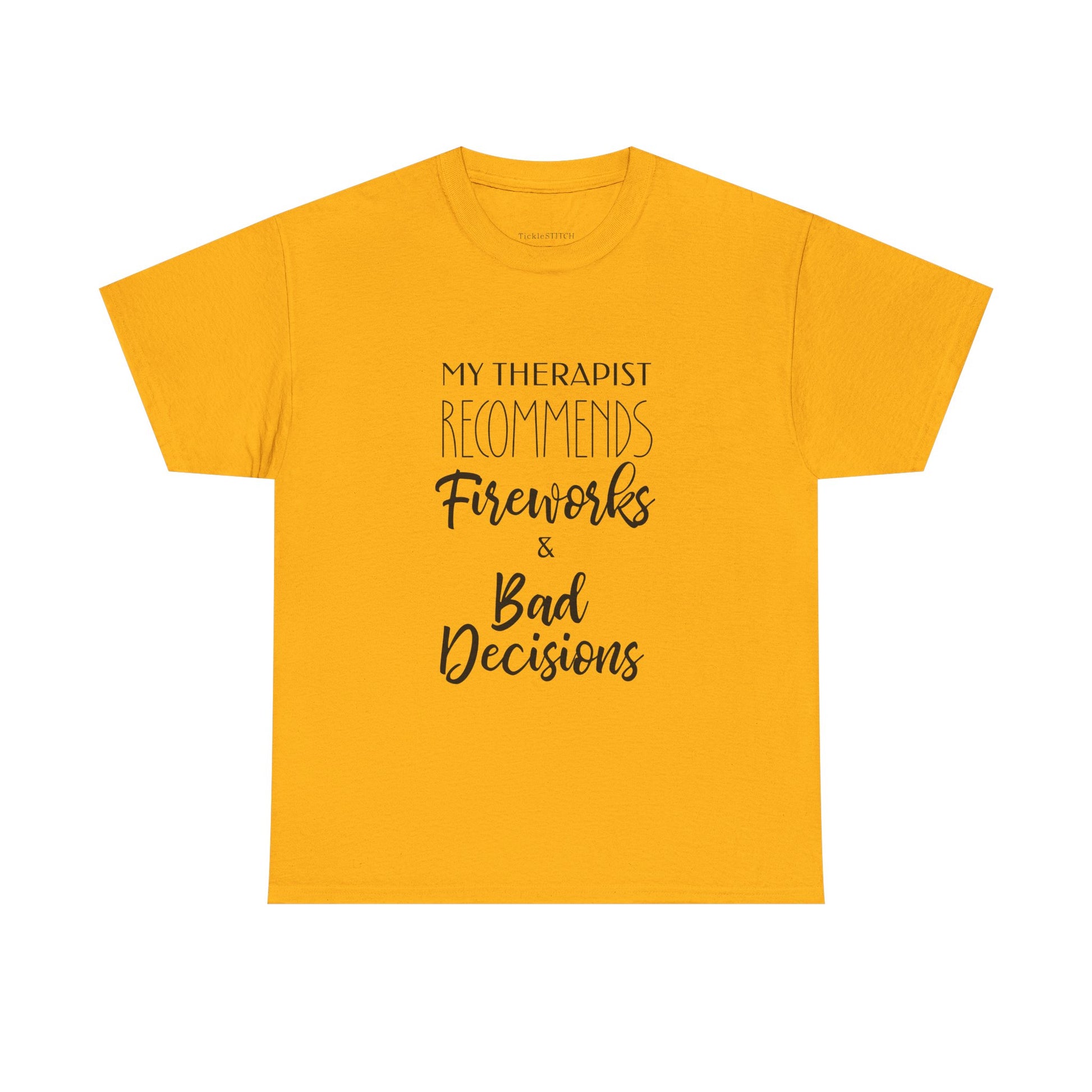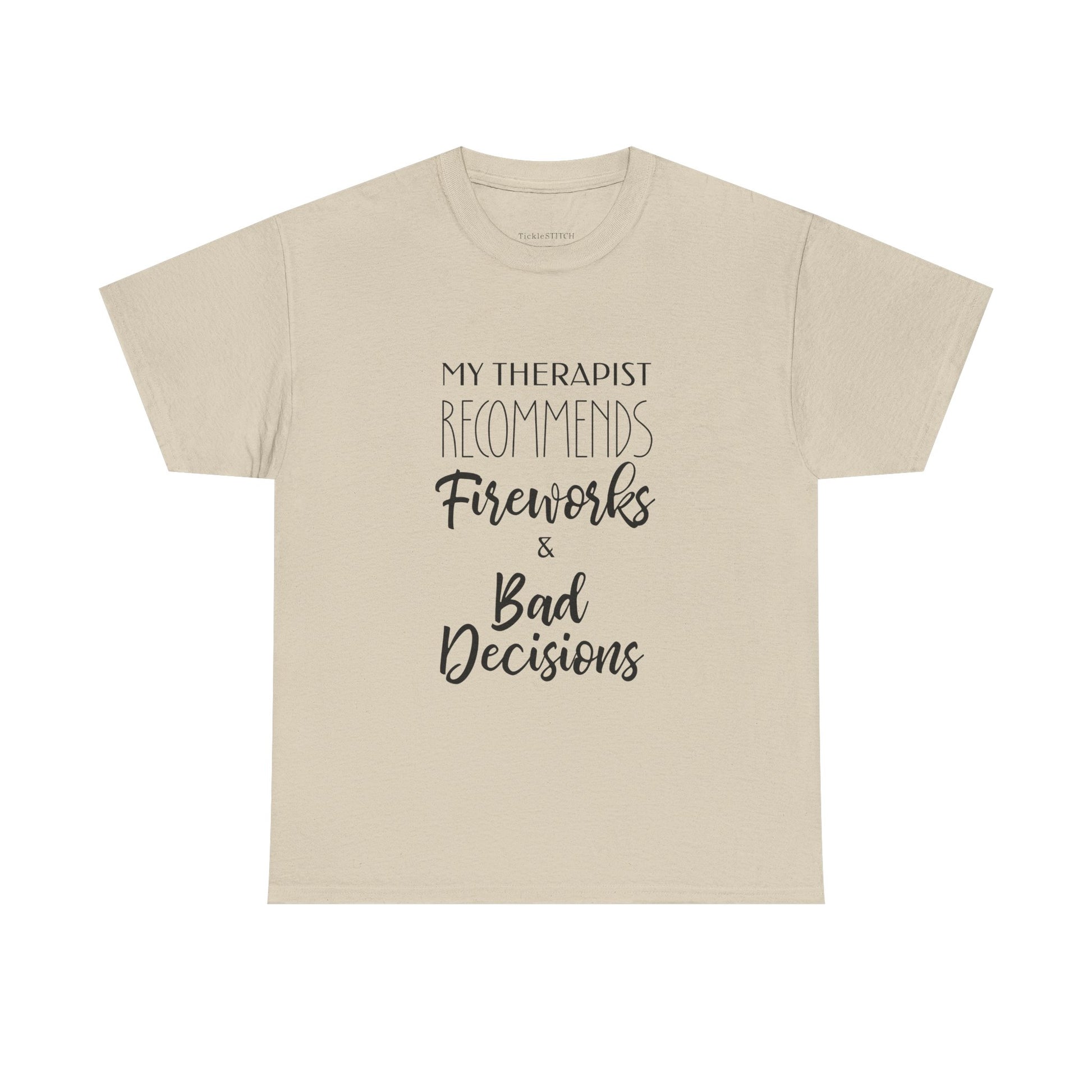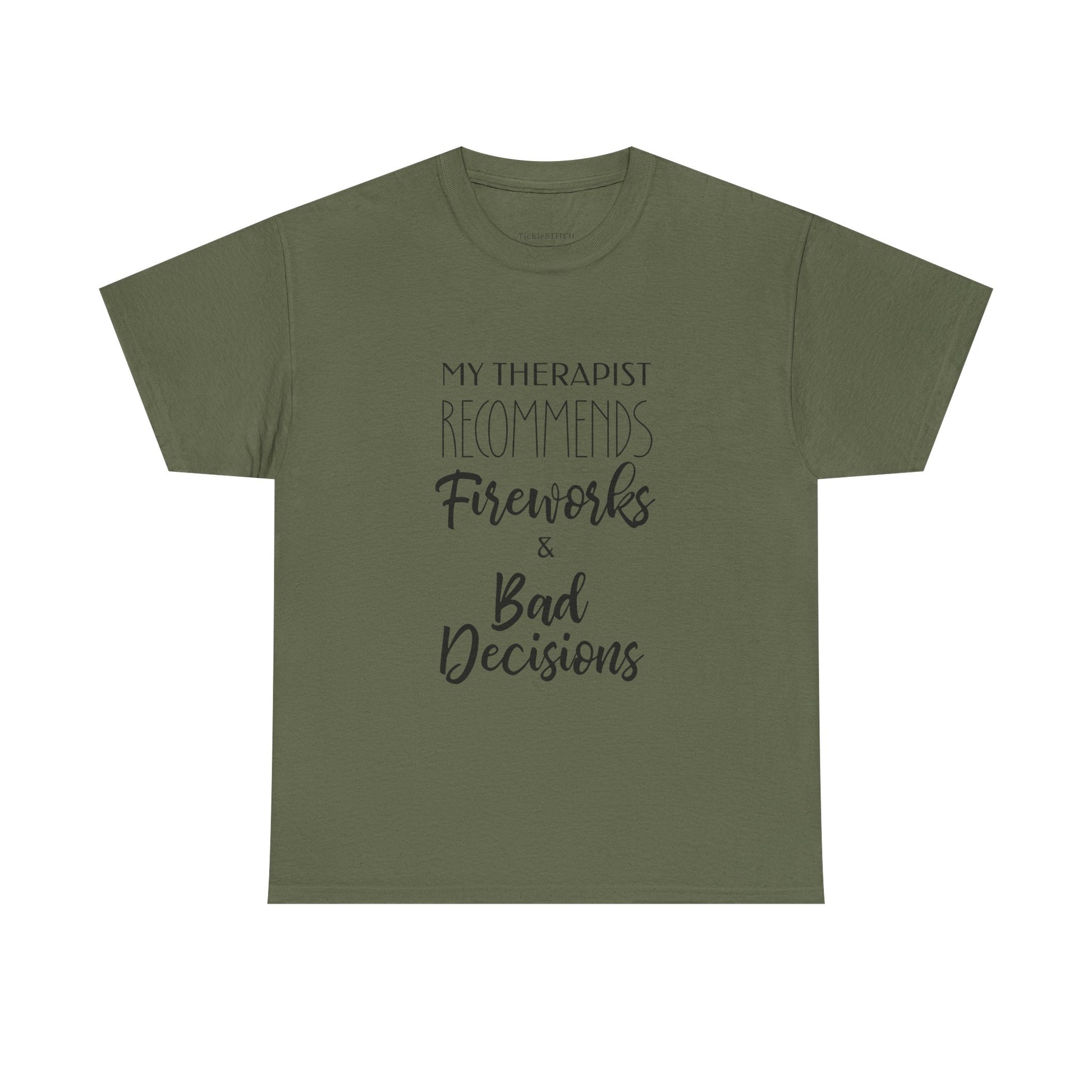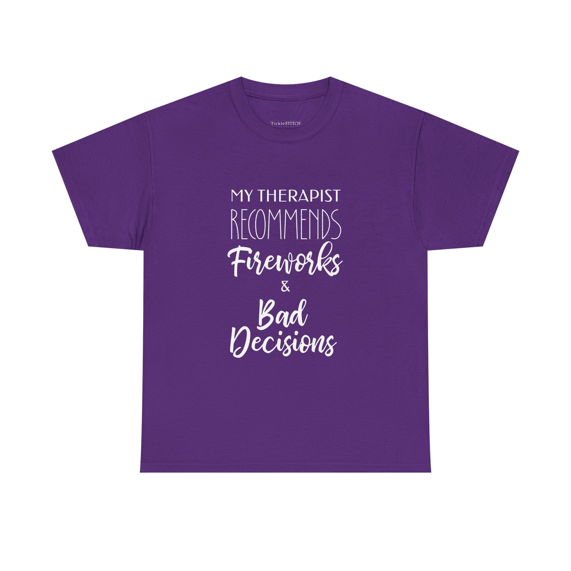 Inject some rebellious humor into your wardrobe with our 'My Therapist Recommends Fireworks and Bad Decisions' tee. Perfect for those who appreciate a touch of sarcastic wit and a dash of poor judgment, this shirt is a hilarious nod to questionable advice and the thrill of independence. Whether you're celebrating the Fourth of July with some truly bad choices or just embracing a general spirit of reckless humor, this tee is designed to spark conversations and laughter. It's an ideal gift for anyone who's ever received therapist bad advice or simply enjoys the chaos of fireworks and the freedom to make their own mistakes. This patriotic bad choices shirt captures the essence of July 4th mistakes and the fun of embracing your inner rebel, making it a standout piece for any casual occasion. Show off your unique sense of humor and your willingness to follow even the most irresponsible advice with this fun and memorable design, perfect for those who find humor in therapist poor choices and the joy of a little bad judgment.