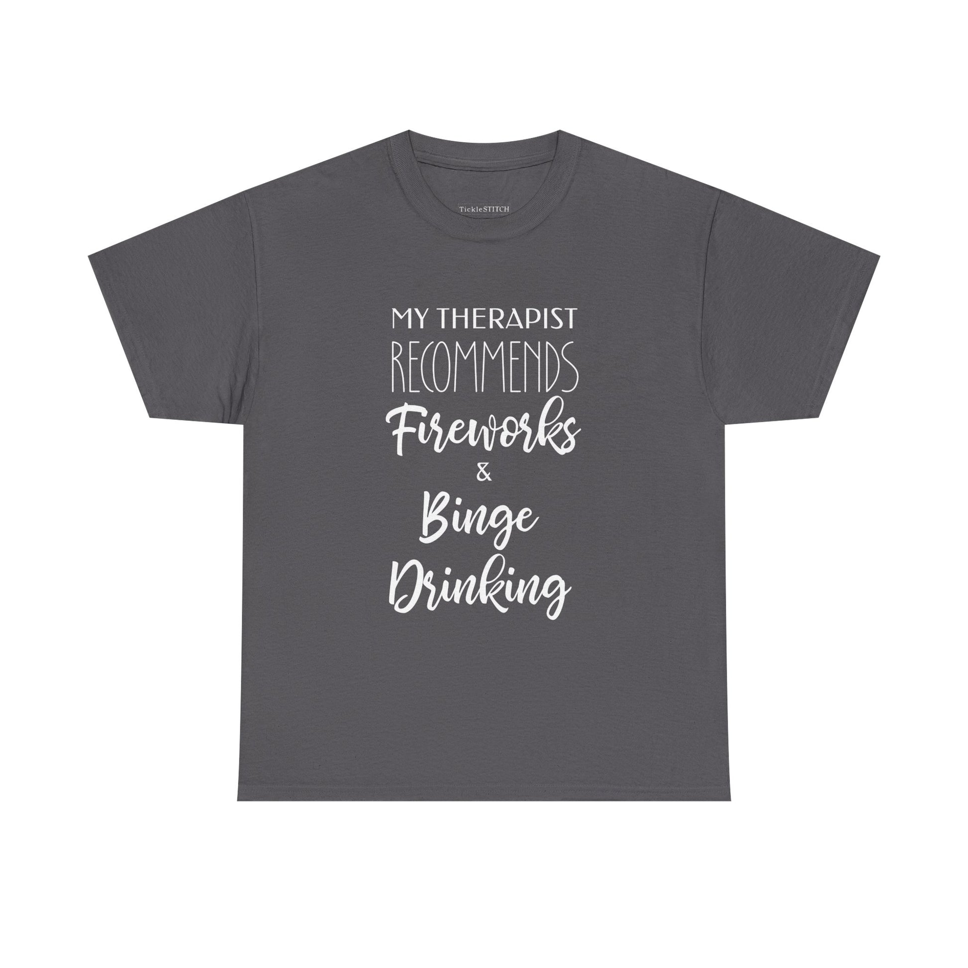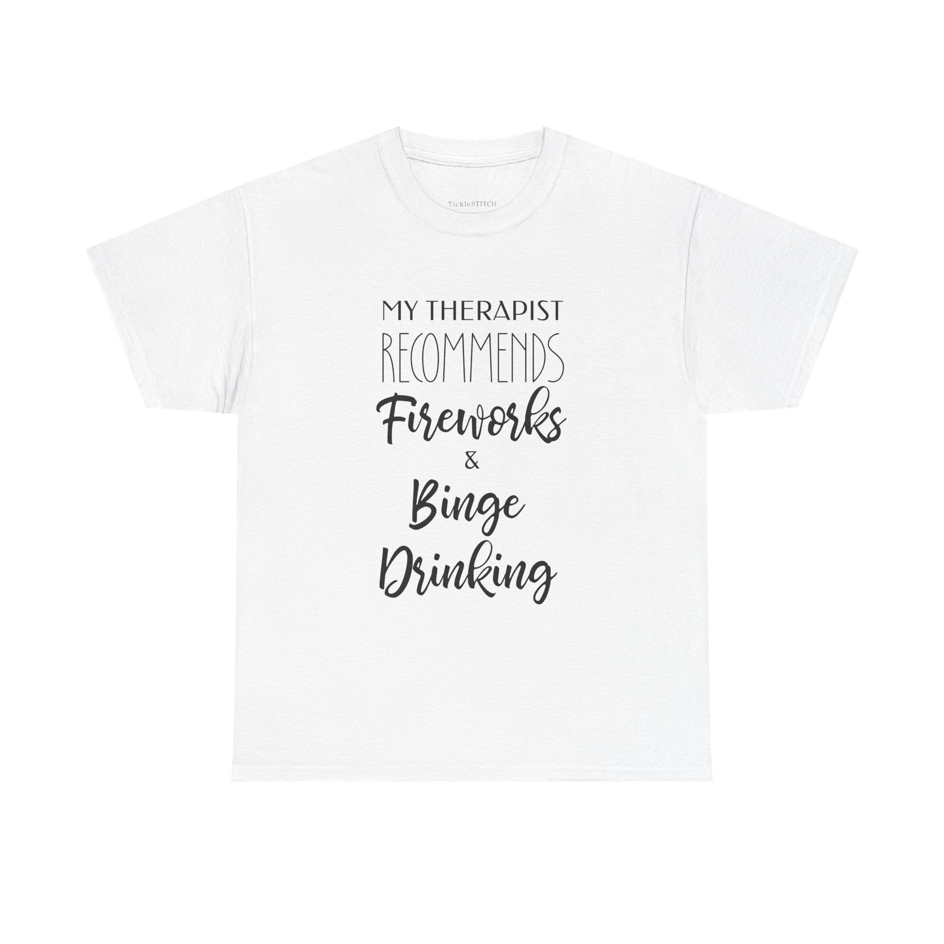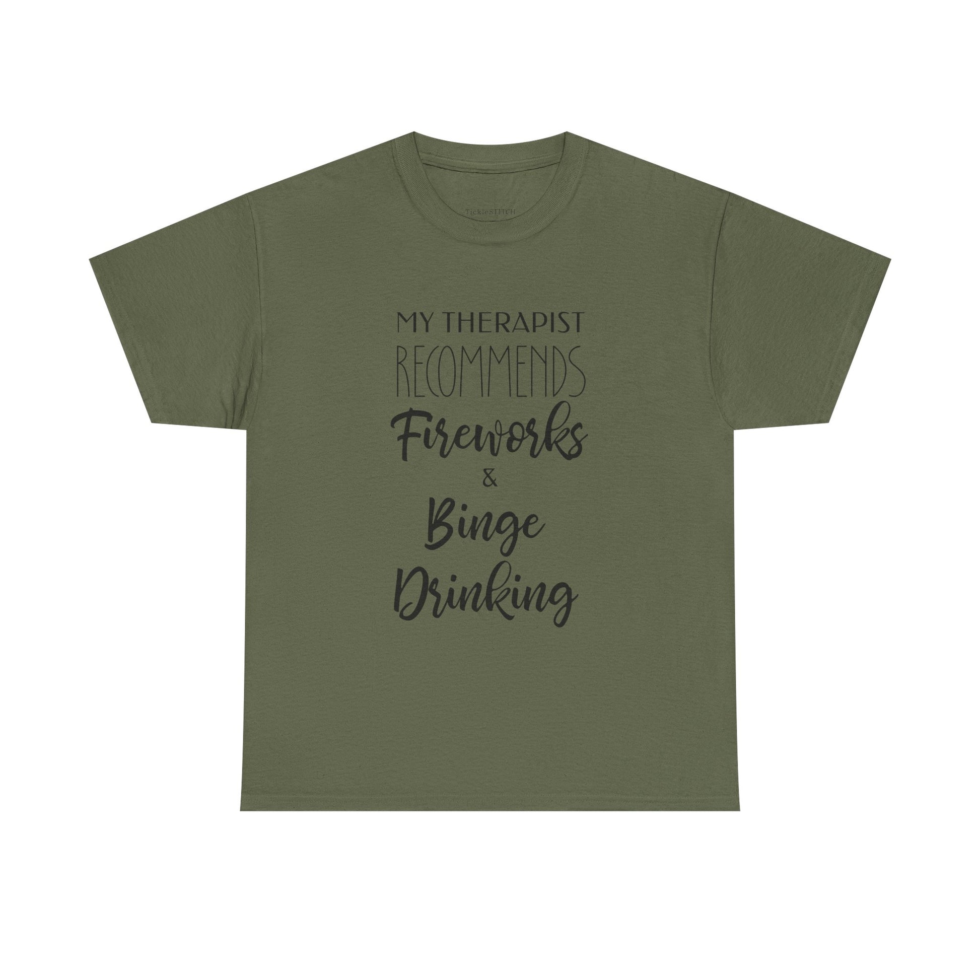 Unpack the humor of holiday coping with our 'My Therapist Recommends Fireworks and Binge Drinking' tee, a perfect blend of wit and relatable holiday stress. This shirt captures the essence of Fourth of July celebrations, independence day therapy, and the humorous side of navigating festive occasions with a therapist's unique 'advice.' Ideal for those who appreciate patriotic therapy humor, this design is a nod to the often-unconventional recommendations we sometimes wish for during holiday drinking therapy or any high-energy celebration. Whether you're planning a quiet evening or a lively gathering, this tee sparks conversations and laughter, making it an excellent gift for friends, family, or anyone who finds joy in a good laugh about life's little ironies. It’s more than just a shirt; it’s a statement piece for anyone who’s ever felt the need for some fireworks and a little 'therapy' to get through the holiday season, embodying the spirit of fun and a touch of rebellious humor. Perfect for your next Fourth of July party or just a casual day out, it's a unique way to express your independence day spirit with a humorous twist.