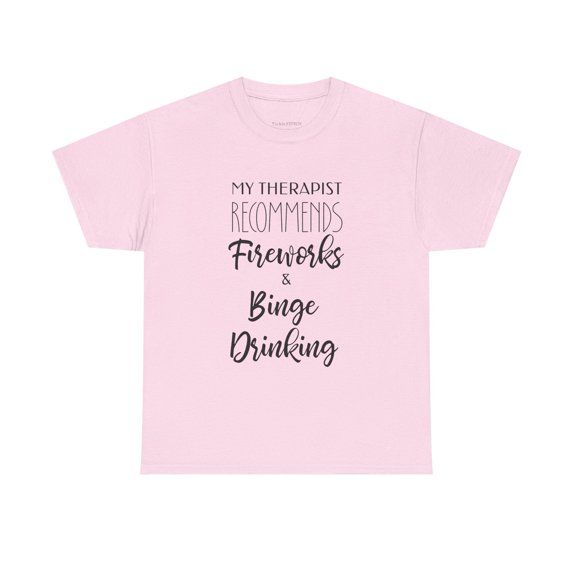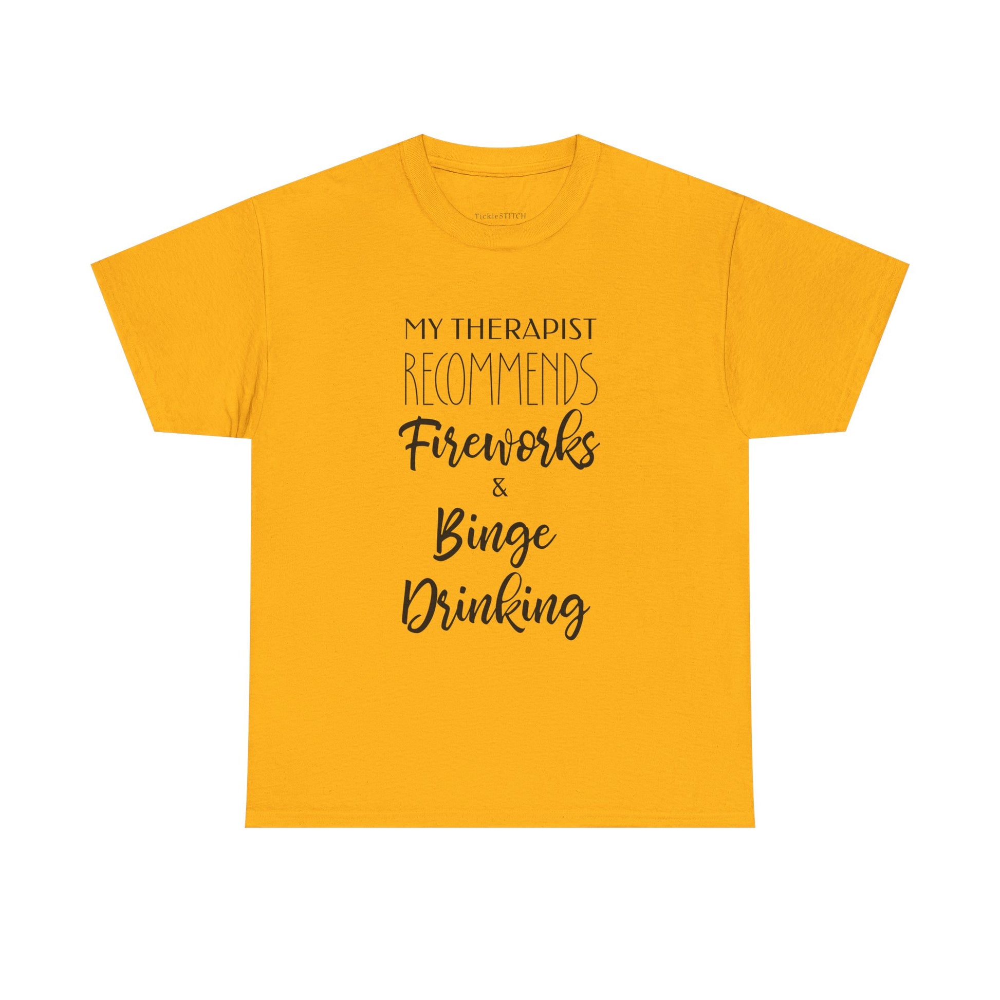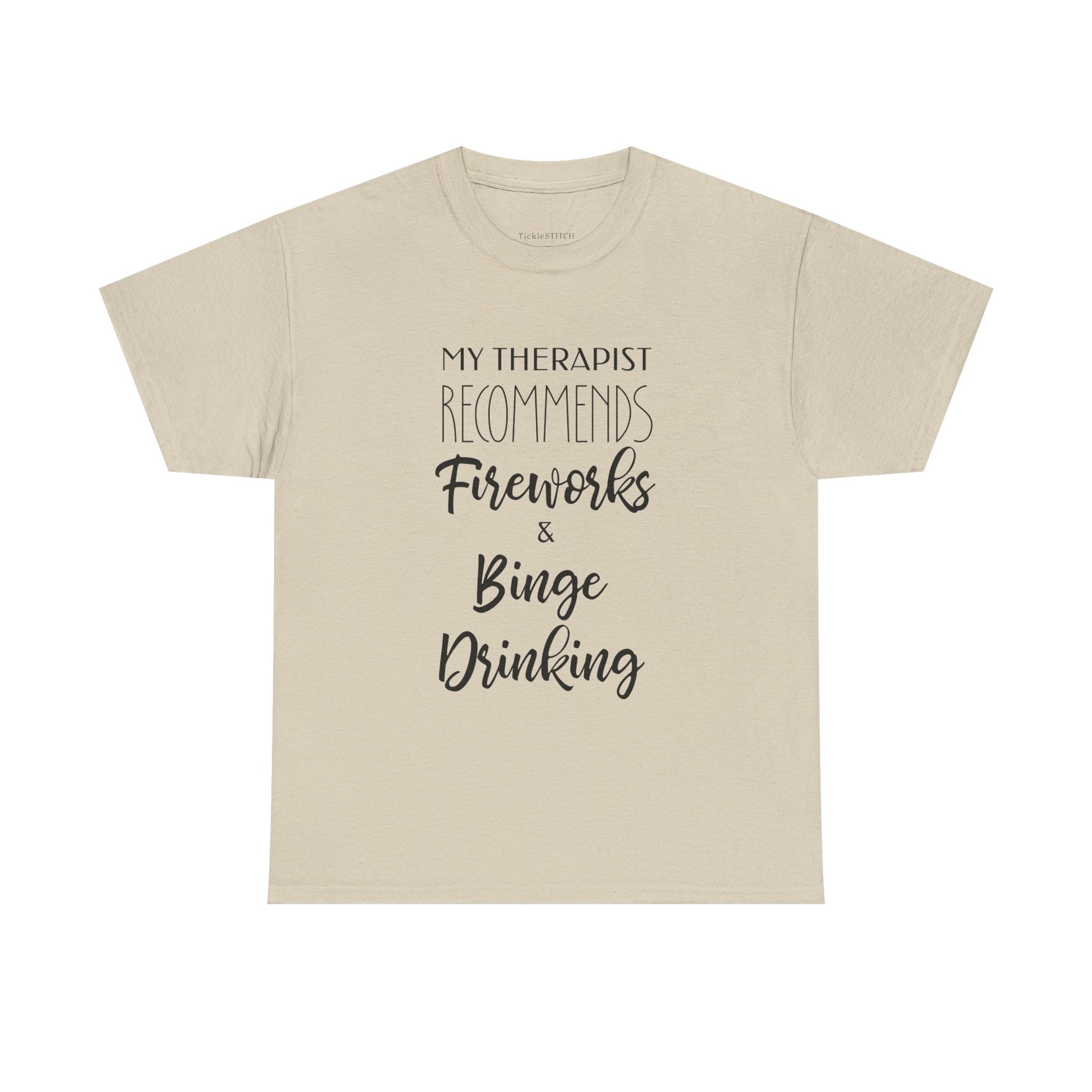 Unpack the humor of holiday coping with our 'My Therapist Recommends Fireworks and Binge Drinking' tee, a perfect blend of wit and relatable holiday stress. This shirt captures the essence of Fourth of July celebrations, independence day therapy, and the humorous side of navigating festive occasions with a therapist's unique 'advice.' Ideal for those who appreciate patriotic therapy humor, this design is a nod to the often-unconventional recommendations we sometimes wish for during holiday drinking therapy or any high-energy celebration. Whether you're planning a quiet evening or a lively gathering, this tee sparks conversations and laughter, making it an excellent gift for friends, family, or anyone who finds joy in a good laugh about life's little ironies. It’s more than just a shirt; it’s a statement piece for anyone who’s ever felt the need for some fireworks and a little 'therapy' to get through the holiday season, embodying the spirit of fun and a touch of rebellious humor. Perfect for your next Fourth of July party or just a casual day out, it's a unique way to express your independence day spirit with a humorous twist.