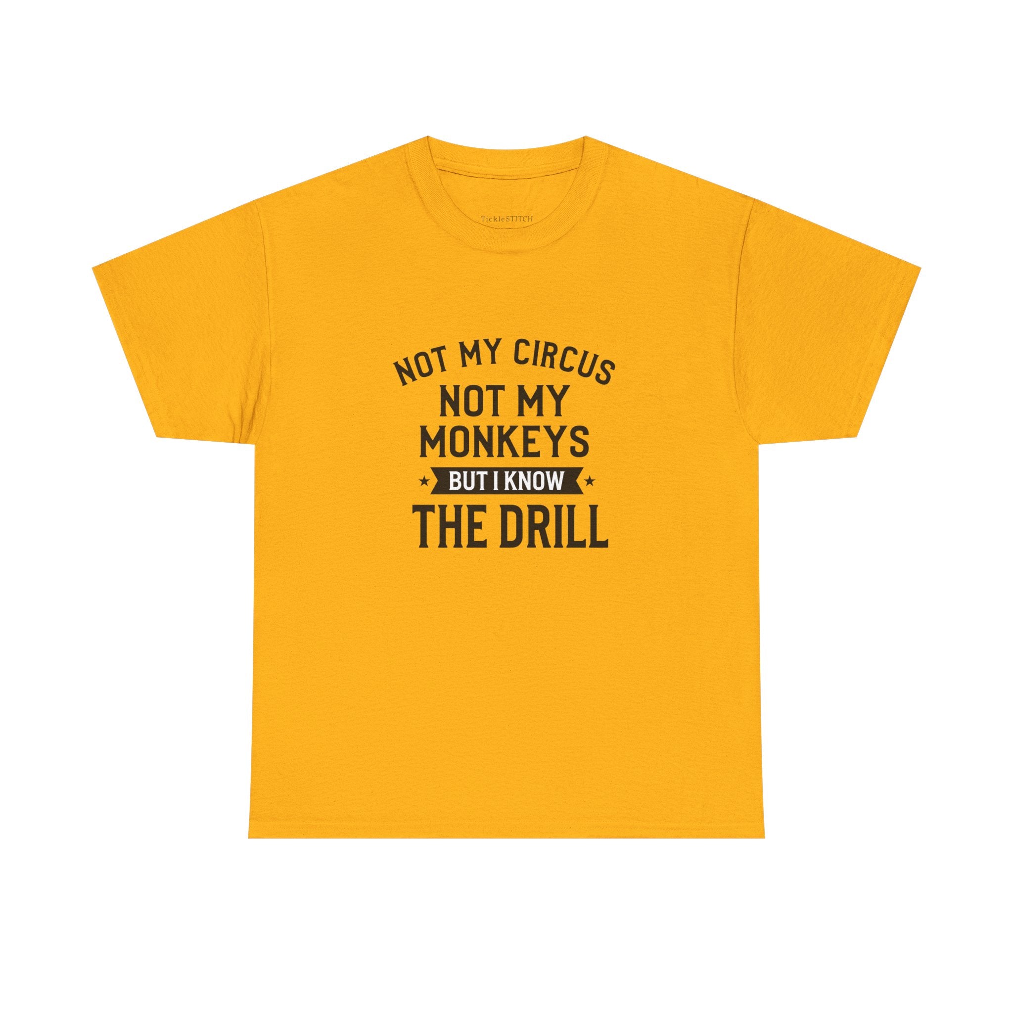 Inject some much-needed humor into your daily grind with our 'Not My Circus Not My Monkeys But I Know The Drill' sarcastic tee. This unisex graphic t-shirt perfectly captures that relatable work-life sentiment when you're an expert bystander to the same old drama, knowing exactly how things will unfold without being directly involved. Inspired by a classic Polish proverb, this statement shirt features a minimalist vector design with bold block lettering, reminiscent of vintage circus style and retro western woodblock typography. Its black and white graphic offers a timeless aesthetic, making it a versatile piece for any wardrobe. Ideal for irony lovers and those who appreciate witty quotes, this tee is more than just apparel; it's a declaration of mental health humor and minding your own business. It makes a fantastic corporate humor gift for coworkers, friends, or anyone who's 'been there, done that' and appreciates a snarky, trendy typography design. Show off your routine humor and embrace the expert bystander role with this unique and comfortable sarcastic office tee.
