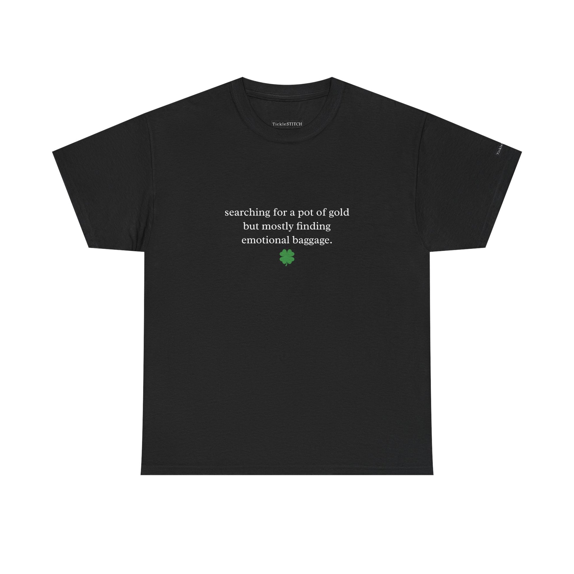 Embrace the true spirit of St Patrick's Day with this uniquely relatable graphic tee, perfect for anyone whose search for a pot of gold often leads to a bit of emotional baggage instead This witty shirt captures the humorous irony of life's struggles, blending the festive aesthetic of March 17th with a dash of self-deprecating honesty.