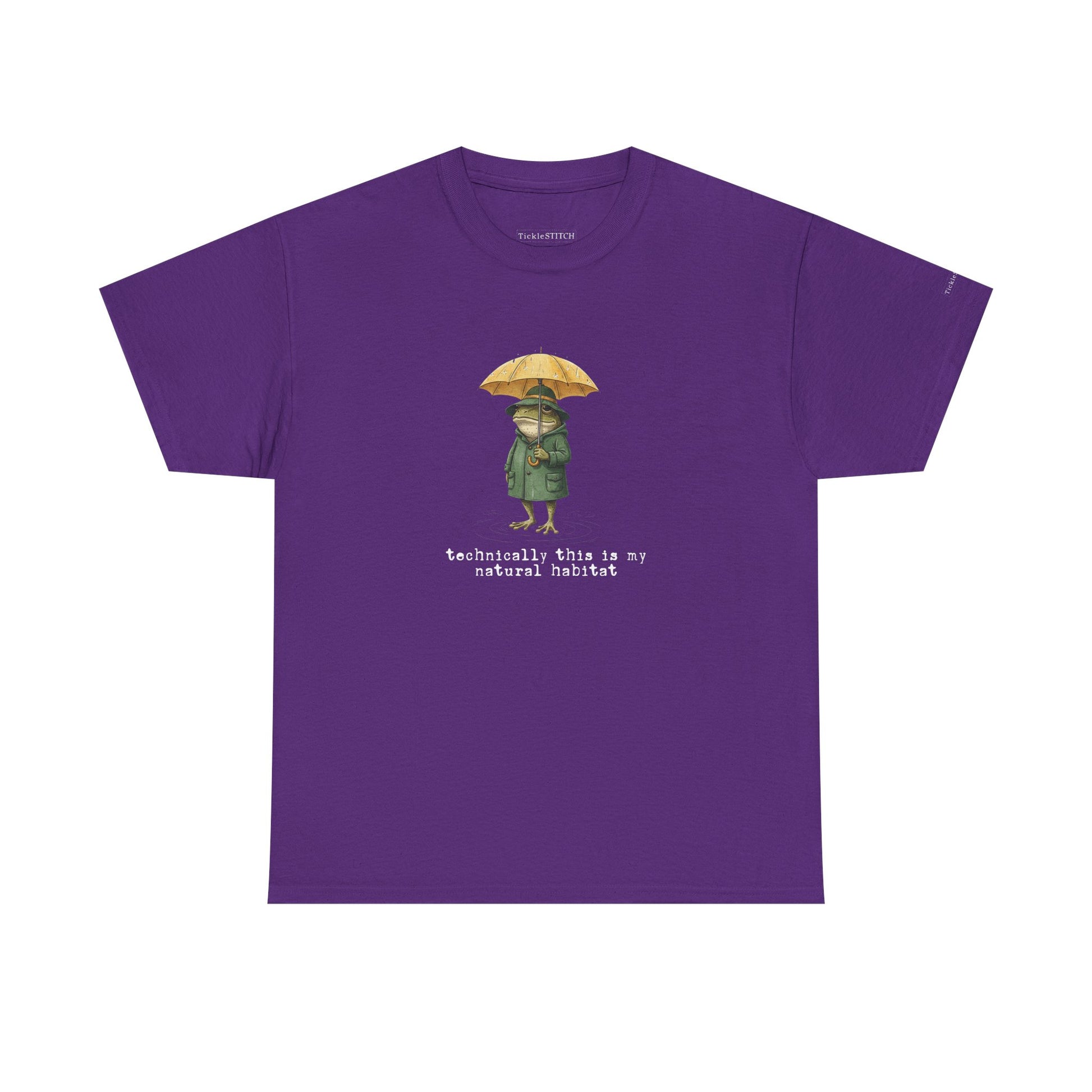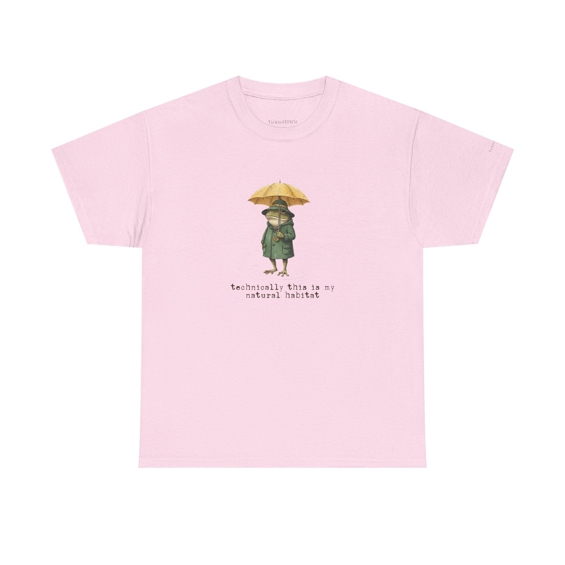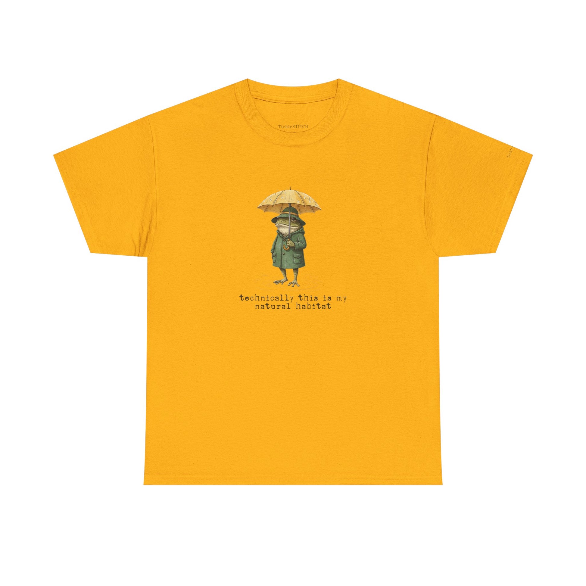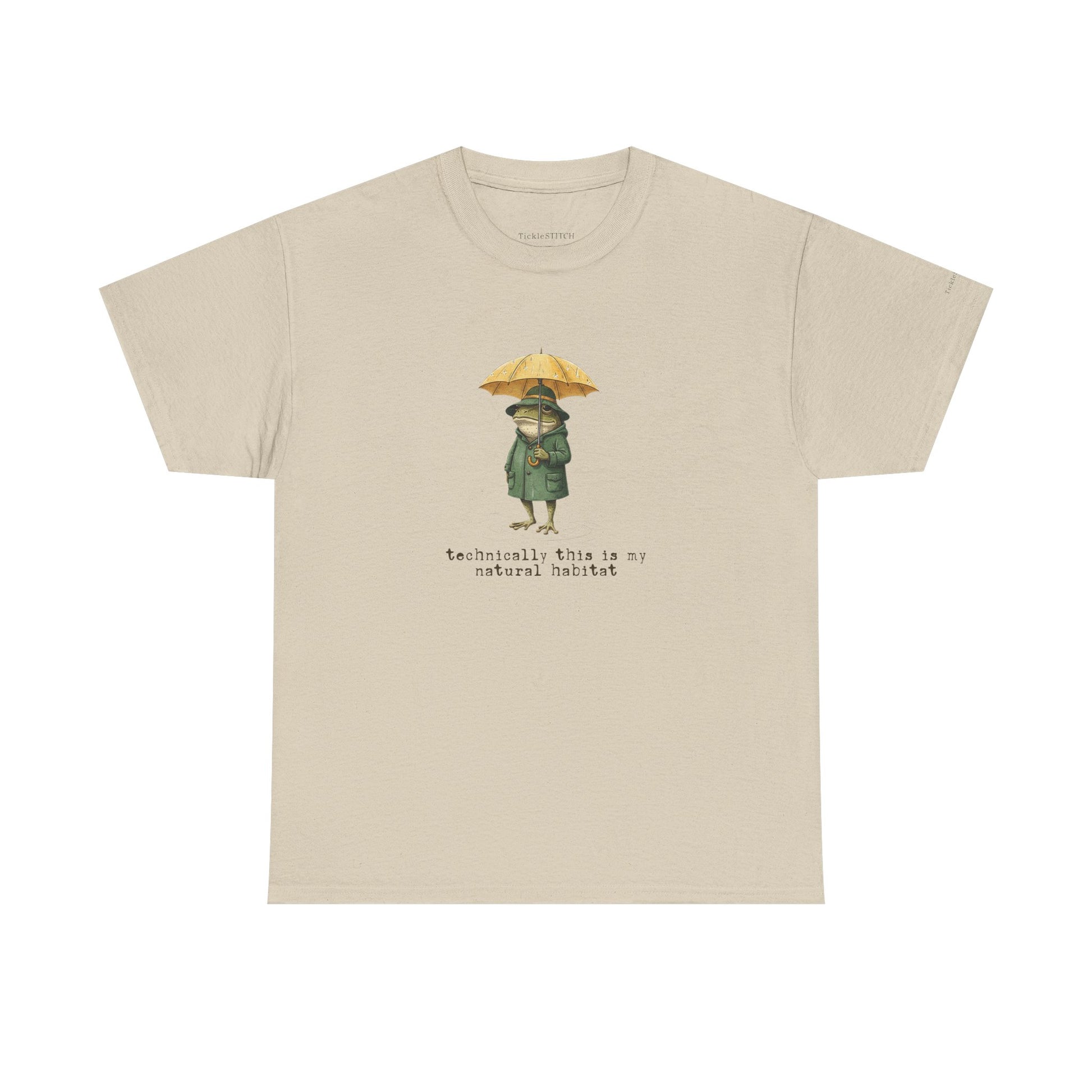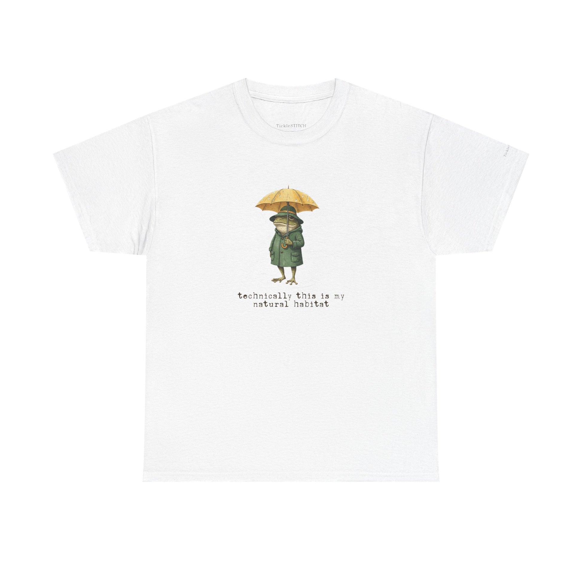 Immerse yourself in the witty world of amphibian irony with our "Technically, This Is My Natural Habitat" t-shirt, a must-have for biology humor enthusiasts and nature lovers. This unique graphic tee features a dapper frog, sporting a propeller hat and yellow umbrella, confidently navigating a rainy day puddle. The vintage-inspired, hand-drawn illustration captures a whimsical yet sarcastic mood, showcasing a detailed, anthropomorphic frog in a raincoat. It's an ideal gift for anyone who appreciates funny animal art, biological irony, or the cozy swamp aesthetic. Perfect for pluviophiles, cottagecore fans, or those who enjoy a clever biology pun, this shirt adds dapper style and witty nature humor to any wardrobe. Celebrate pond life and forest frogs with this quirky design, perfect for rainy day vibes and showcasing your love for the natural world with a playful twist. The cross-hatching sketch art style lends a classic naturalist appeal, making it a standout piece for unique wildlife art and a good laugh about one's own "natural habitat."